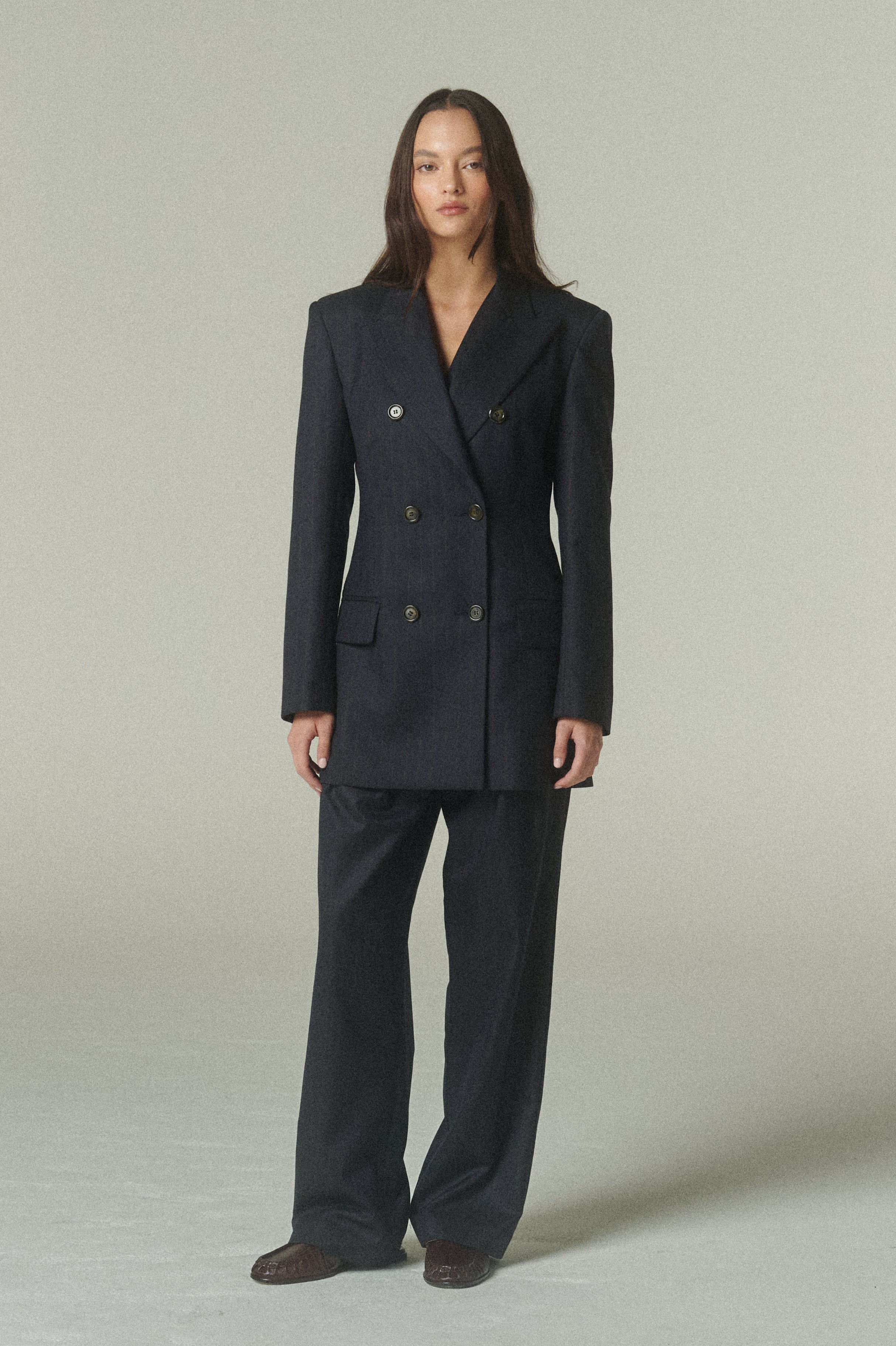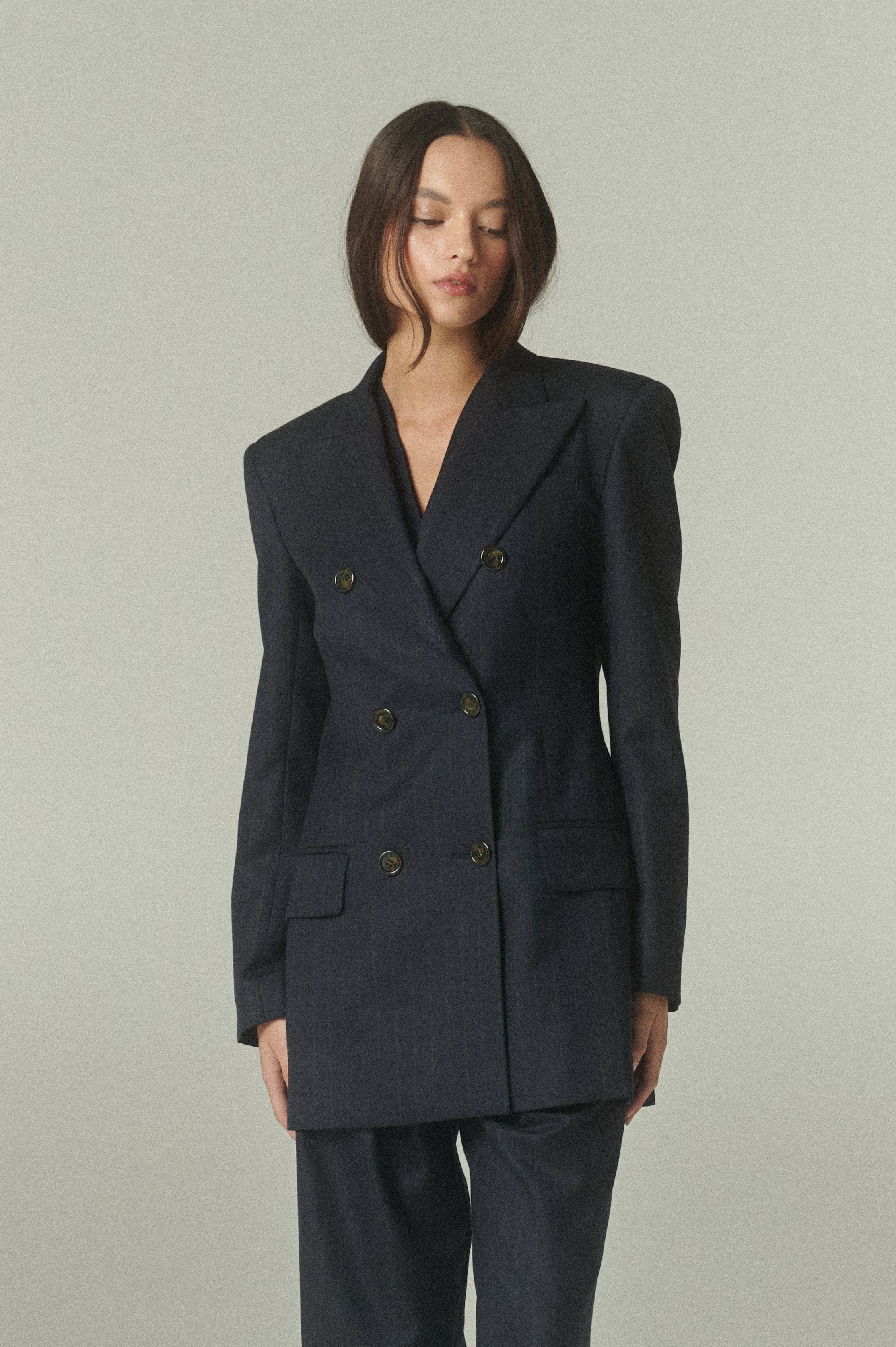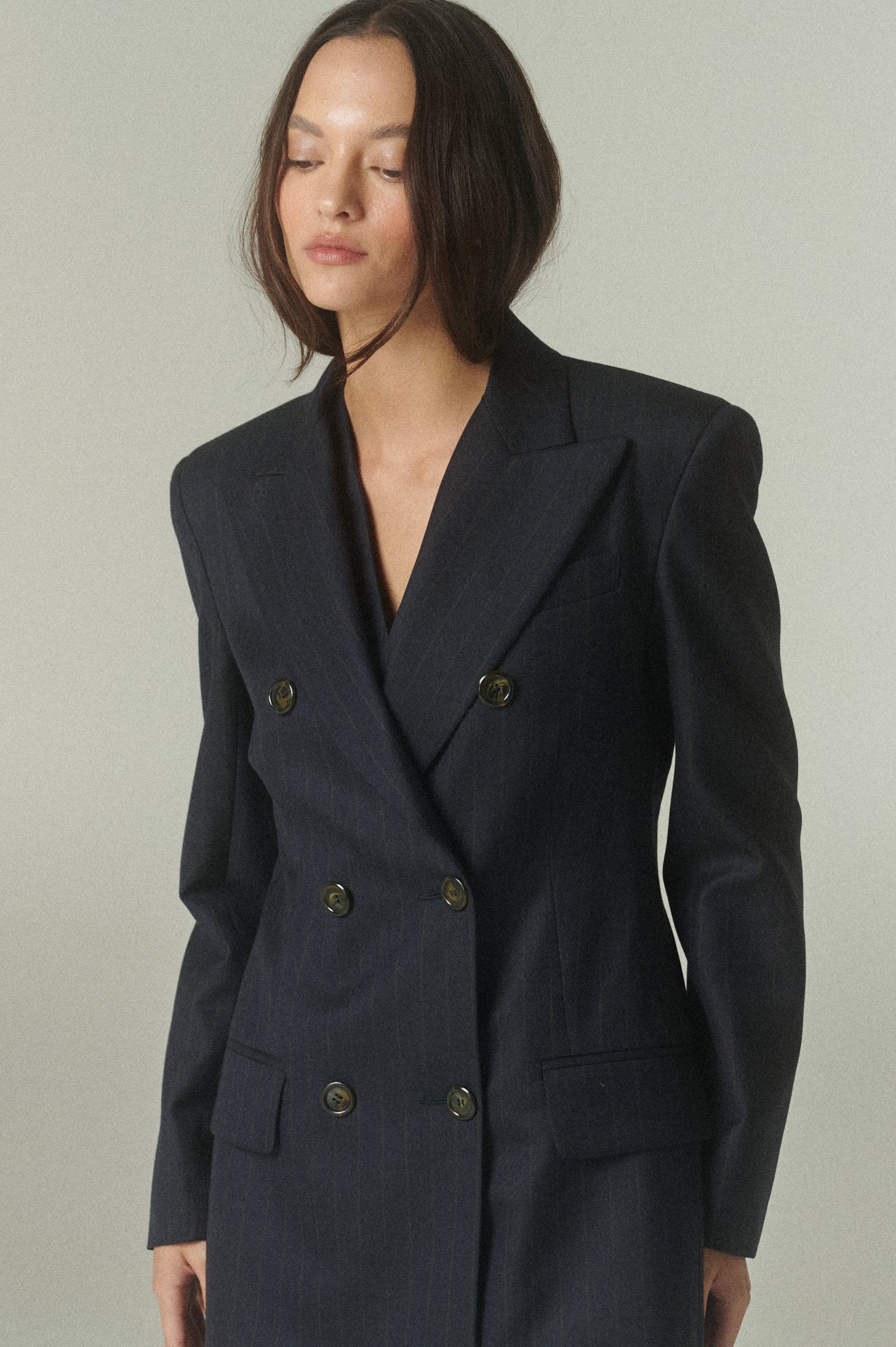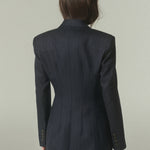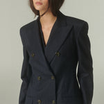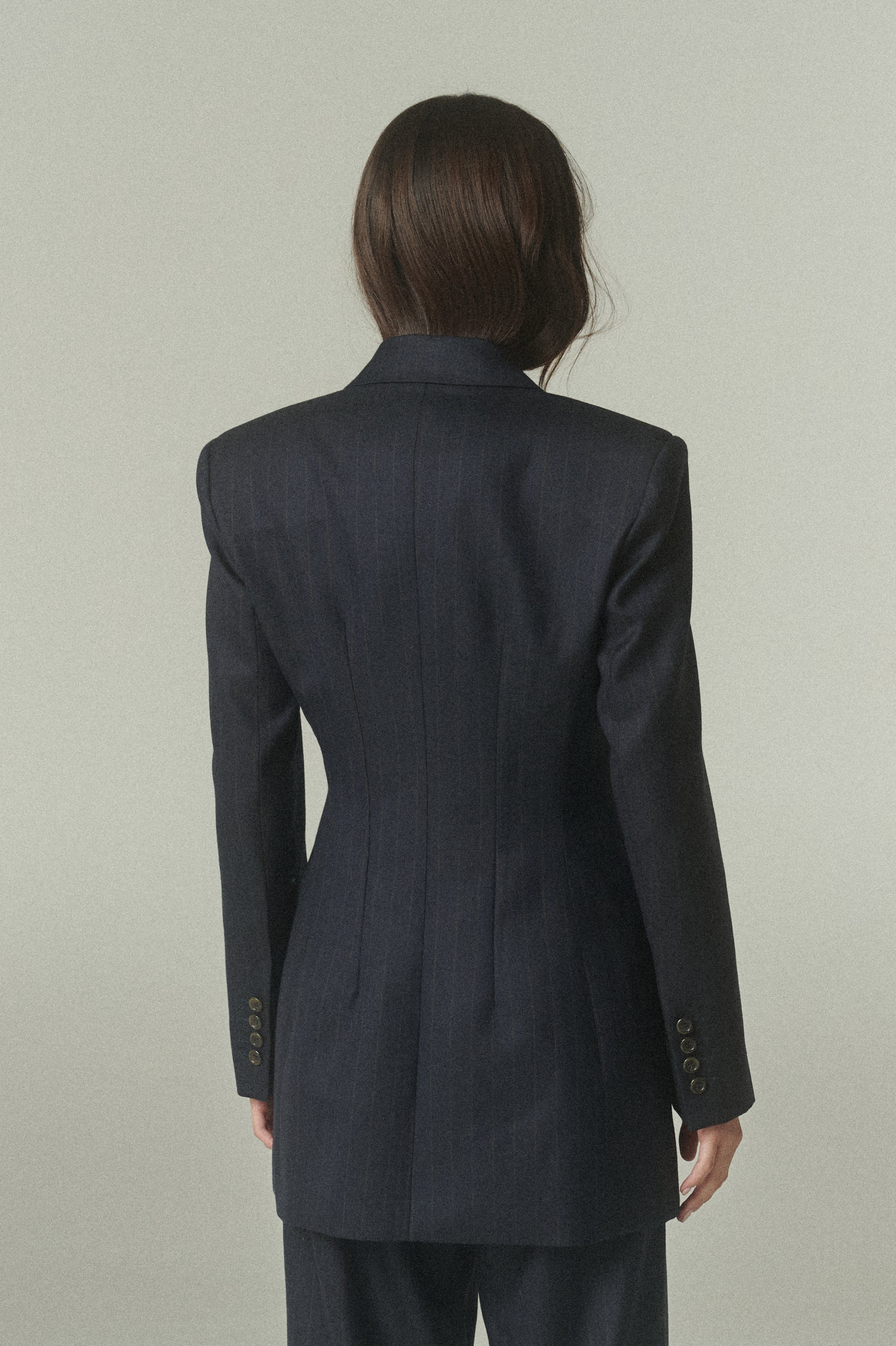 Su elegante color azul marino se acompaña de sutiles líneas color camel, que aportan profundidad, carácter y un toque de distinción. La figura es impecable: un blazer acinturado y cruzado, rematado con finos botones italianos.