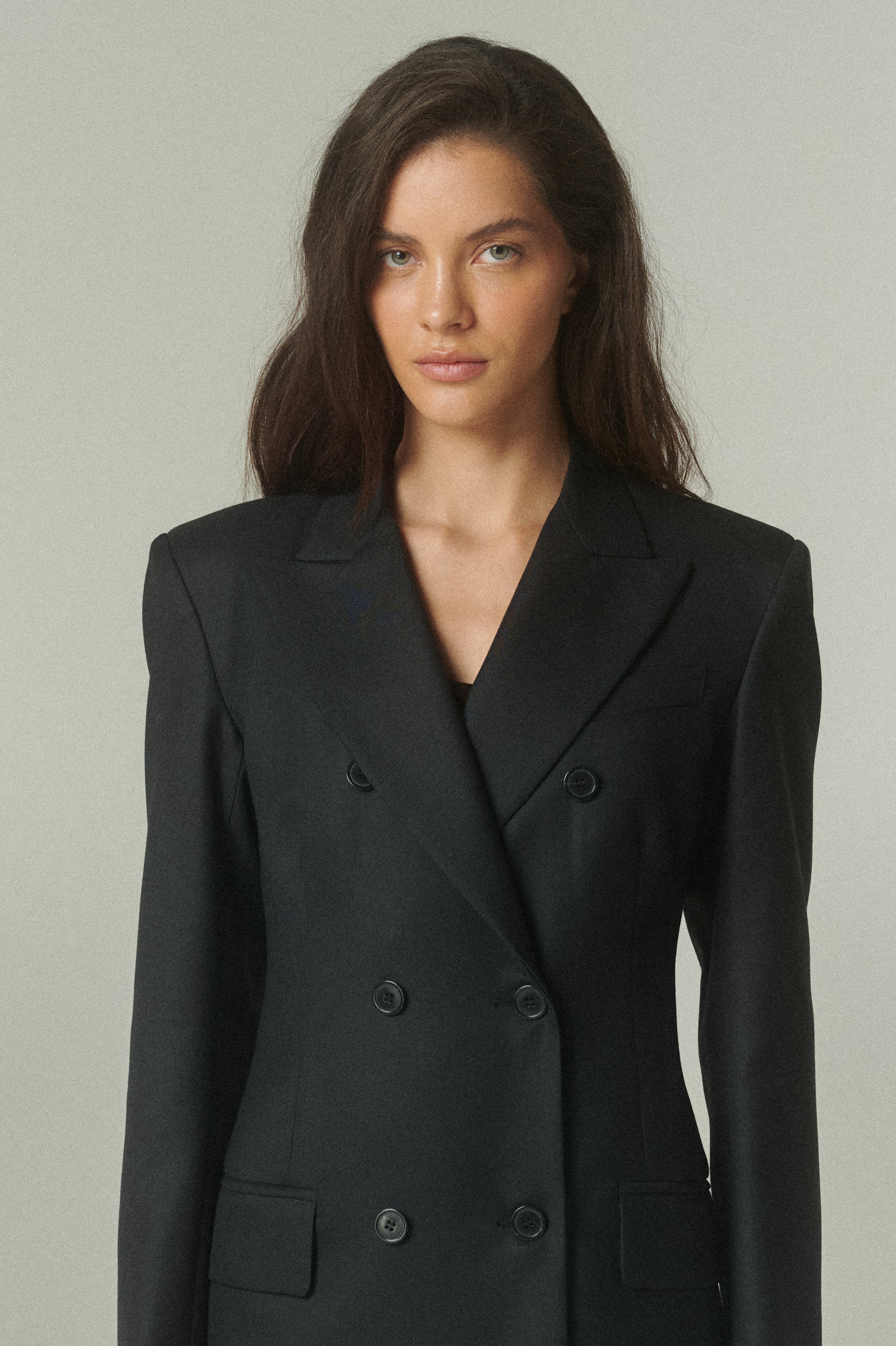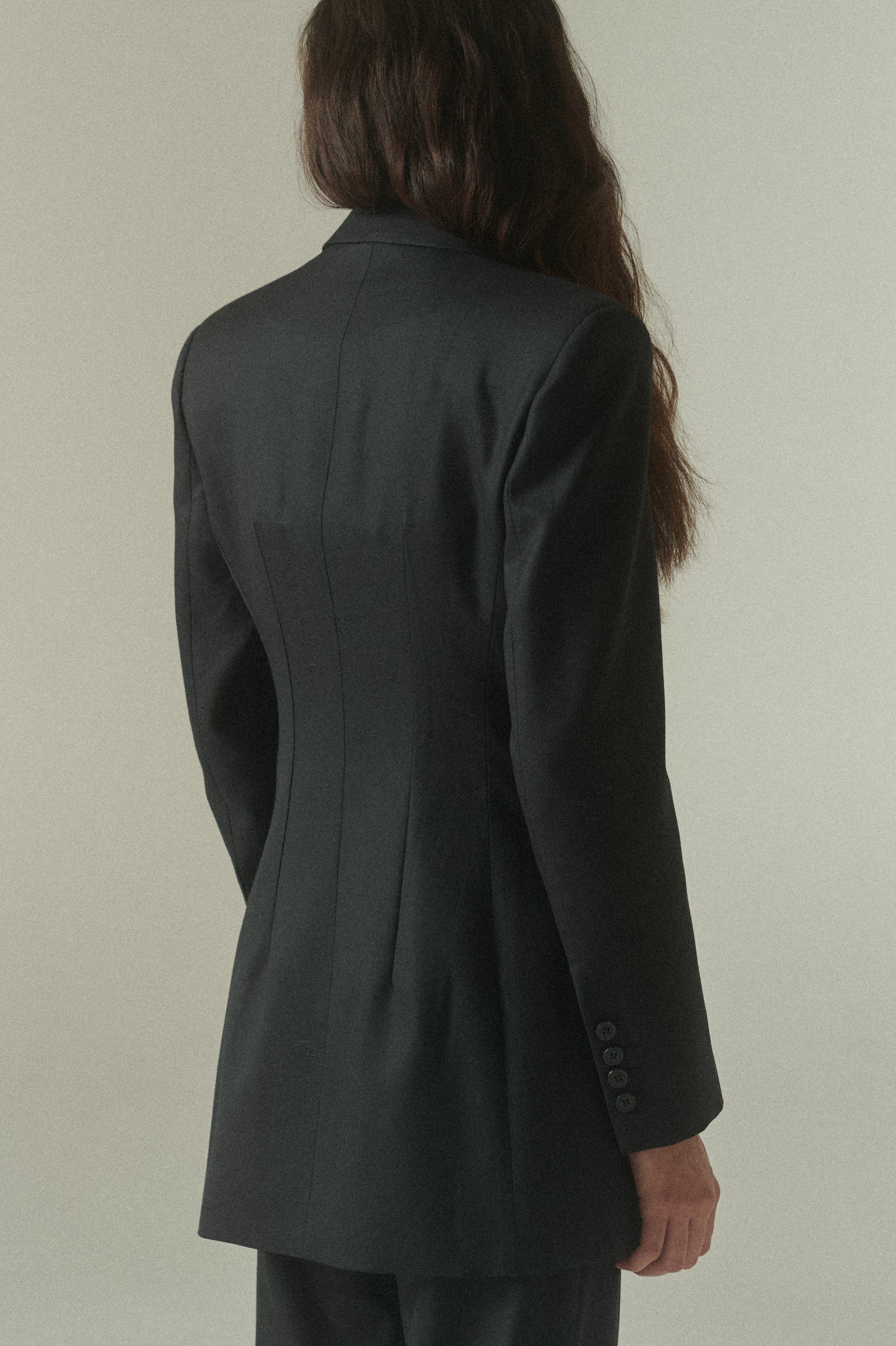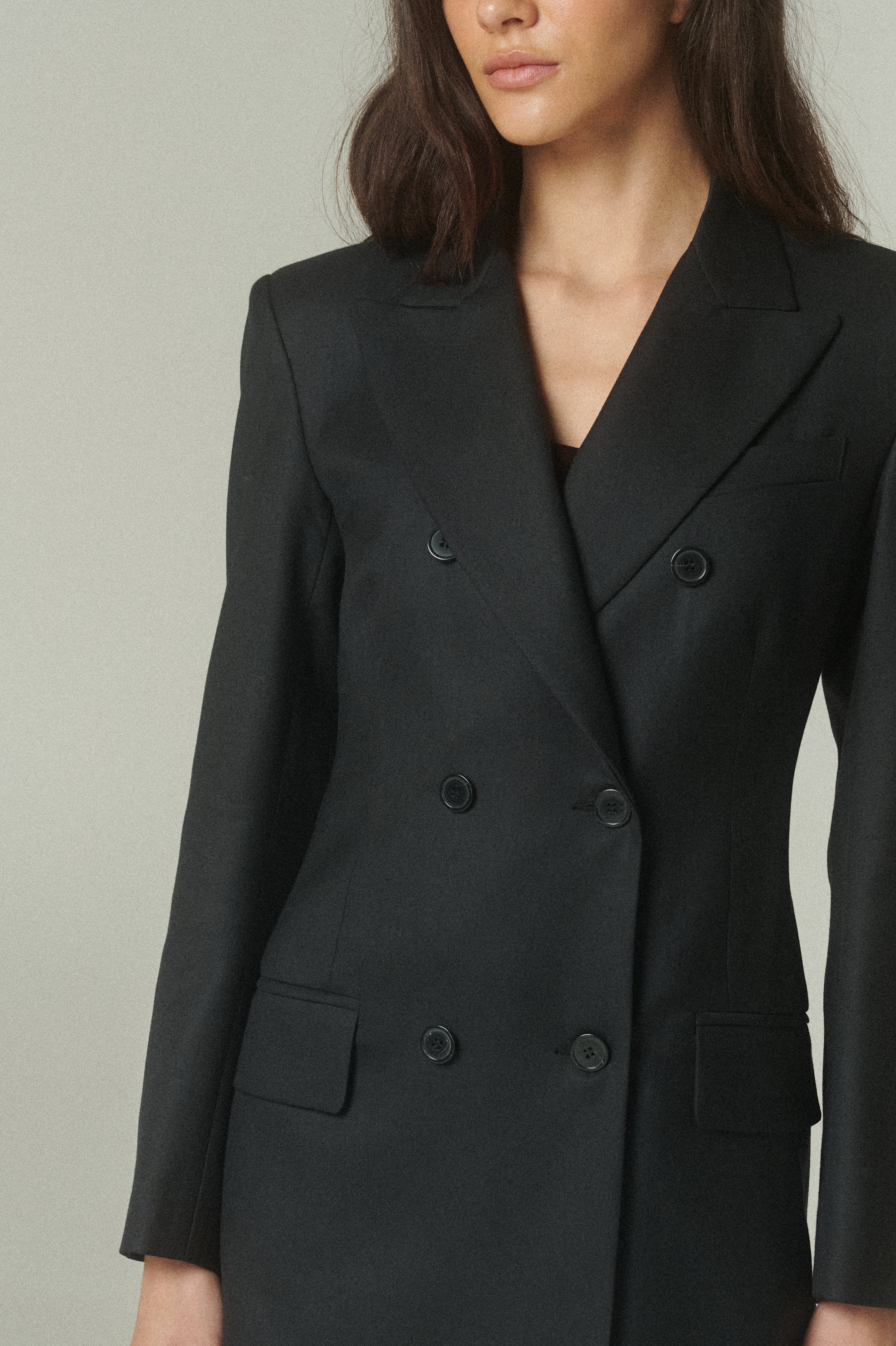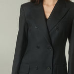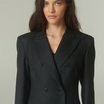 Su elegante color negro resalta la pureza de su confección y la precisión de su forma. La figura es impecable: un blazer acinturado y cruzado, rematado con finos botones italianos.