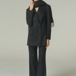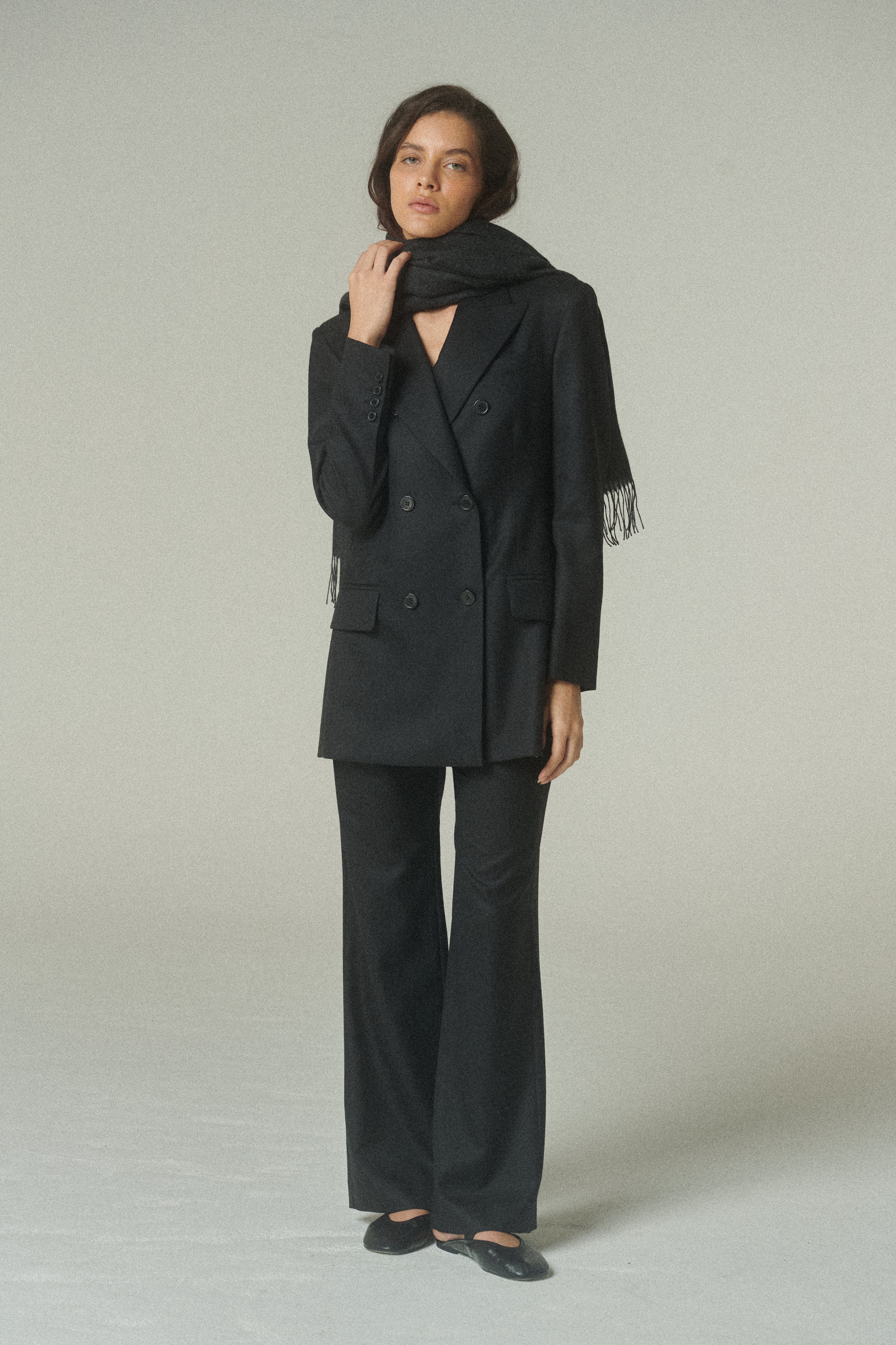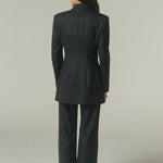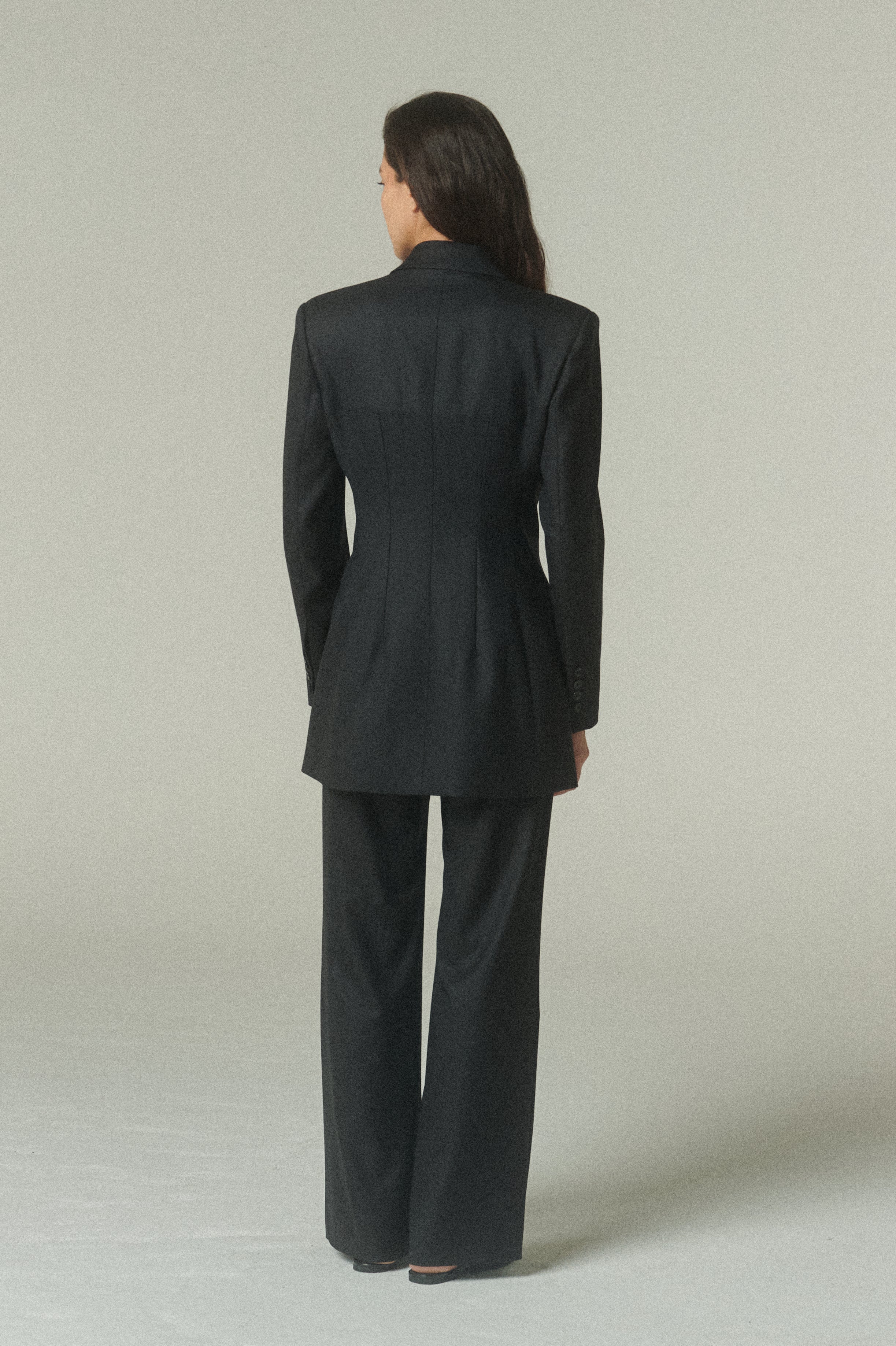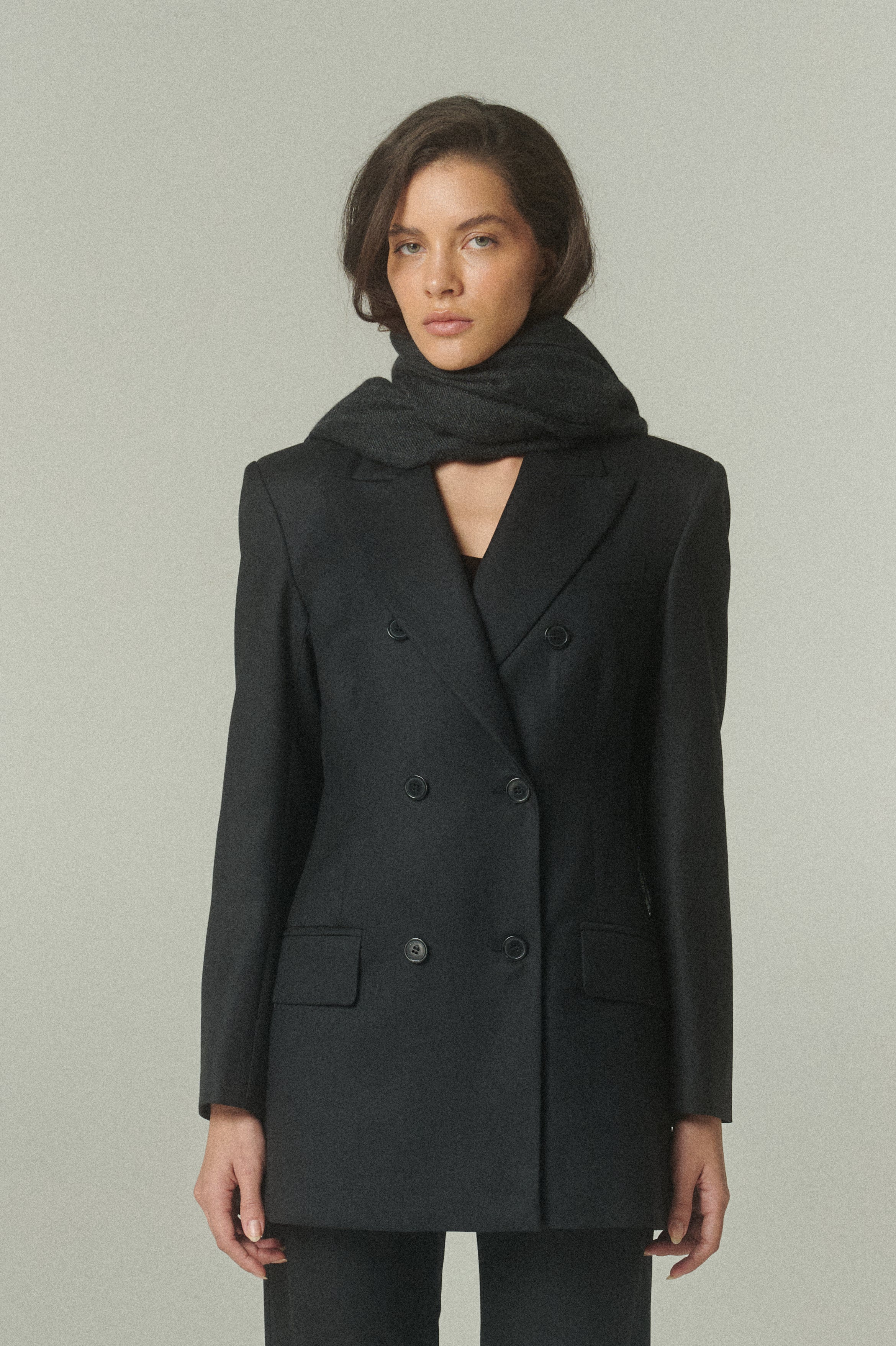 Su elegante color negro resalta la pureza de su confección y la precisión de su forma. La figura es impecable: un blazer acinturado y cruzado, rematado con finos botones italianos.