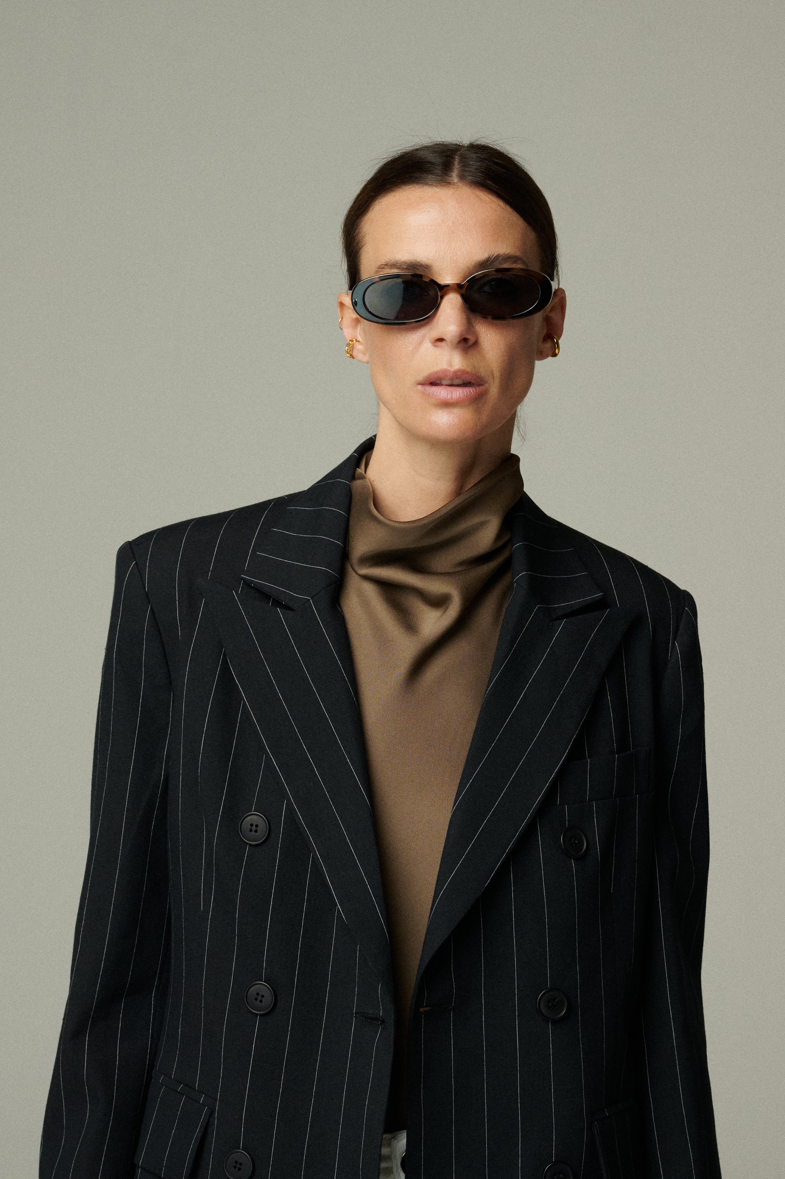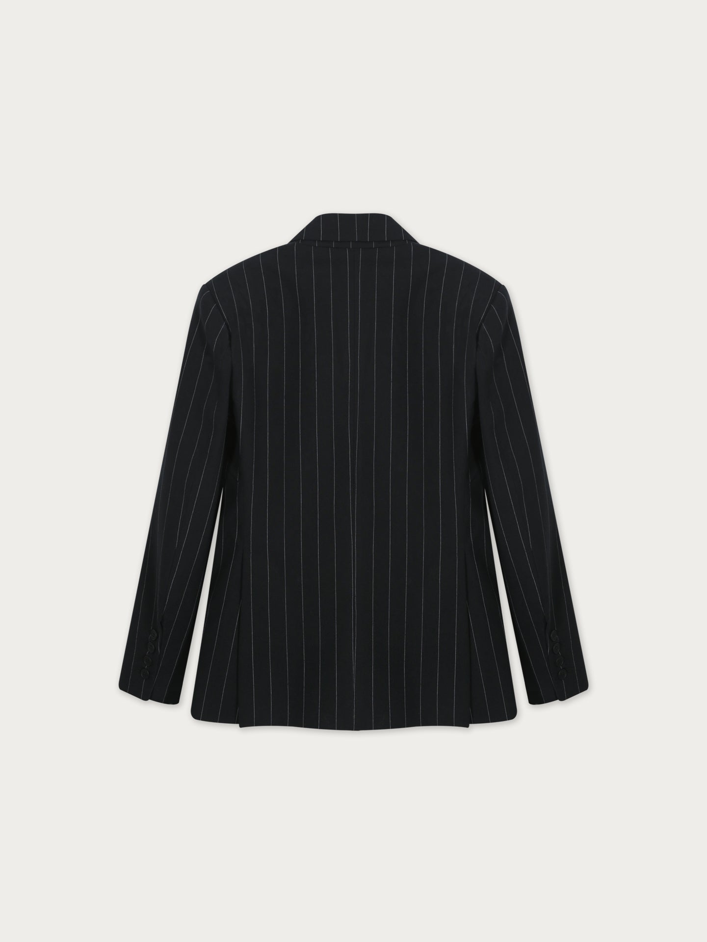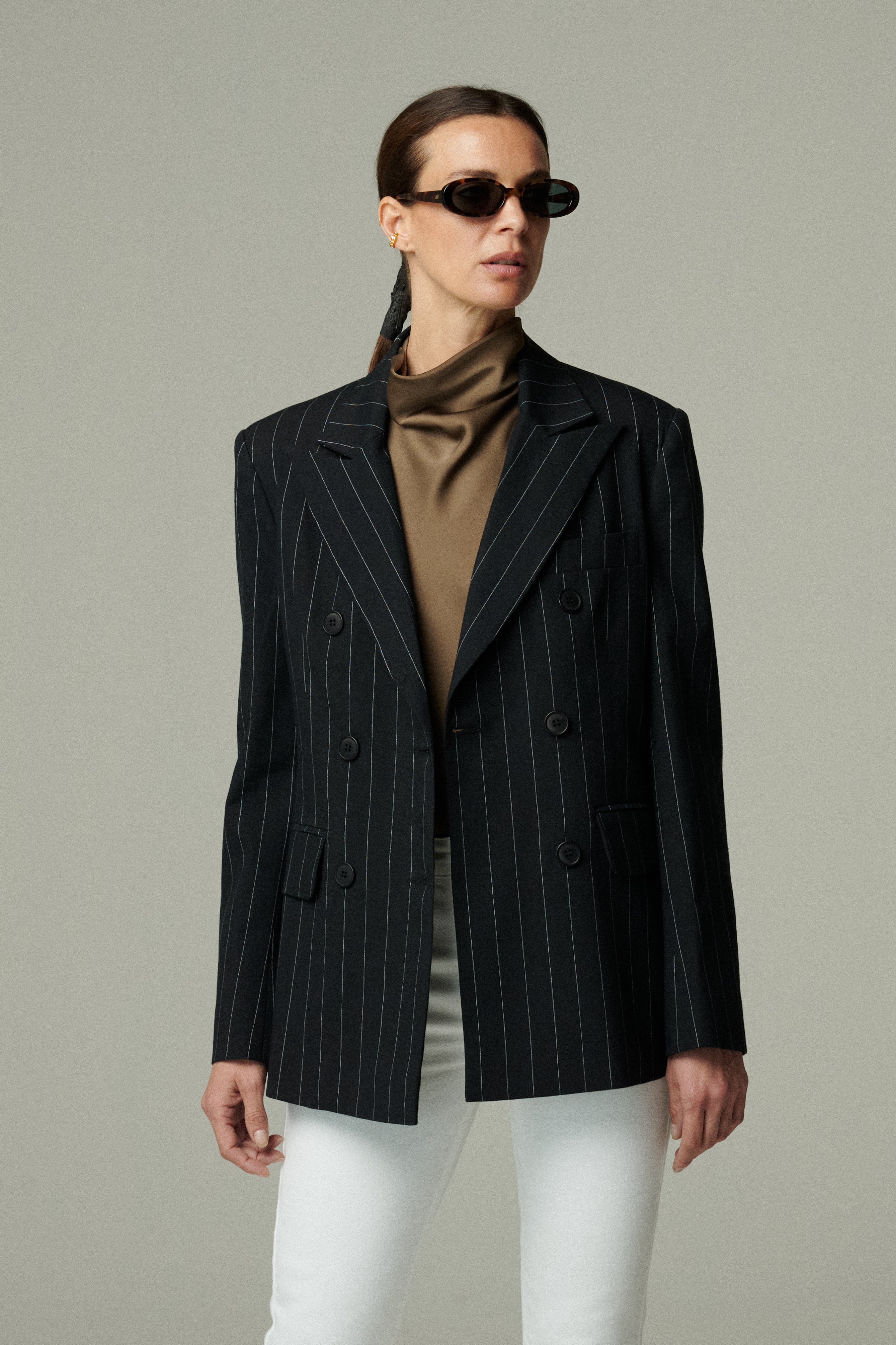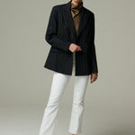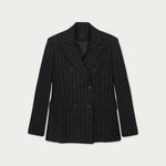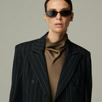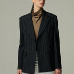 Confeccionado en 100% lino negro con sutiles rayas blancas, este blazer cruza estructura y suavidad en una silueta sofisticada. Su diseño cruzado y entallado estiliza la figura, logrando un balance entre modernidad y elegancia clásica. Una prenda que redefine lo atemporal.