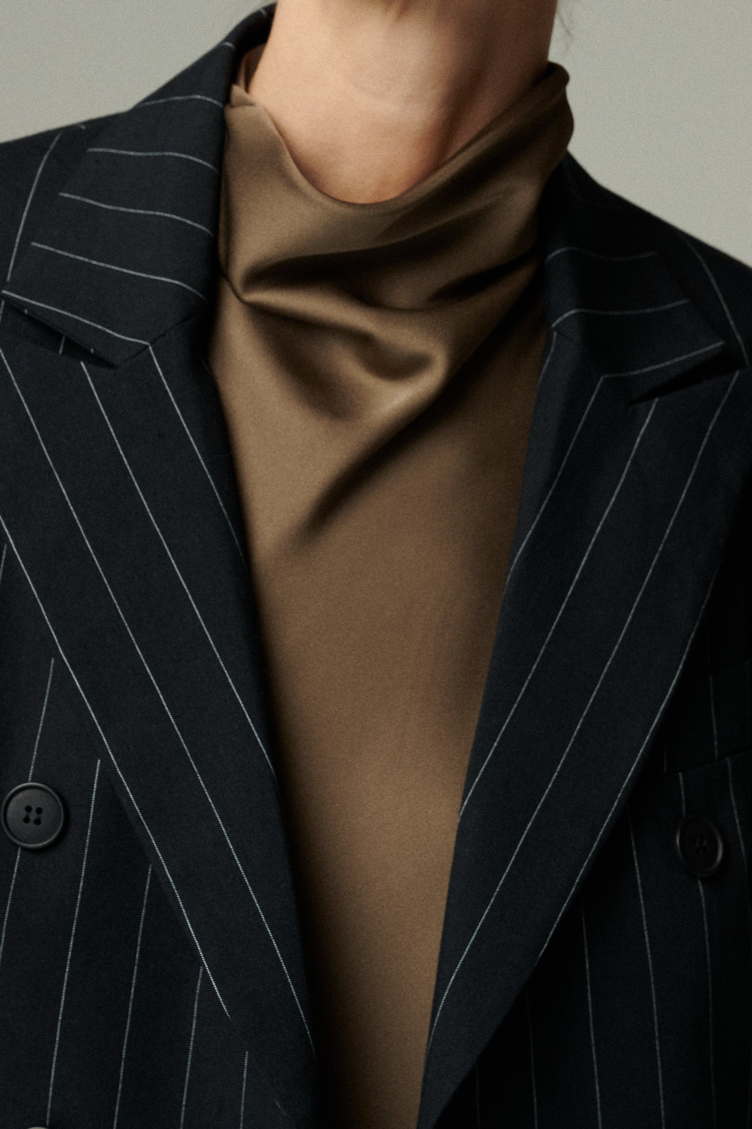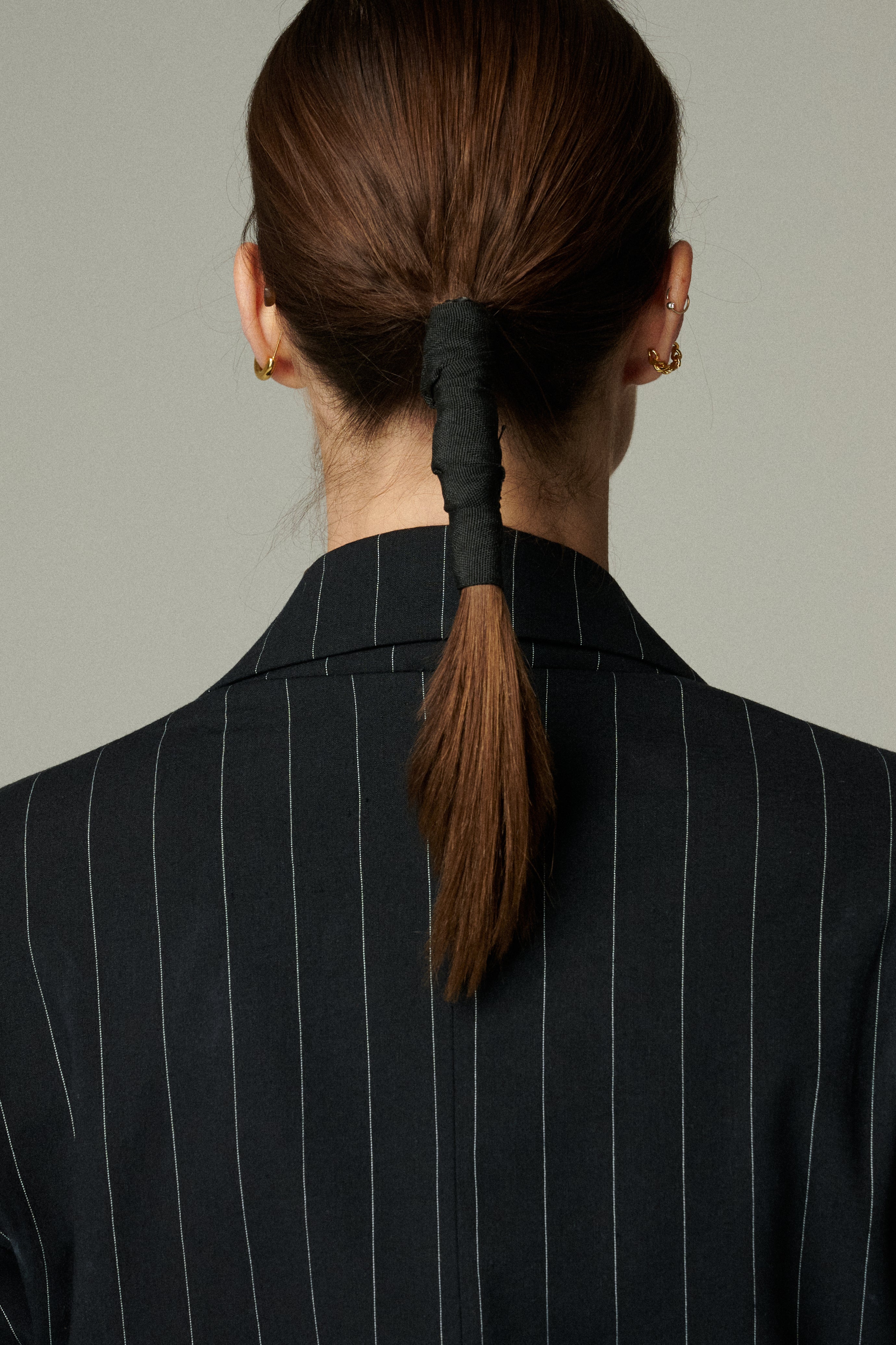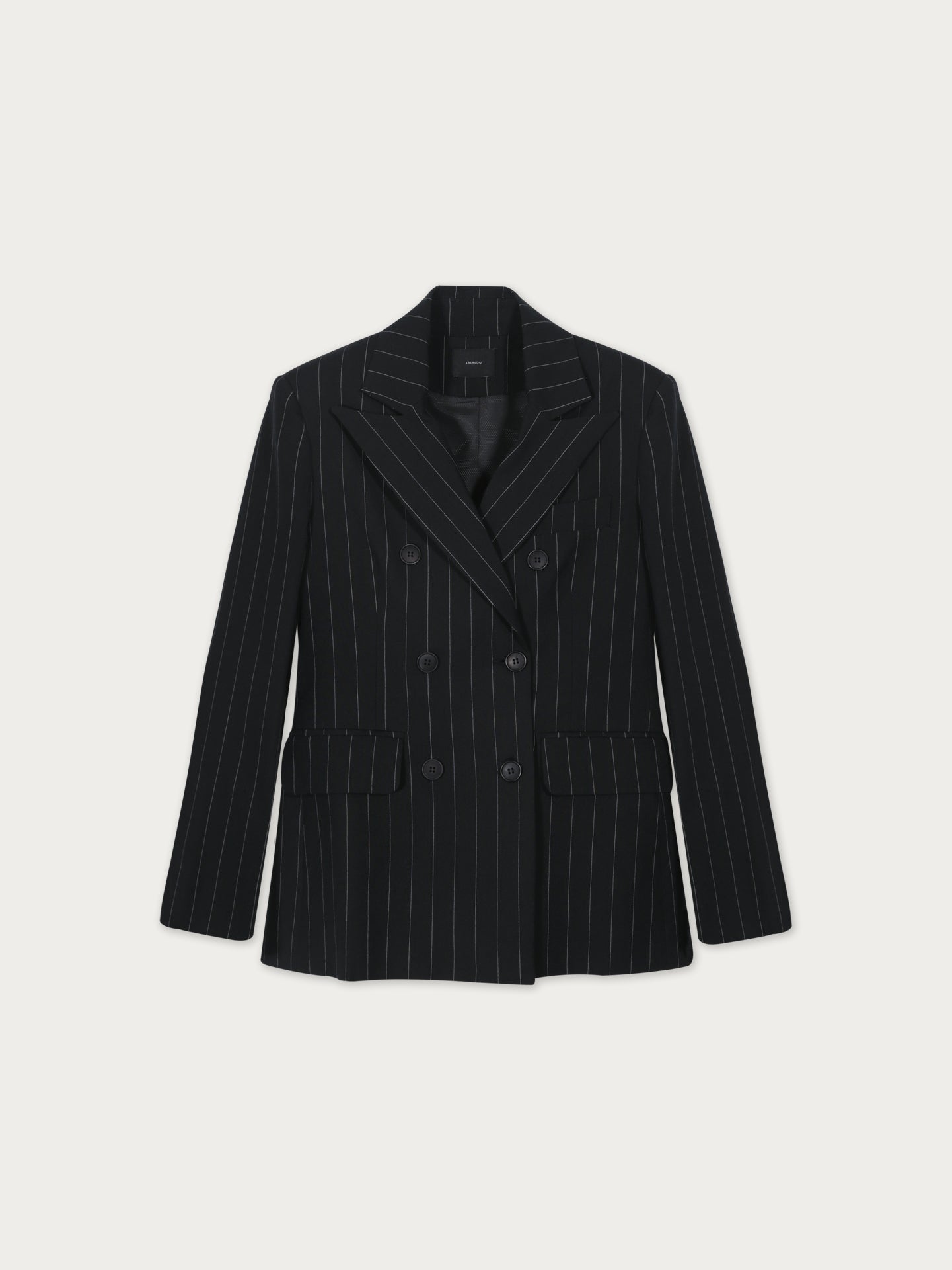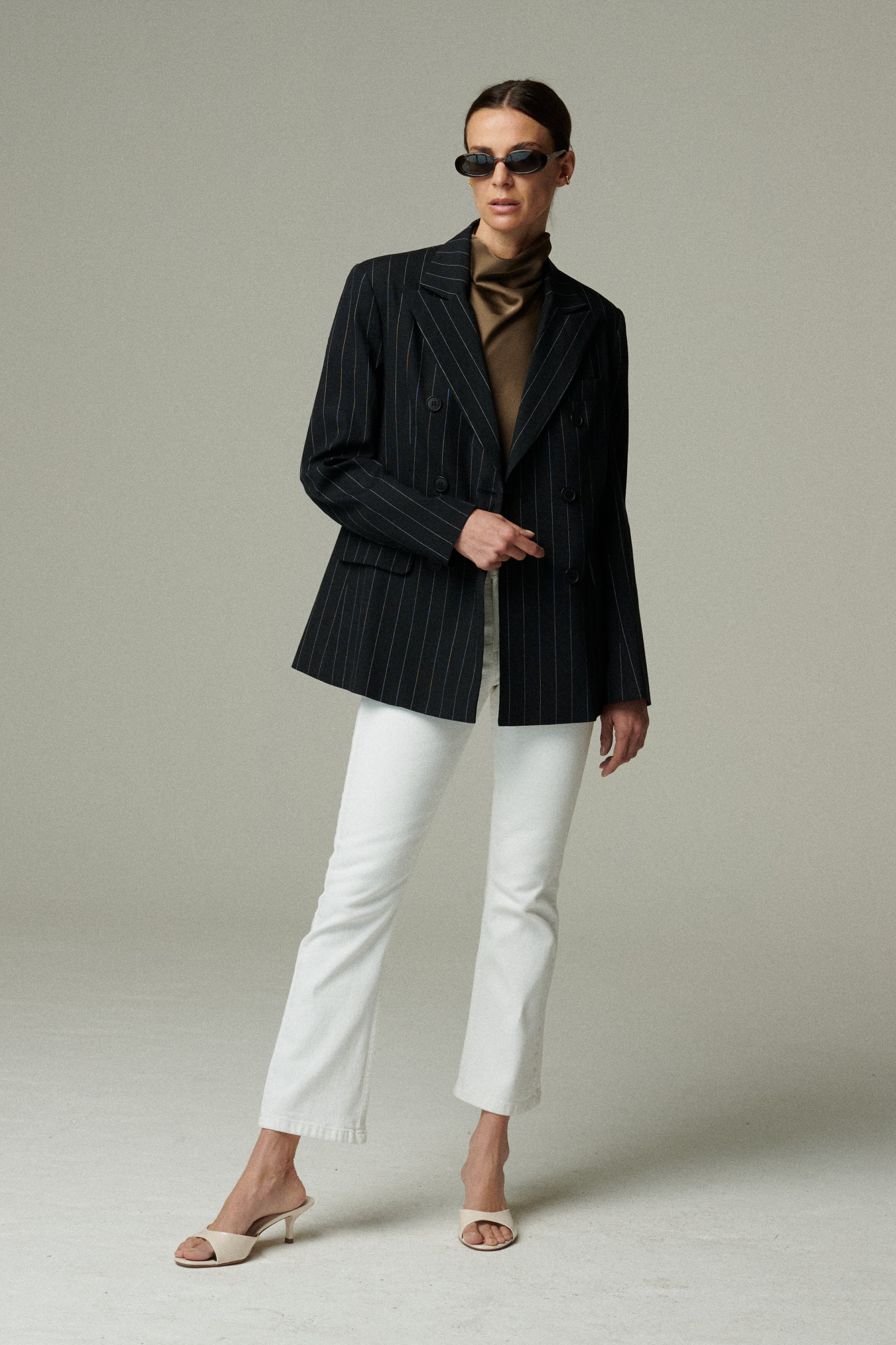 Confeccionado en 100% lino negro con sutiles rayas blancas, este blazer cruza estructura y suavidad en una silueta sofisticada. Su diseño cruzado y entallado estiliza la figura, logrando un balance entre modernidad y elegancia clásica. Una prenda que redefine lo atemporal.