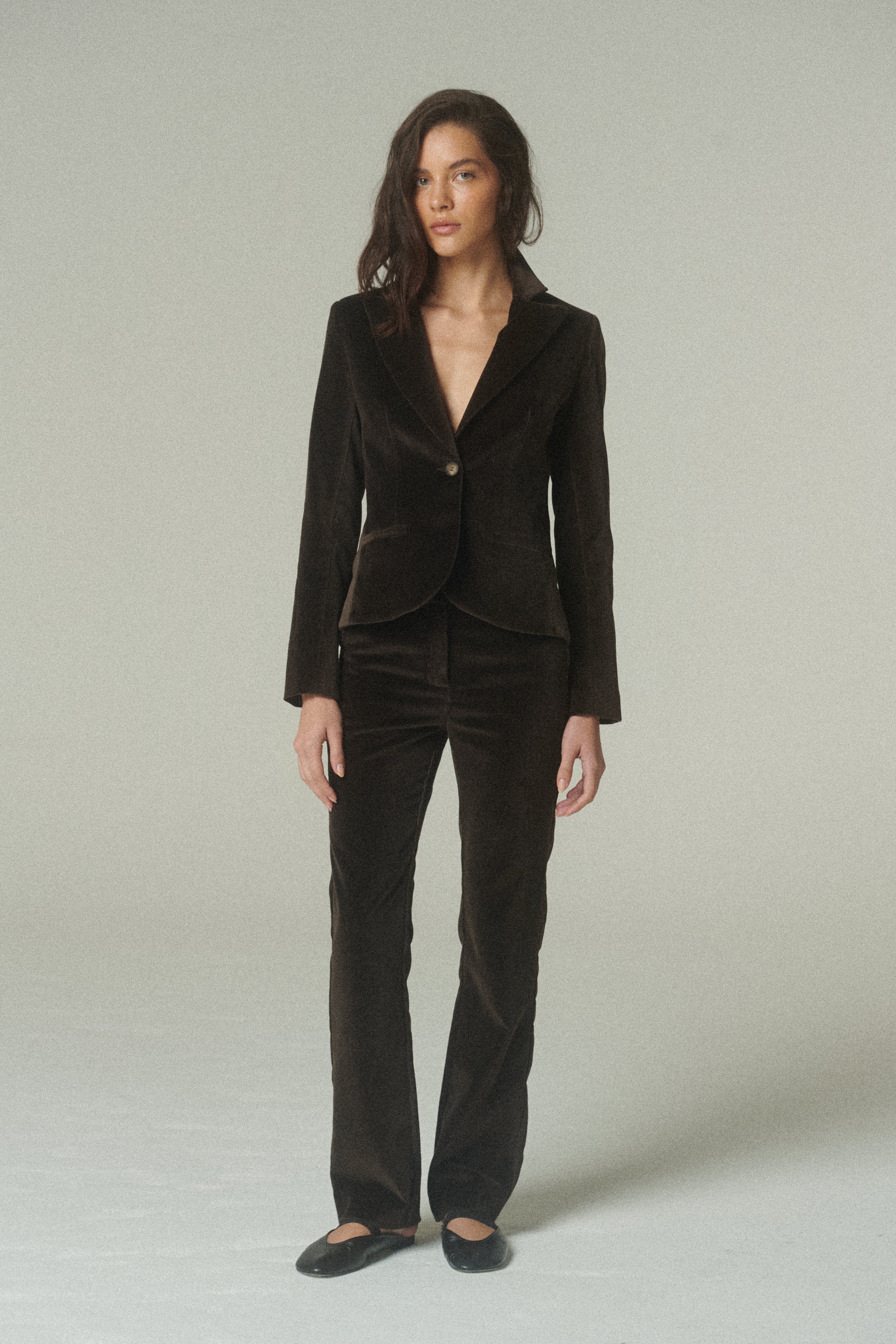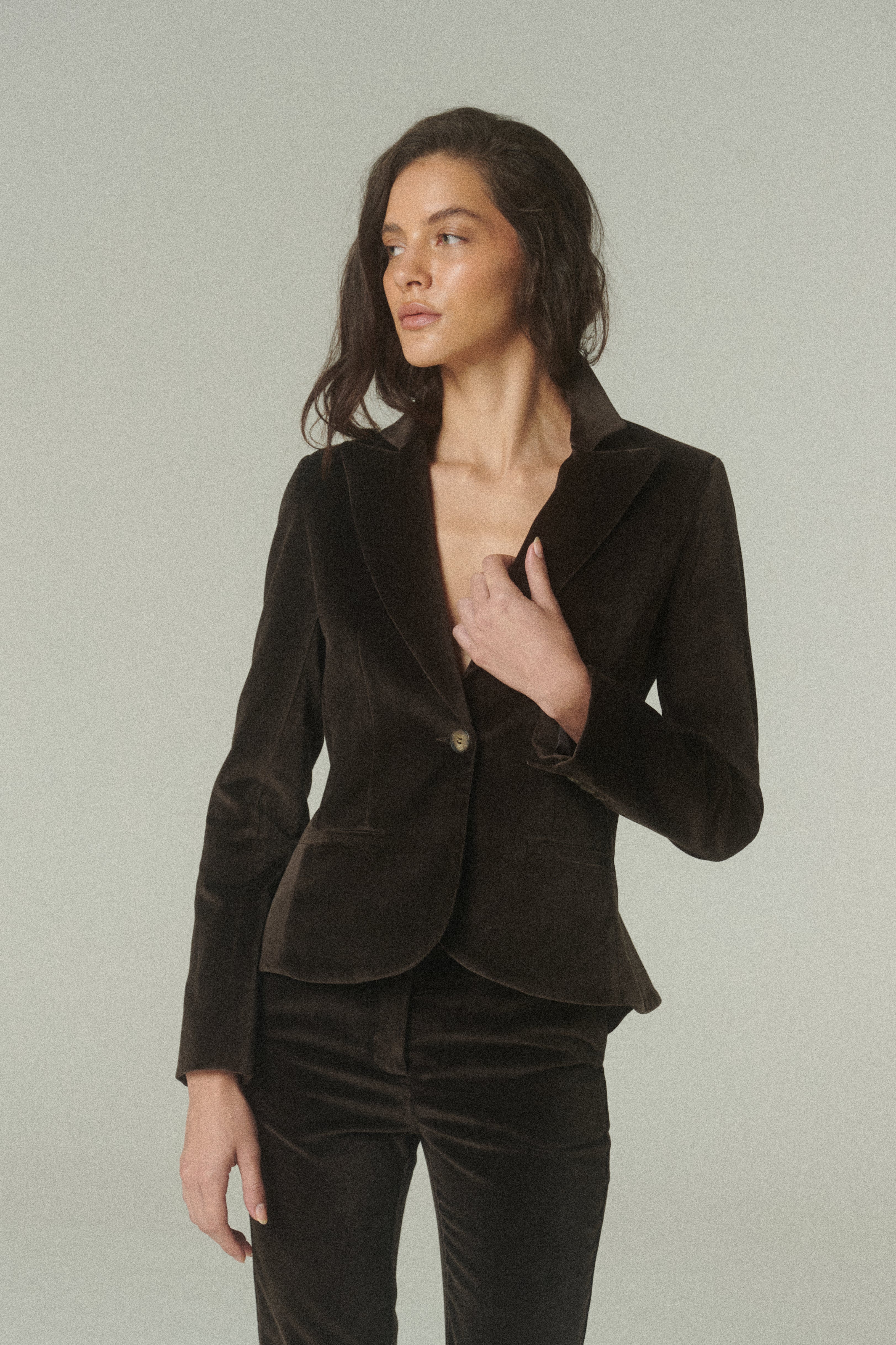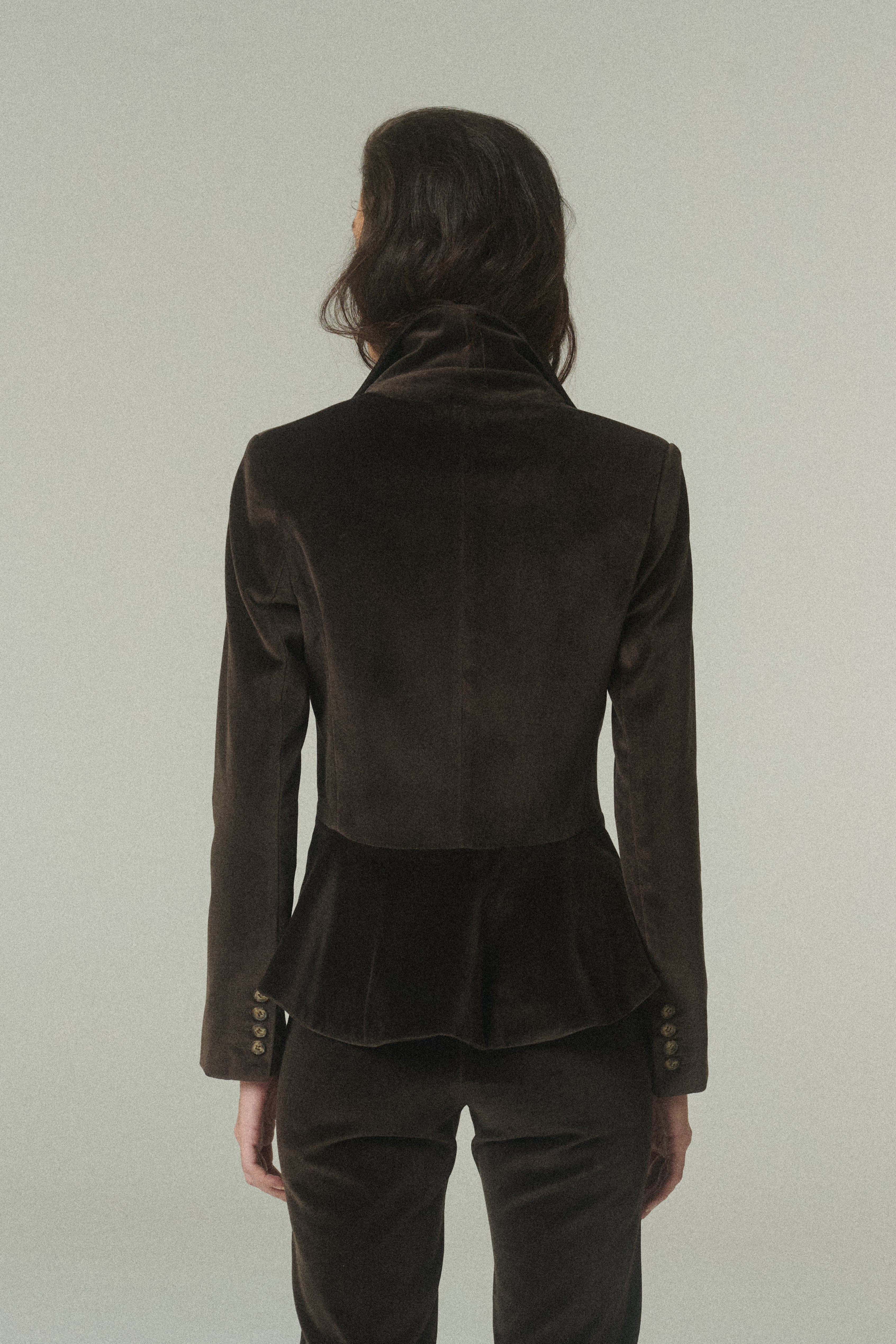 Nuestro Blazer Waist es una pieza profundamente atemporal, pensada para perdurar tanto por su materialidad como por su diseño. Confeccionado en terciopelo de alta calidad en tono chocolate.