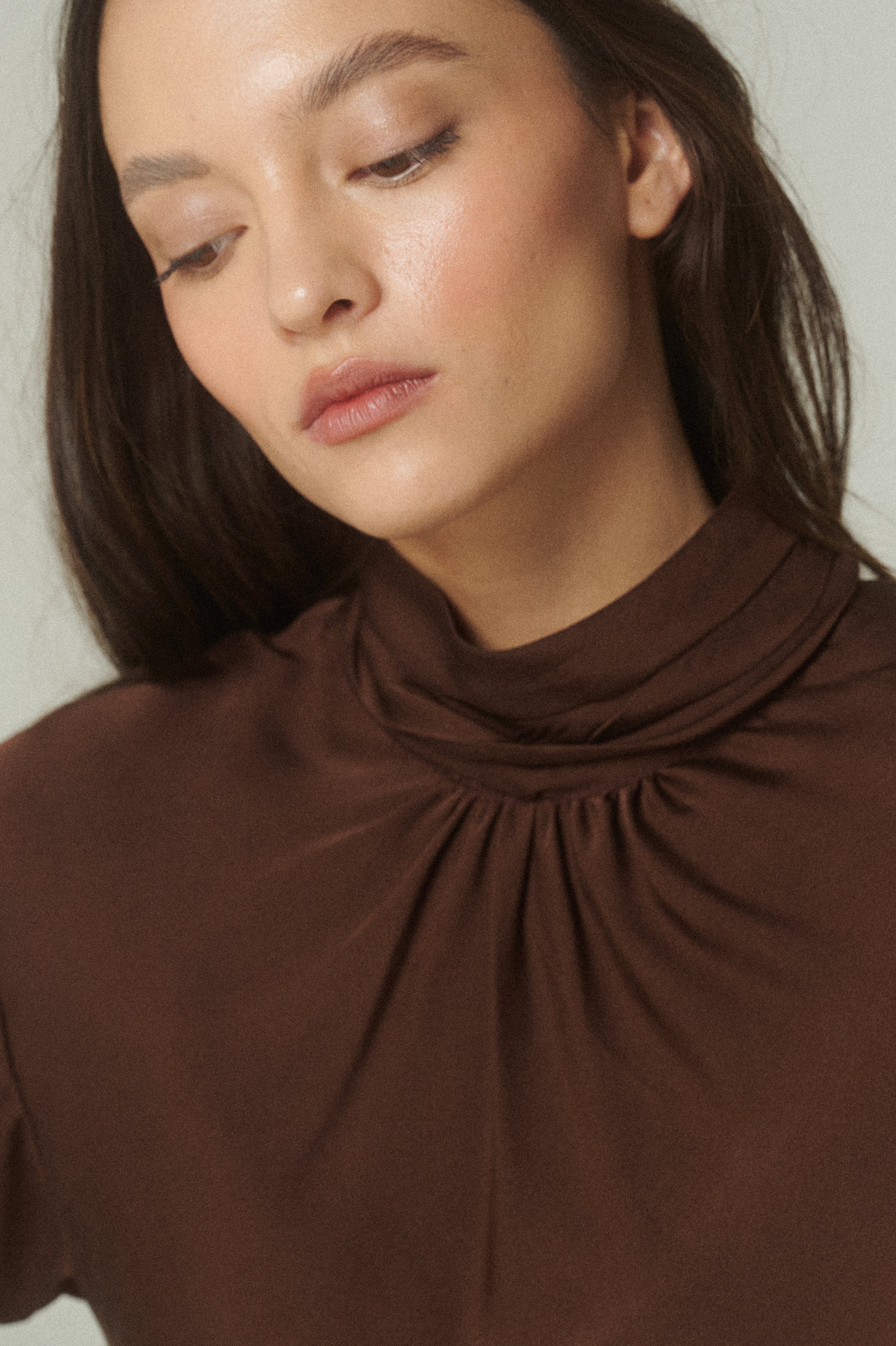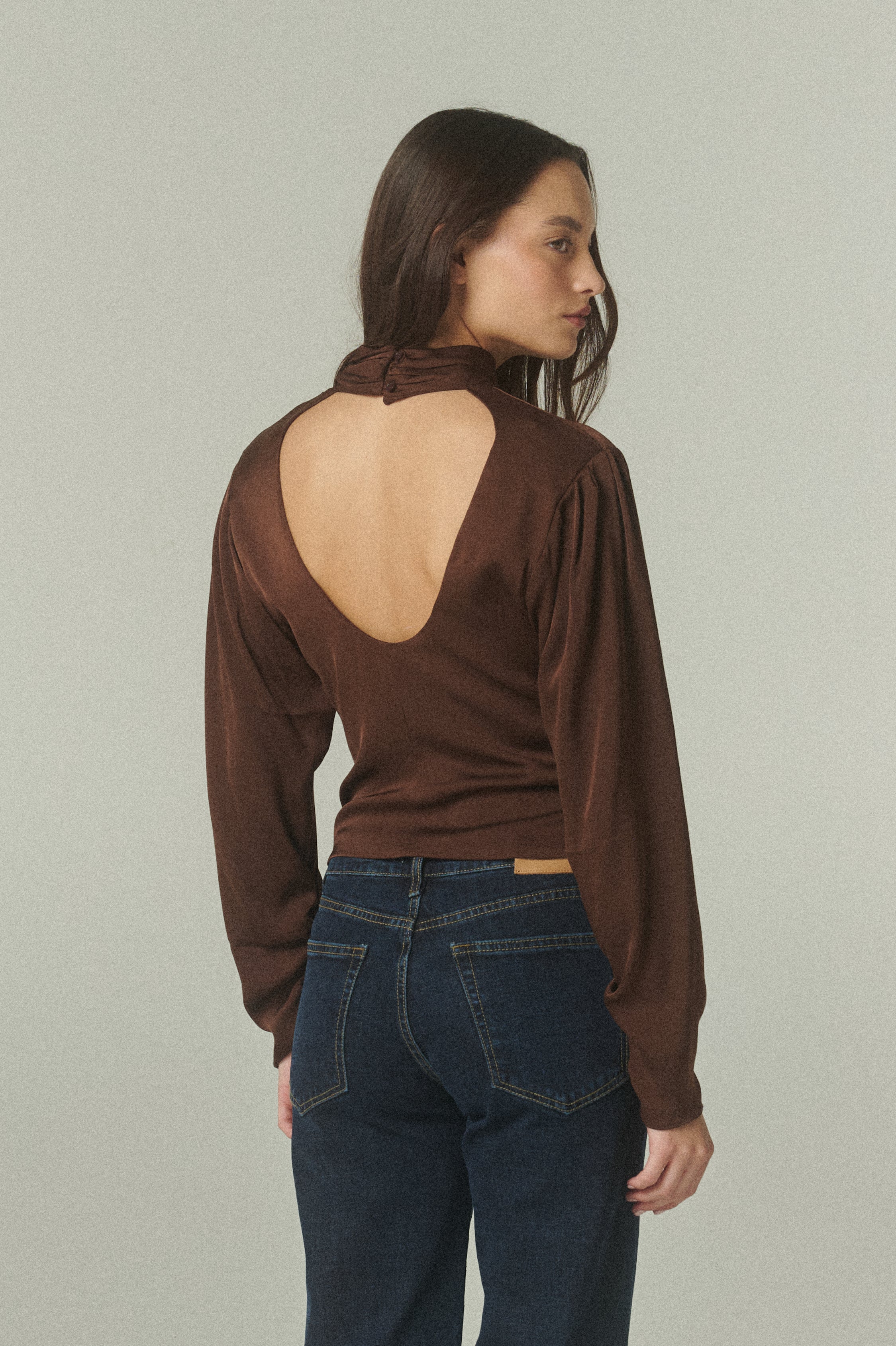 Esta prenda se distingue por su cuello alto y escote en la espalda, ideal para ocasiones memorables. La blusa cobra vida a través de una serie de pliegues y pinzas situadas en el cuello, mangas y cintura. Estos detalles añaden una estructura sutil que aporta dinamismo y un relieve elegante a la silueta.
