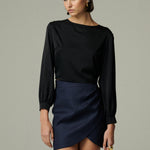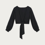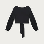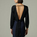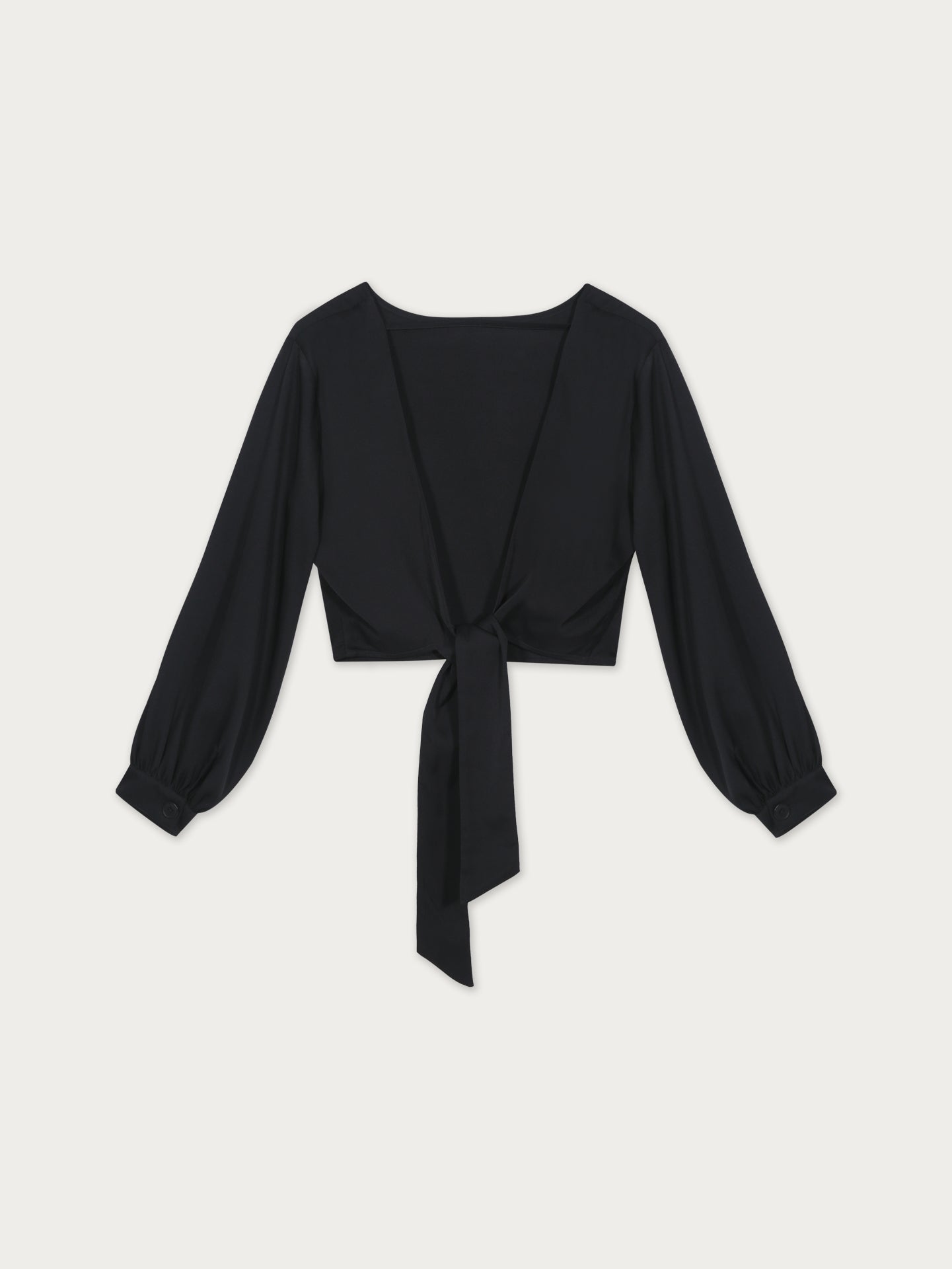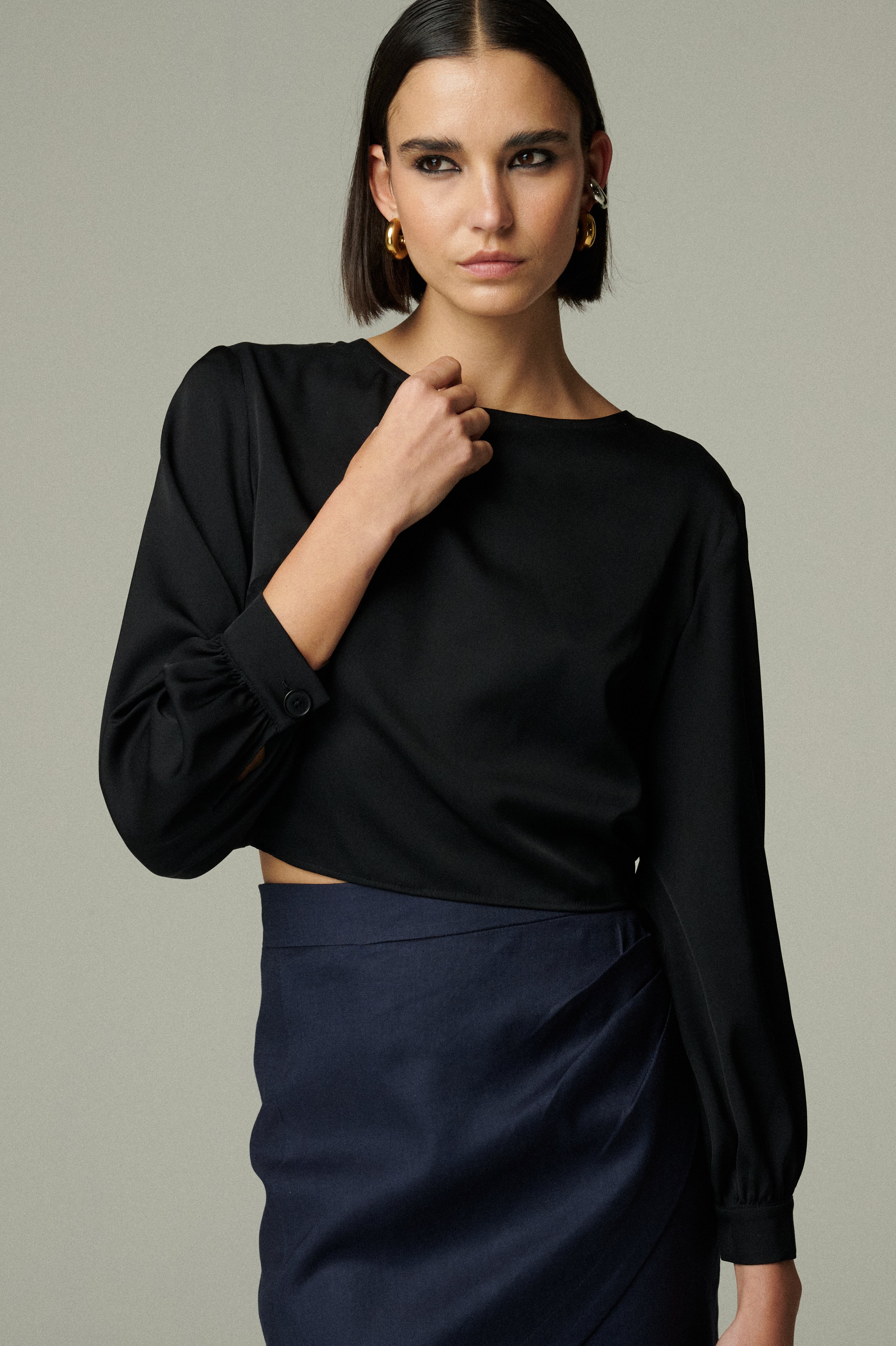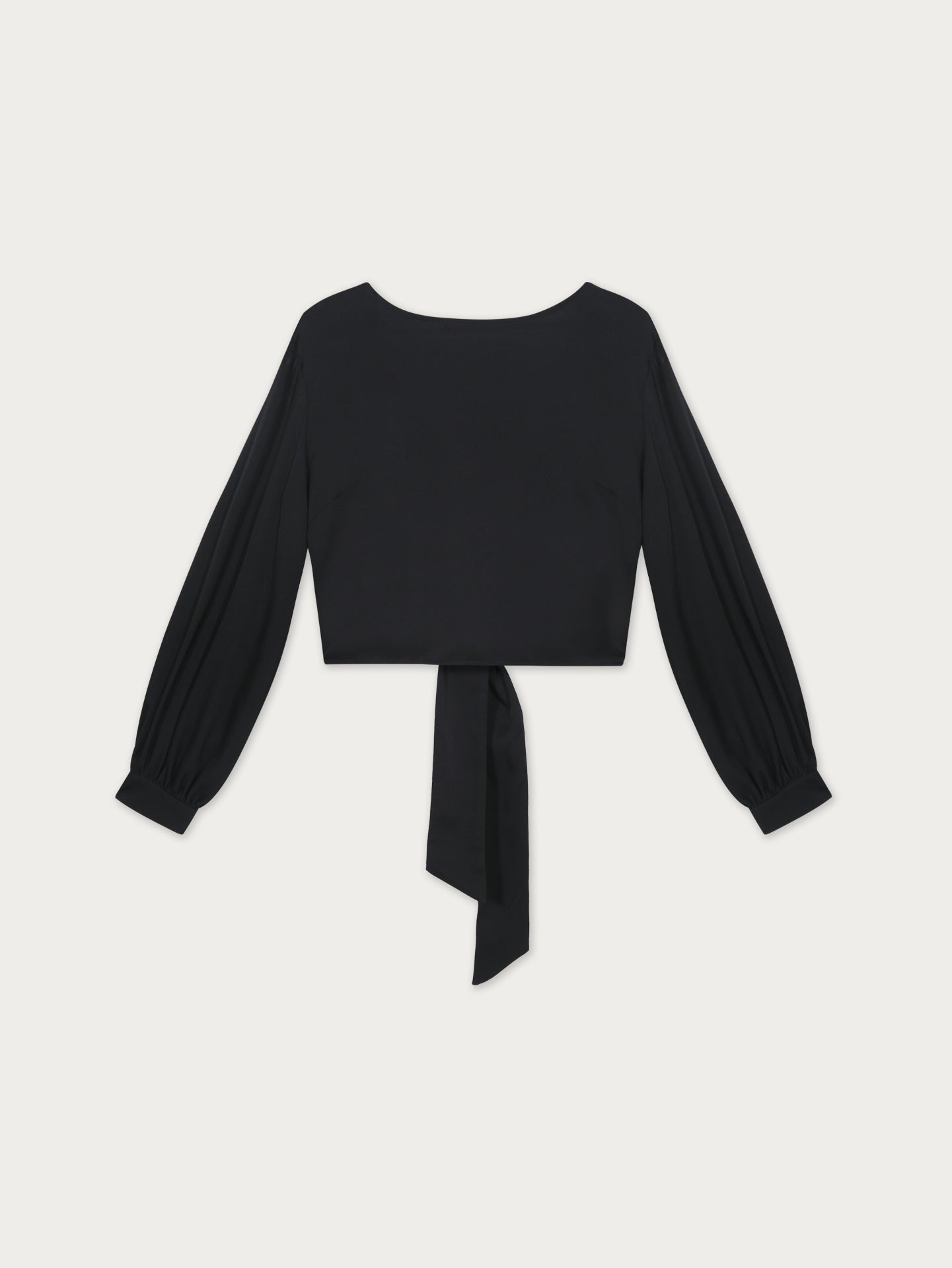Una silueta distinta para reimaginar la manga larga. Blusa negra de 100% seda con escote cerrado y mangas ligeramente englobadas que terminan en puño. La espalda descubierta, que se amarra a la cintura, aporta romanticismo y realza la figura.