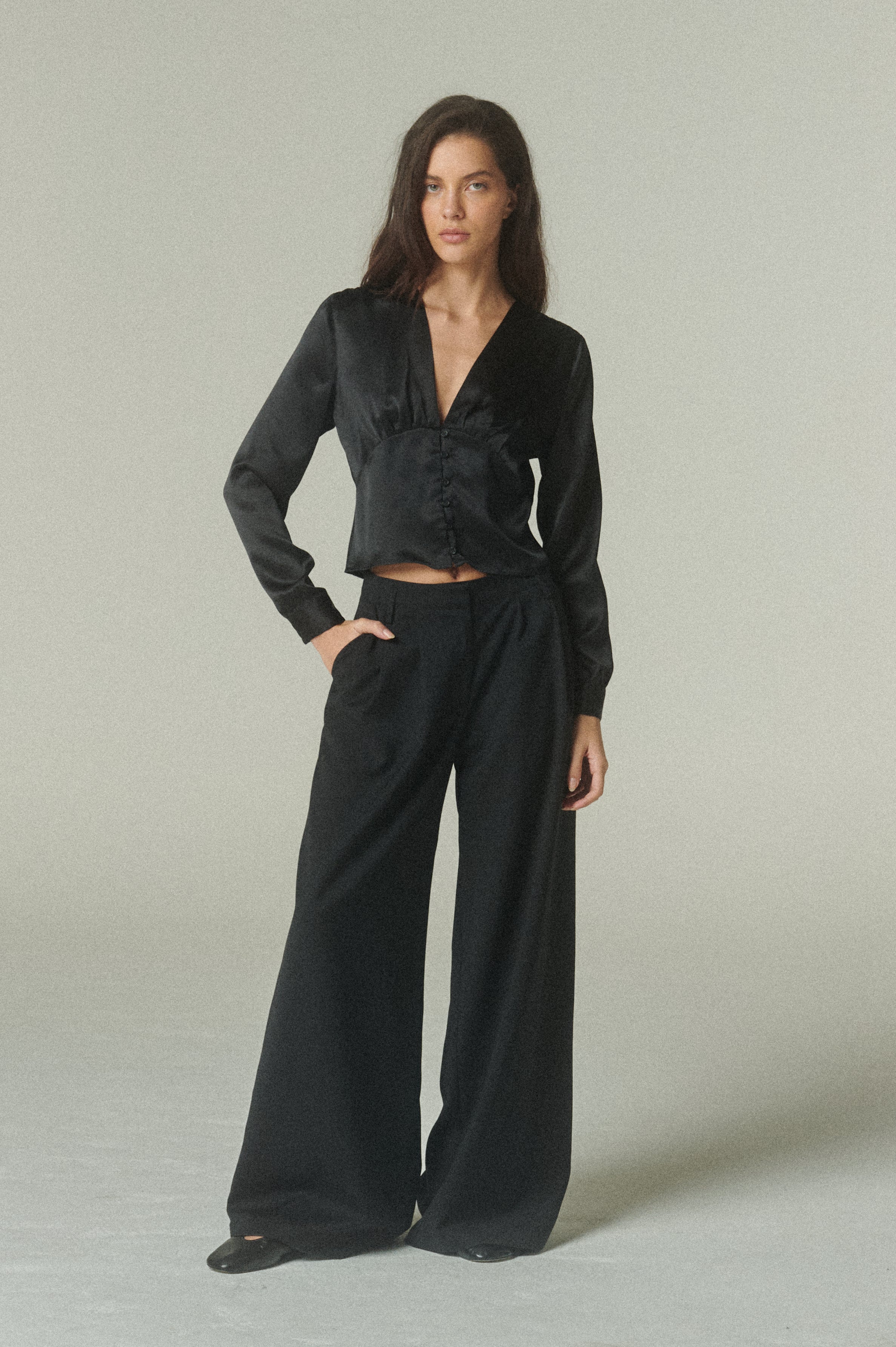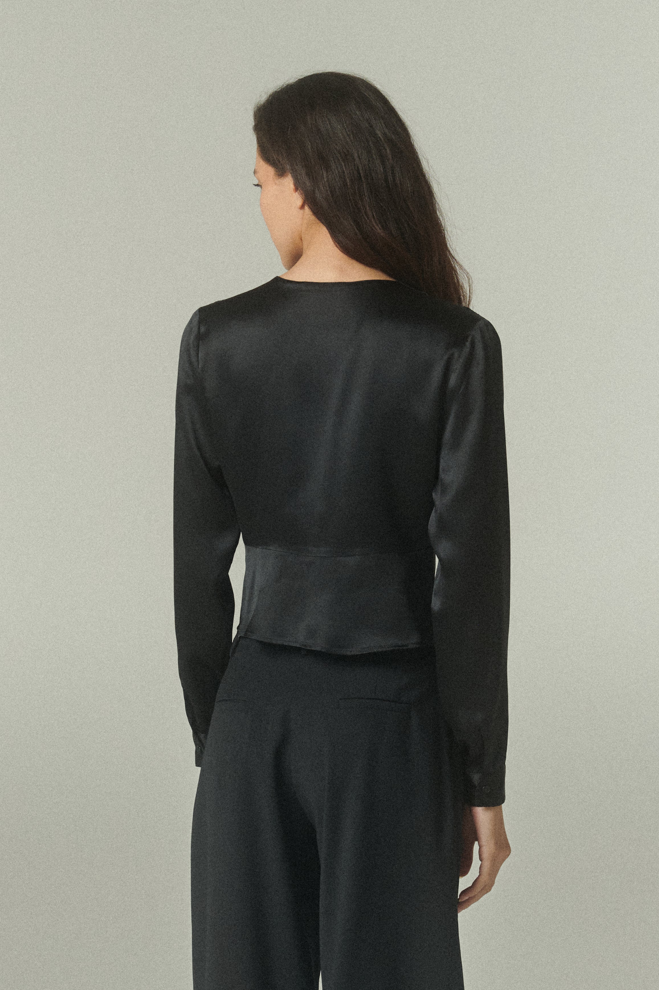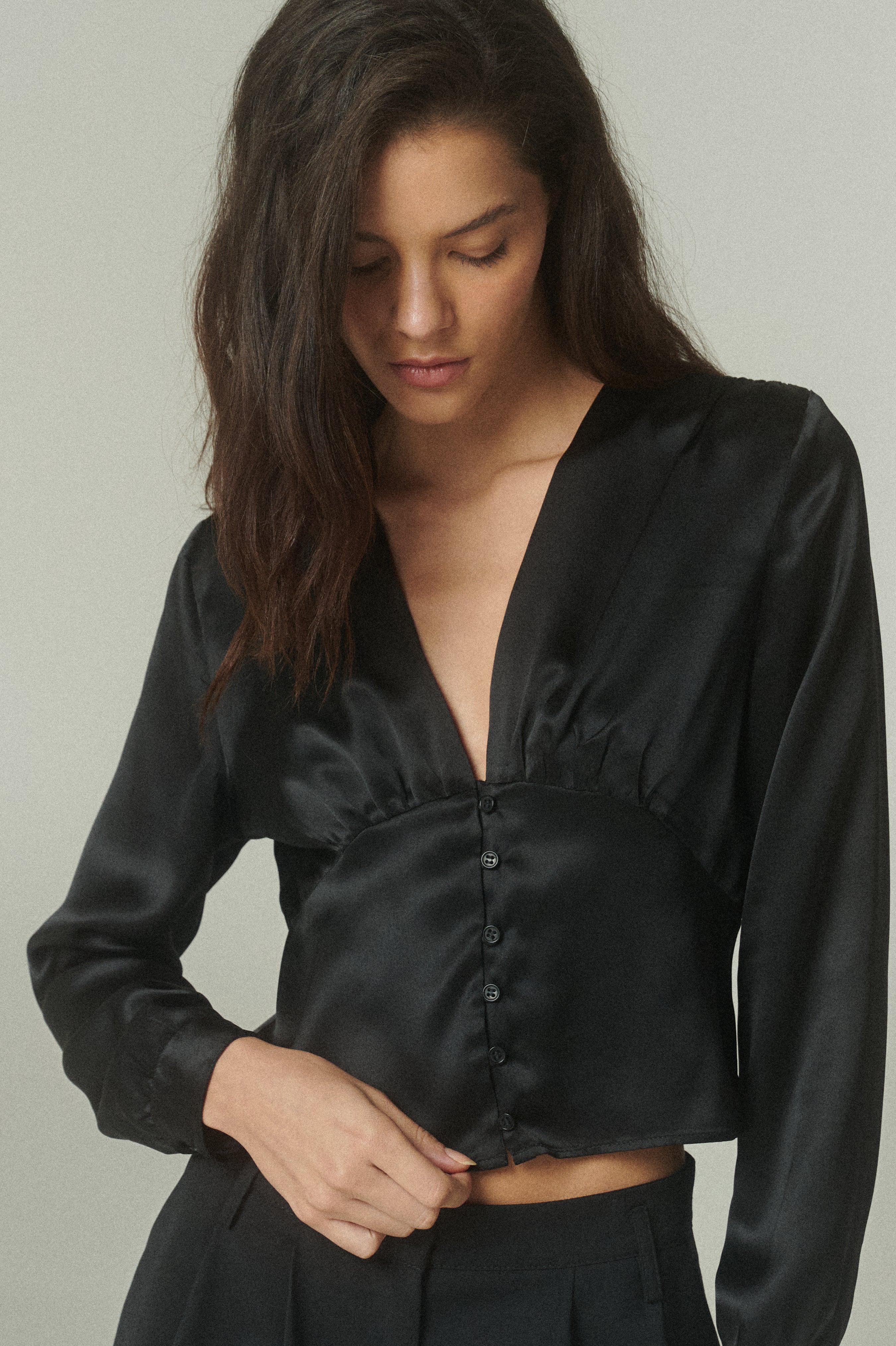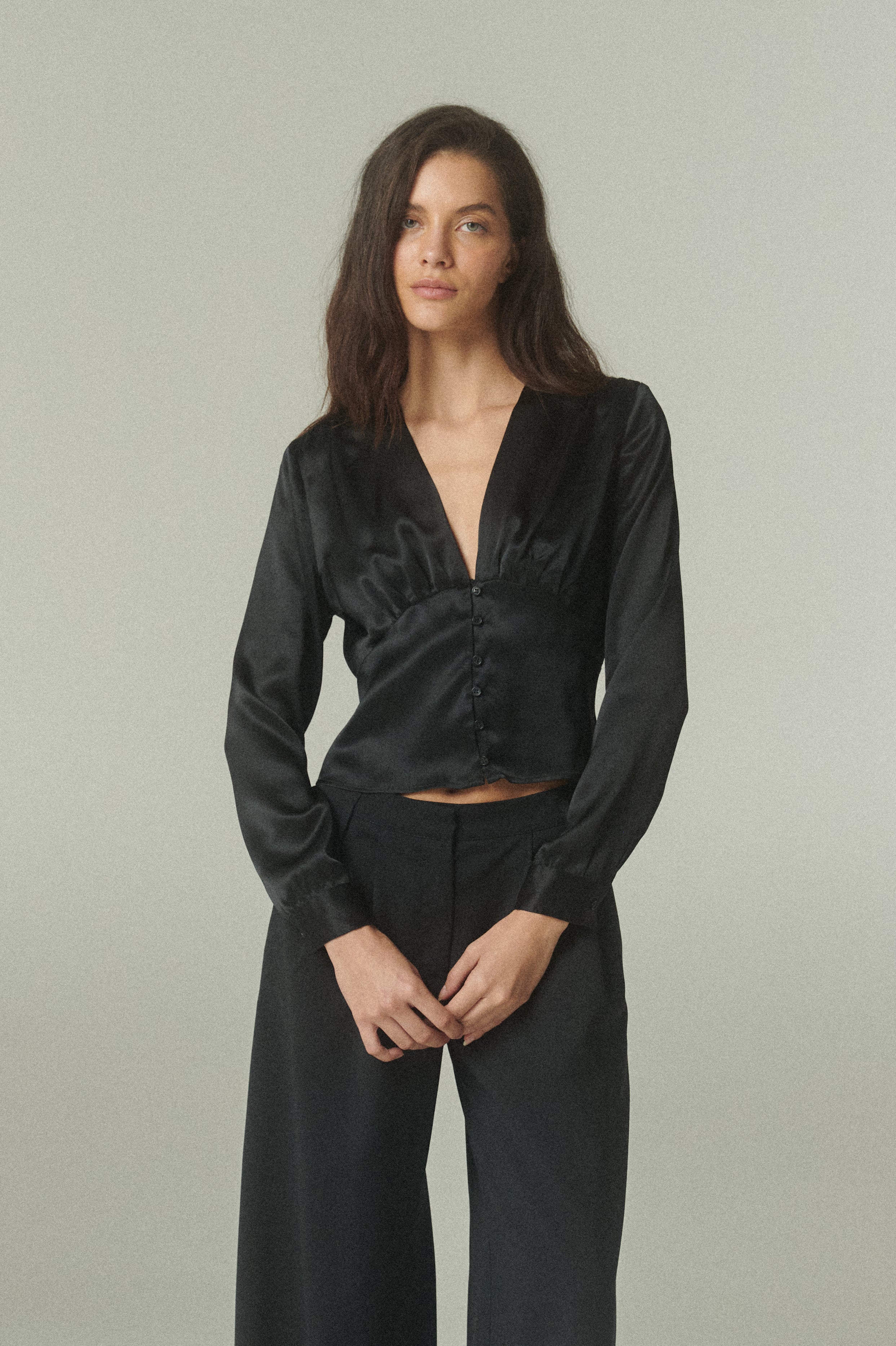 De calce favorecedor, presenta un escote en V que equilibra una silueta femenina. El detalle de los botones frontales aporta un toque final de distinción, mientras que sus mangas largas añaden movimiento y fluidez.