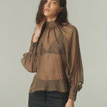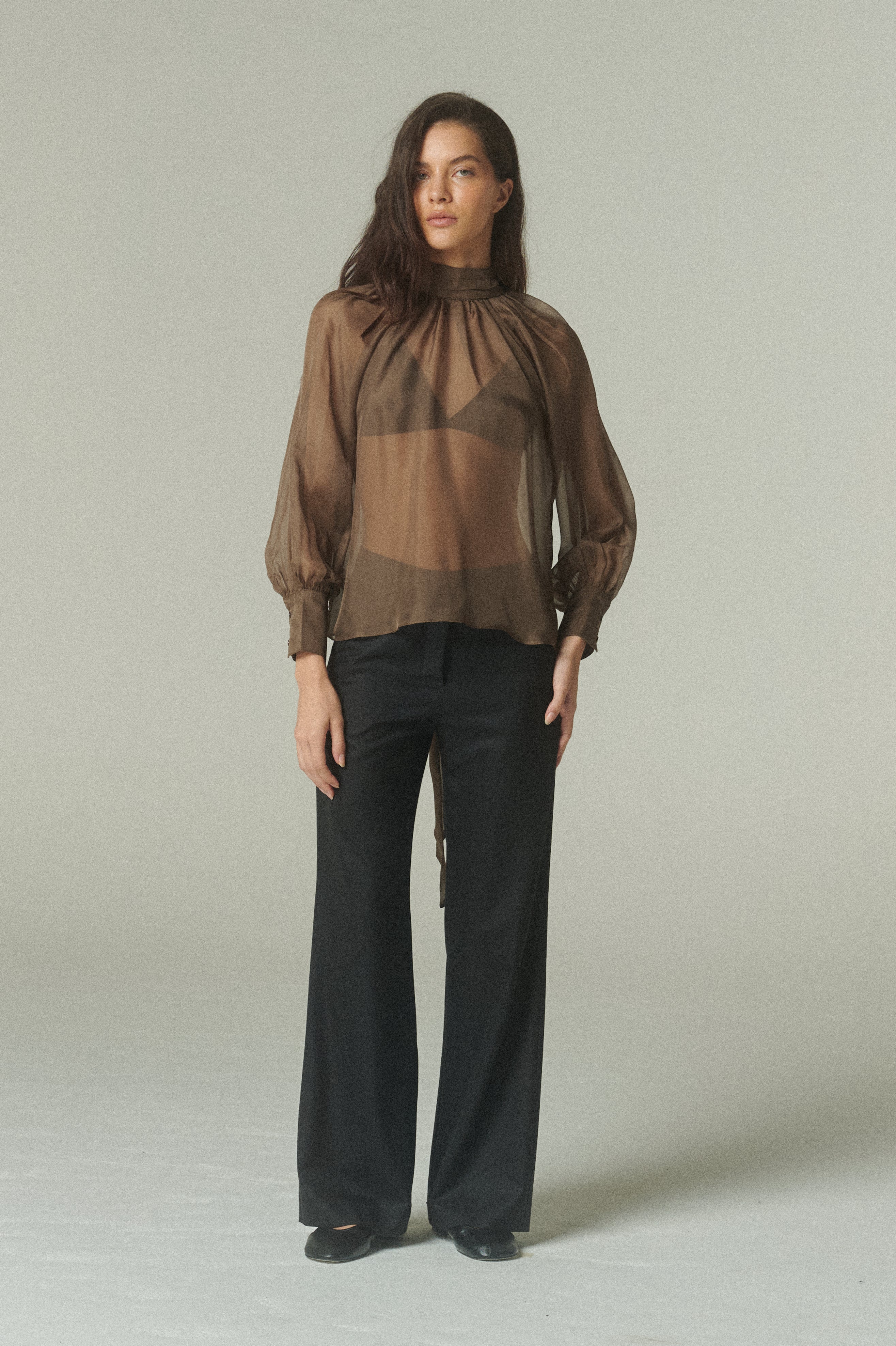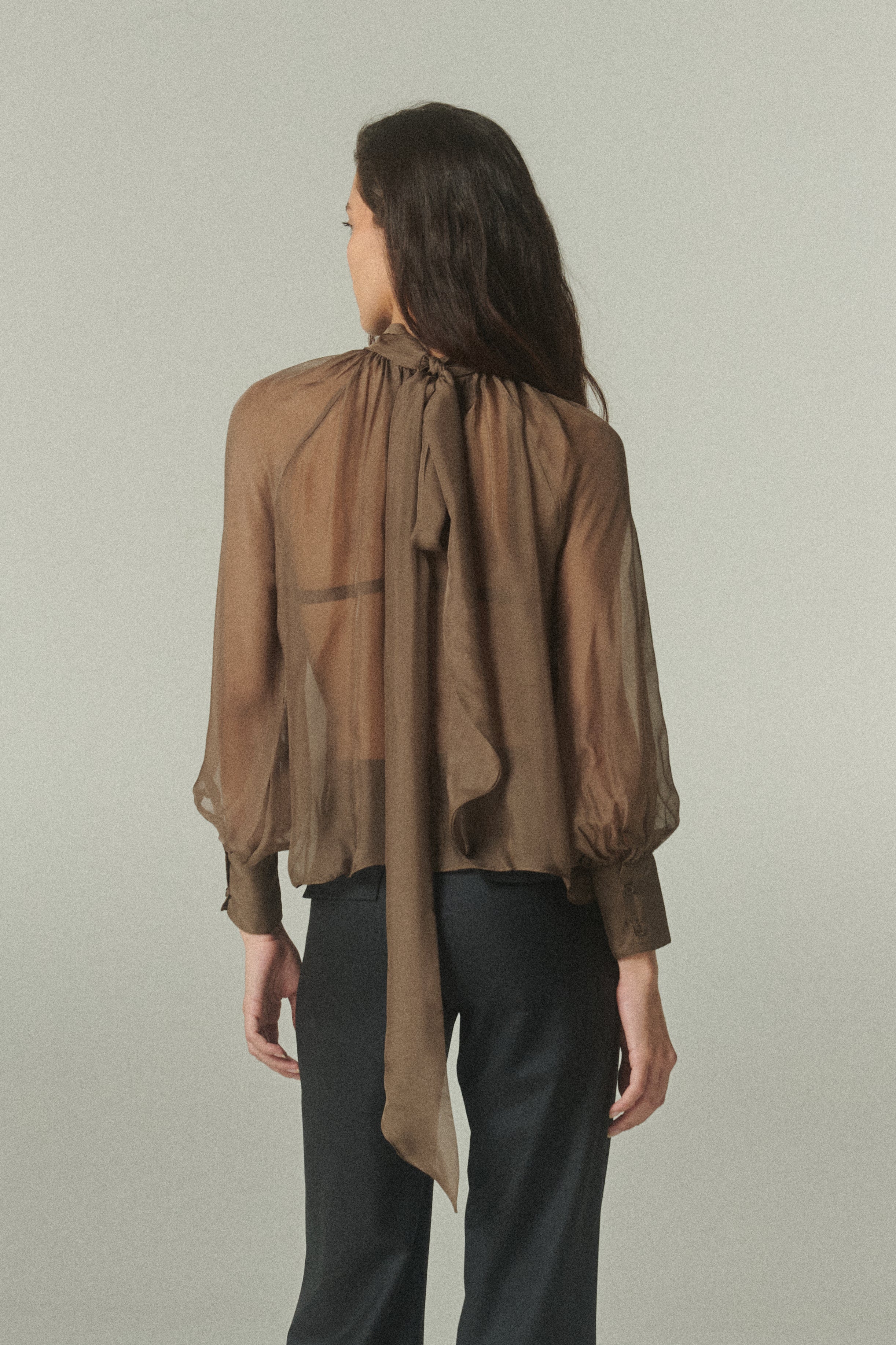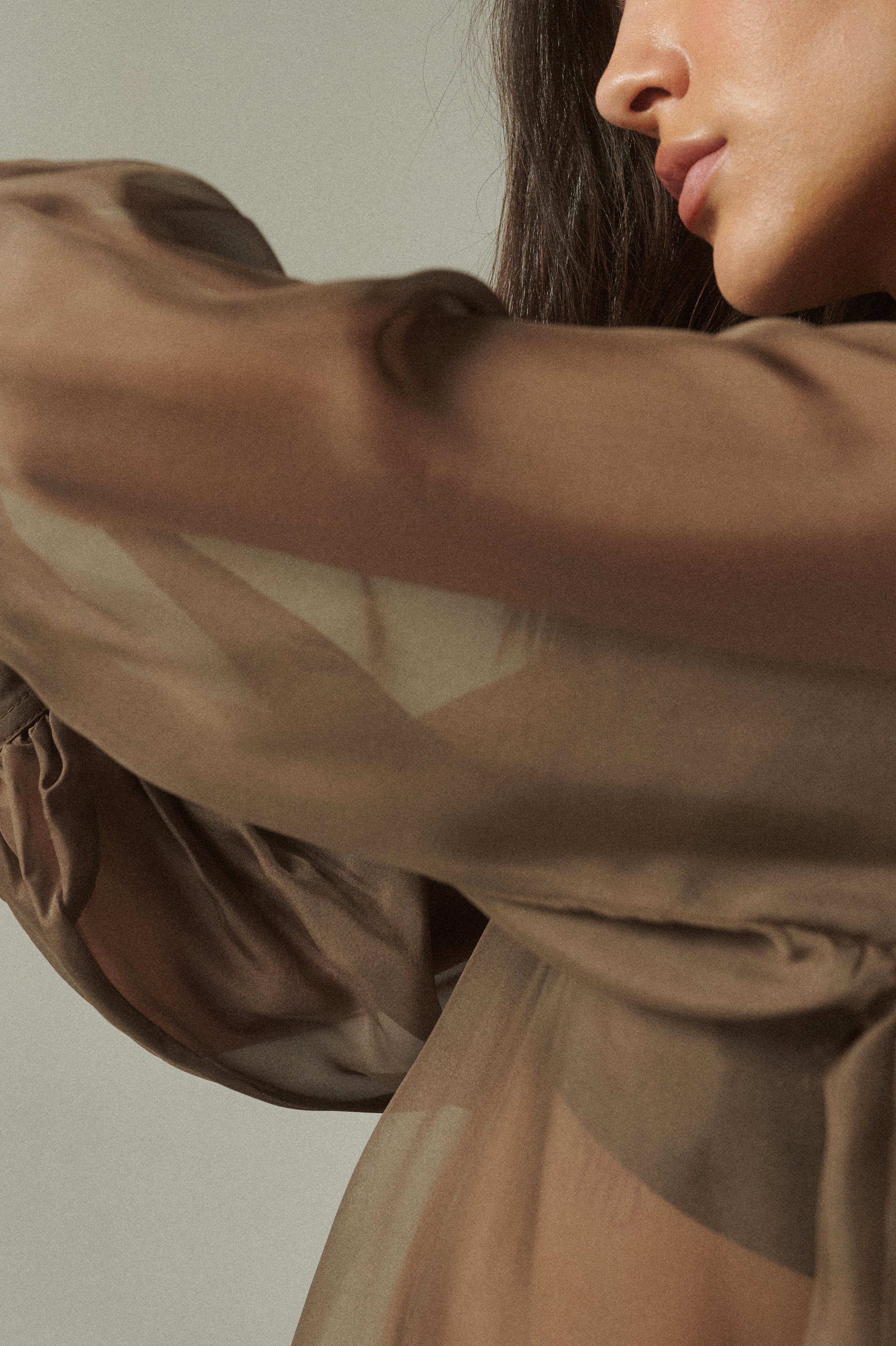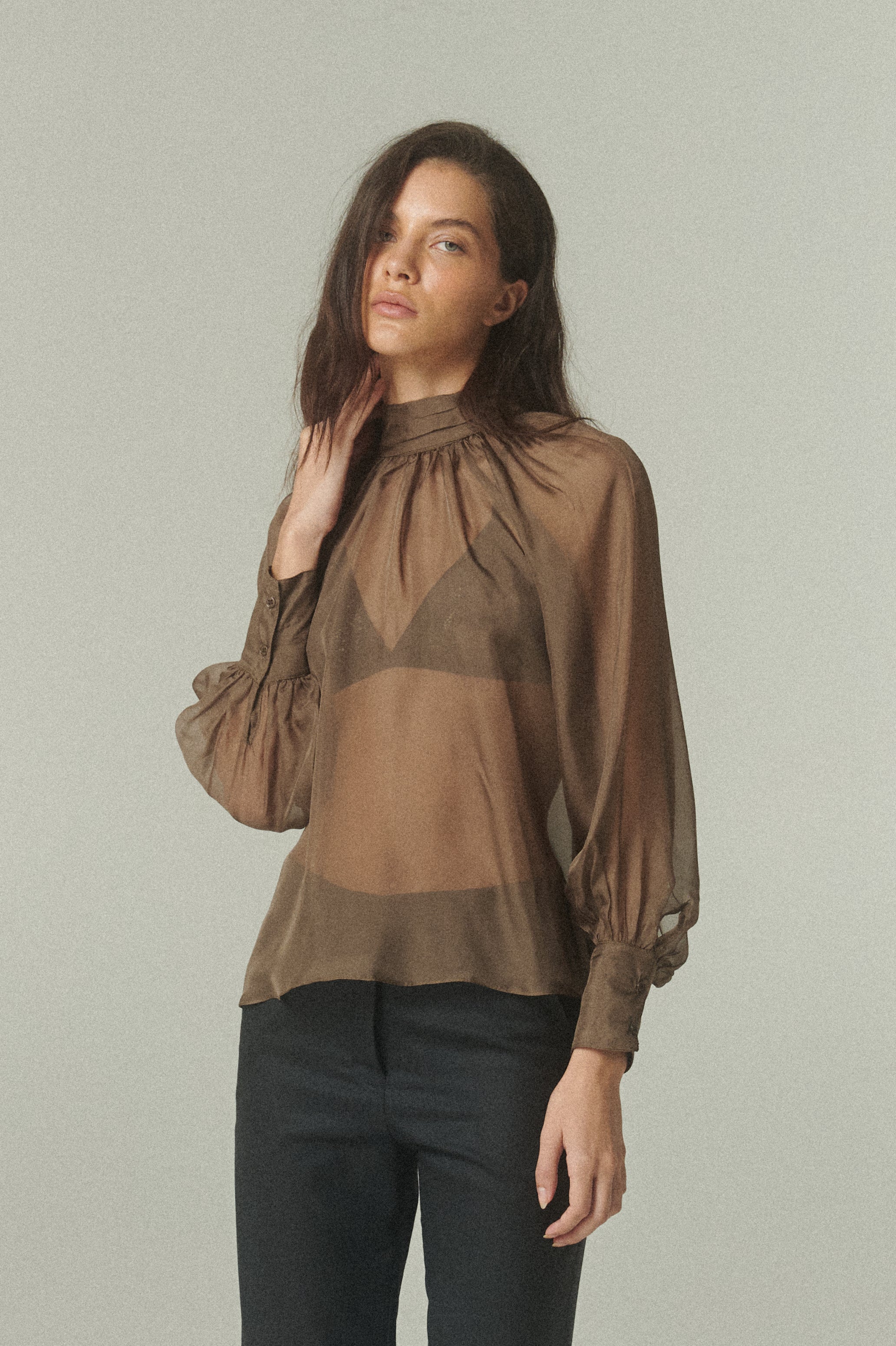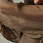 Nuestra Blusa Manuela es una propuesta romántica y liviana perfecta para ocasiones especiales. Confeccionada en gasa de seda de alta calidad en color café, redefine la elegancia mediante una sofisticada transparencia.