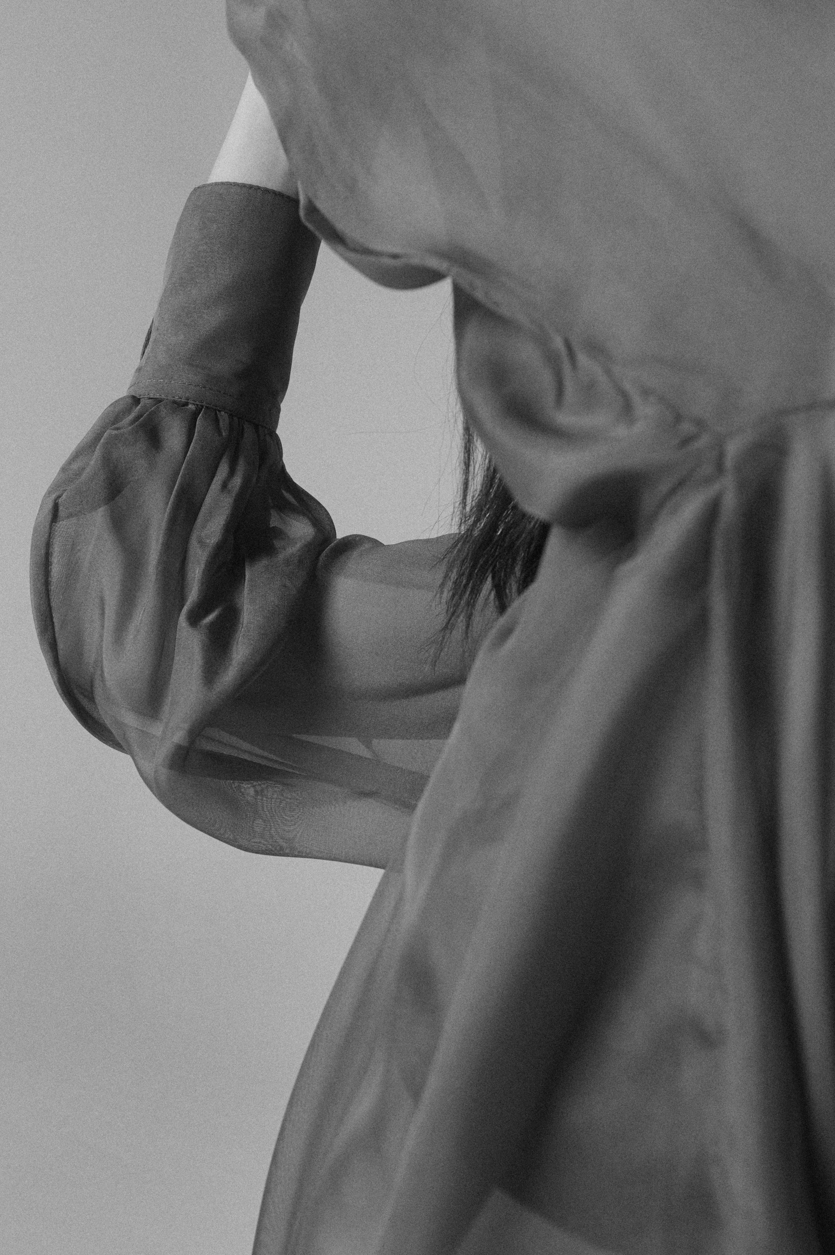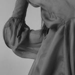 Su diseño etéreo se acompaña de un elegante cuello alto con un sutil drapeado y una amarra ajustable en la espalda que permite versatilidad en su uso. Las mangas voluminosas con puños agregan un movimiento femenino en su caída impecable.