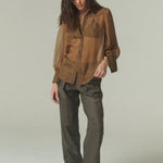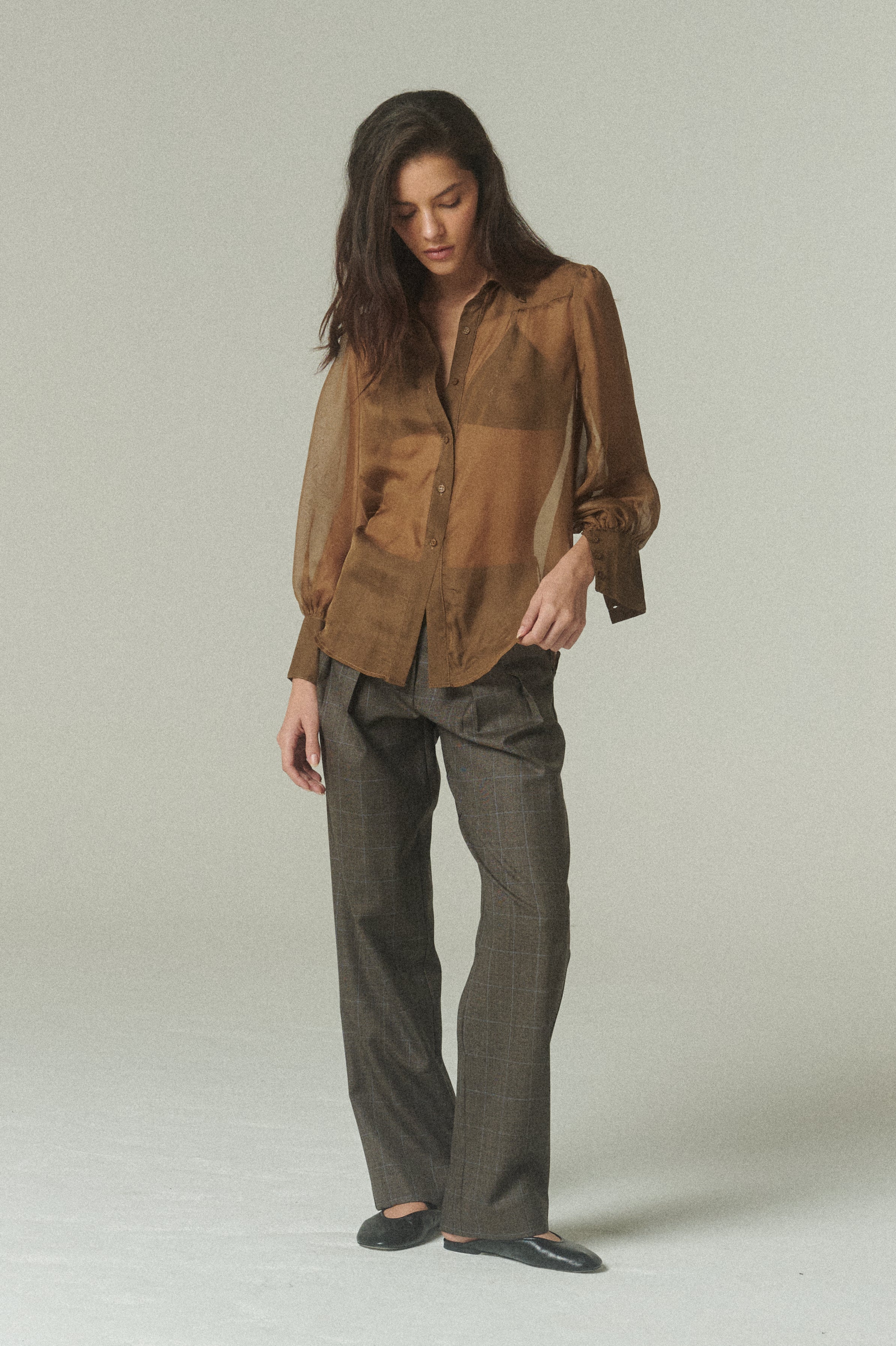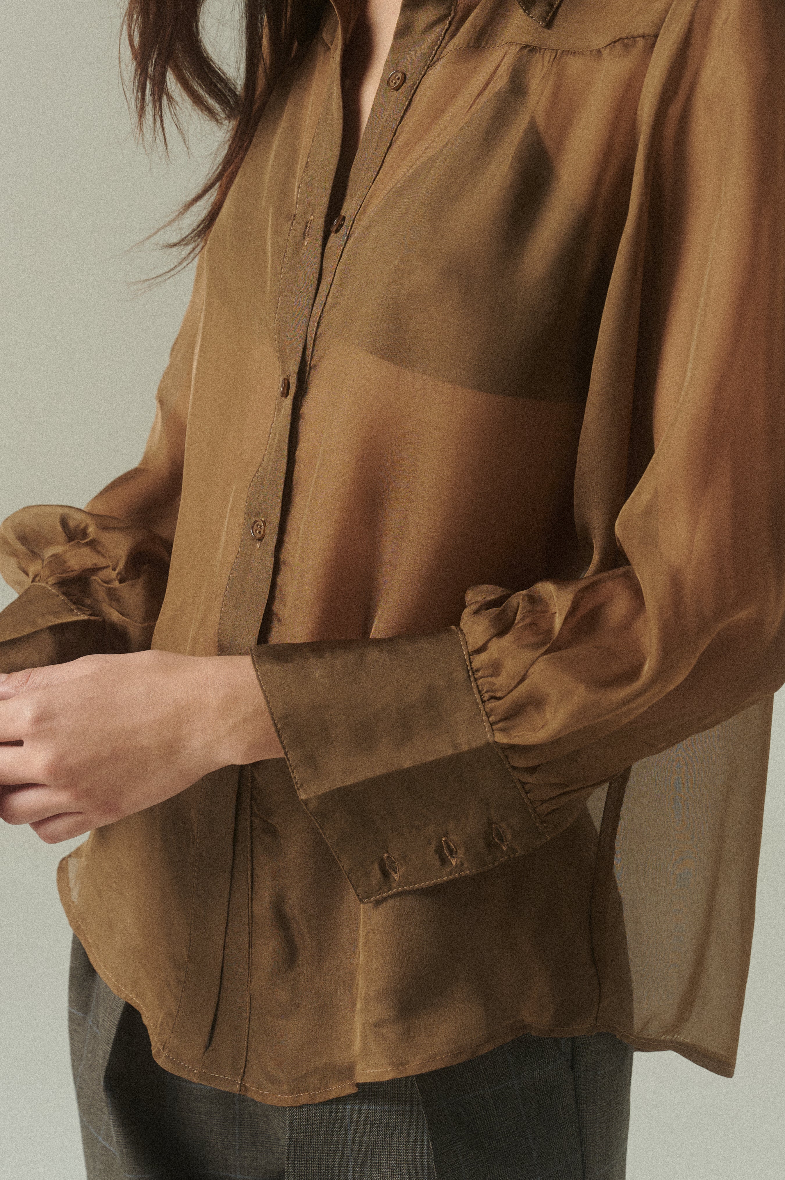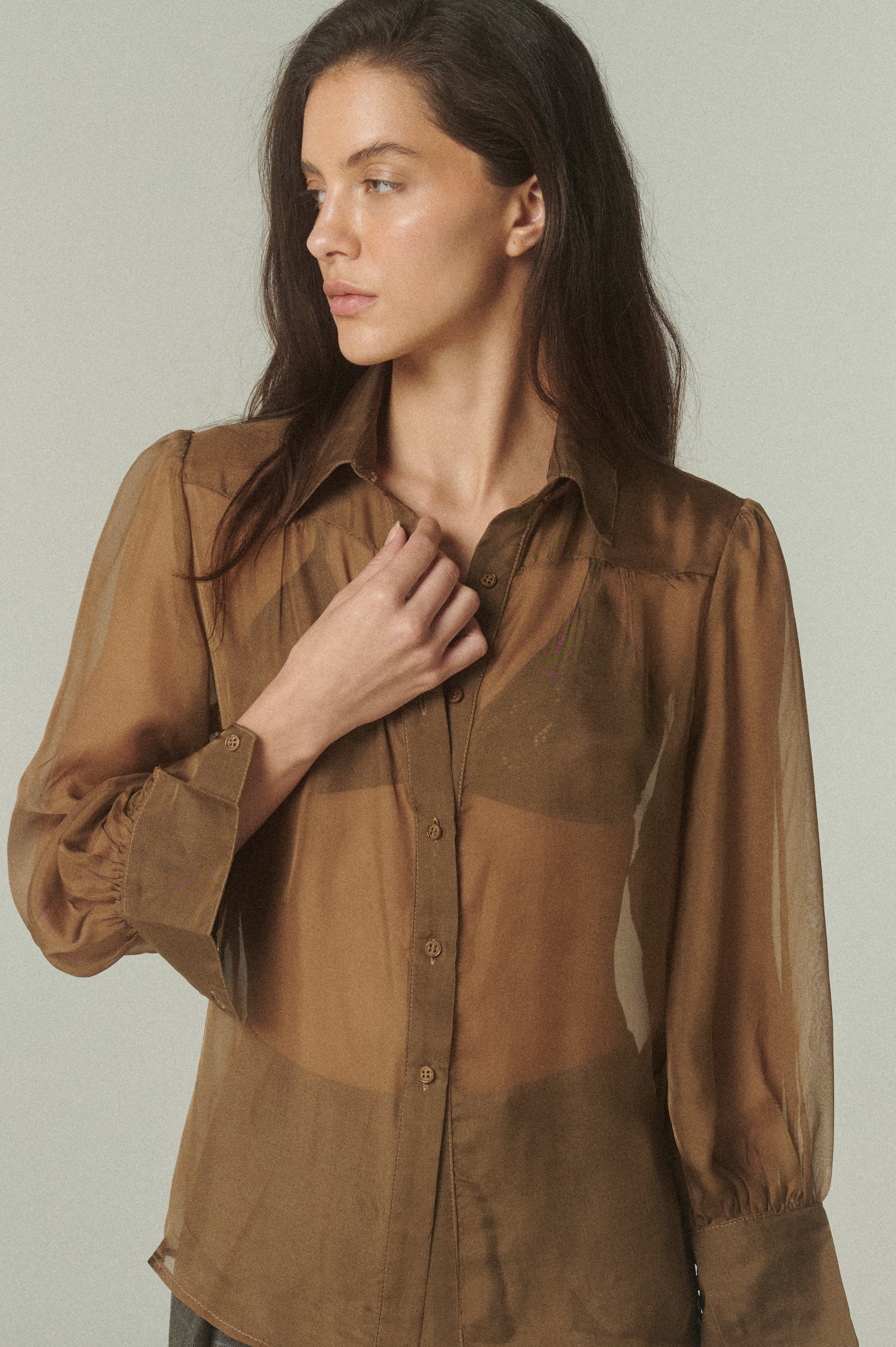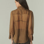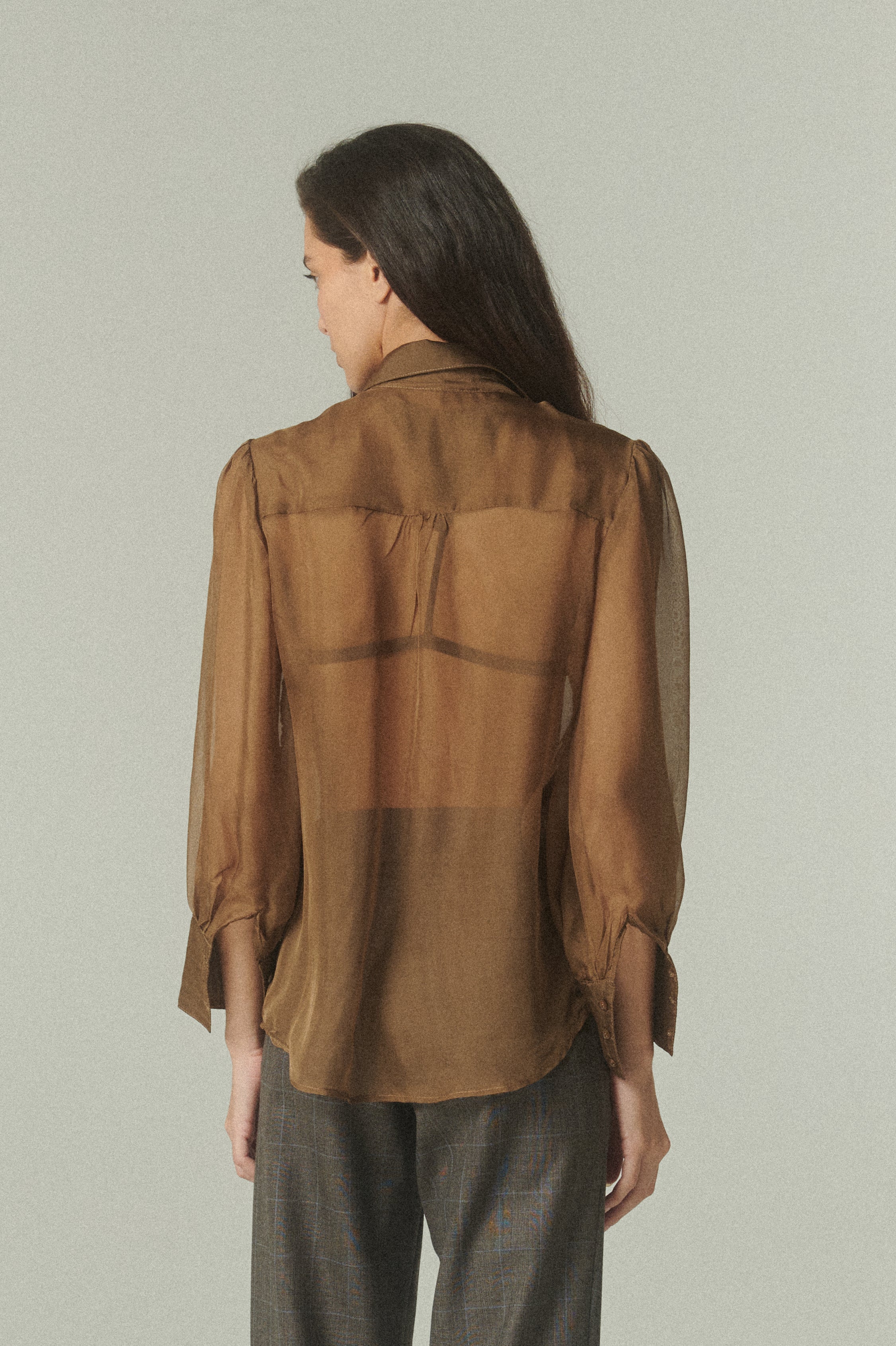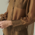 Una pieza que fusiona el corte masculino con la delicadeza de la fina gasa de seda. Su diseño destaca por una sofisticada transparencia y un tono verde profundo, logrando el equilibrio perfecto entre estructura y fluidez para ocasiones especiales o para elevar looks cotidianos.