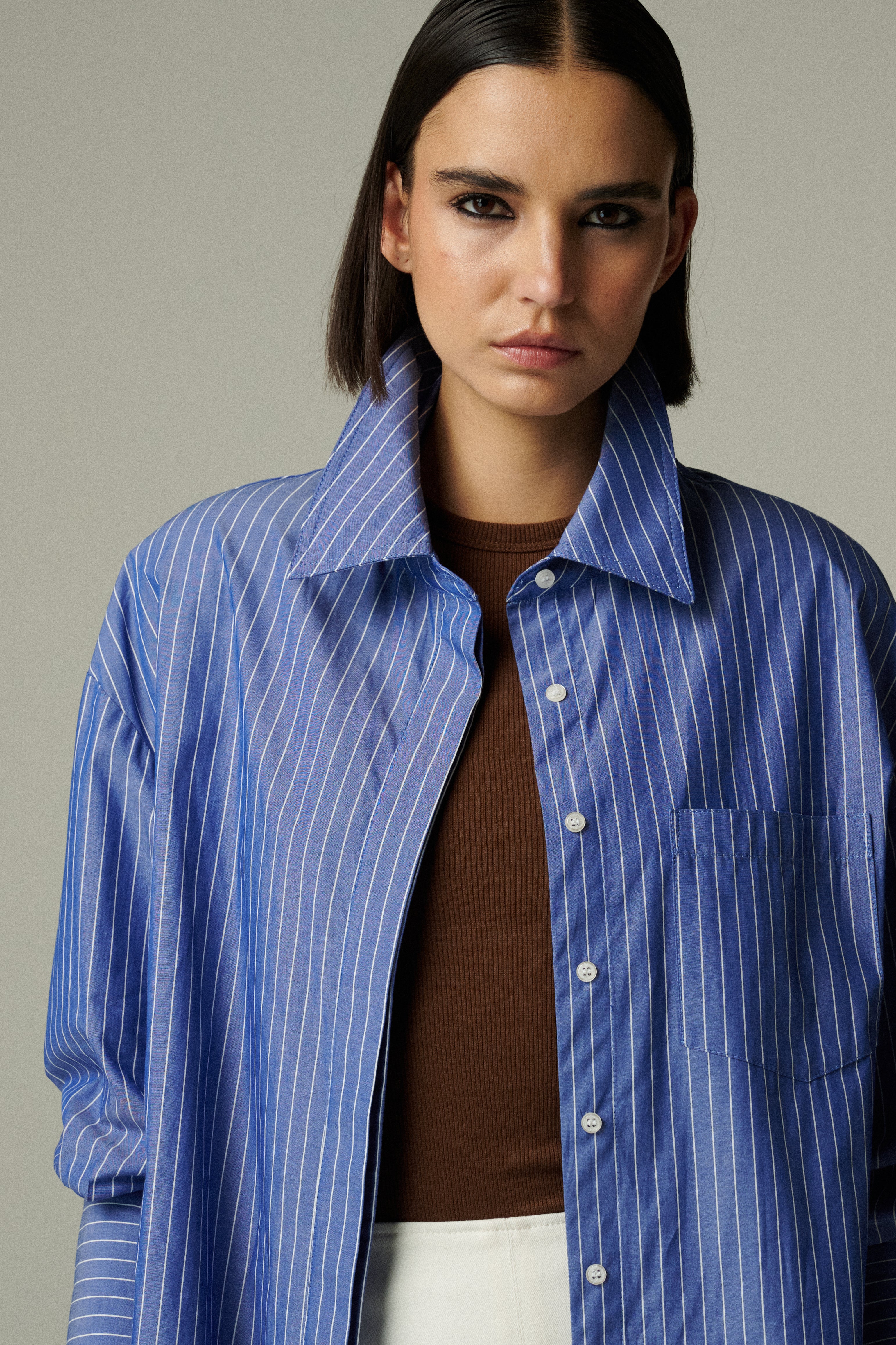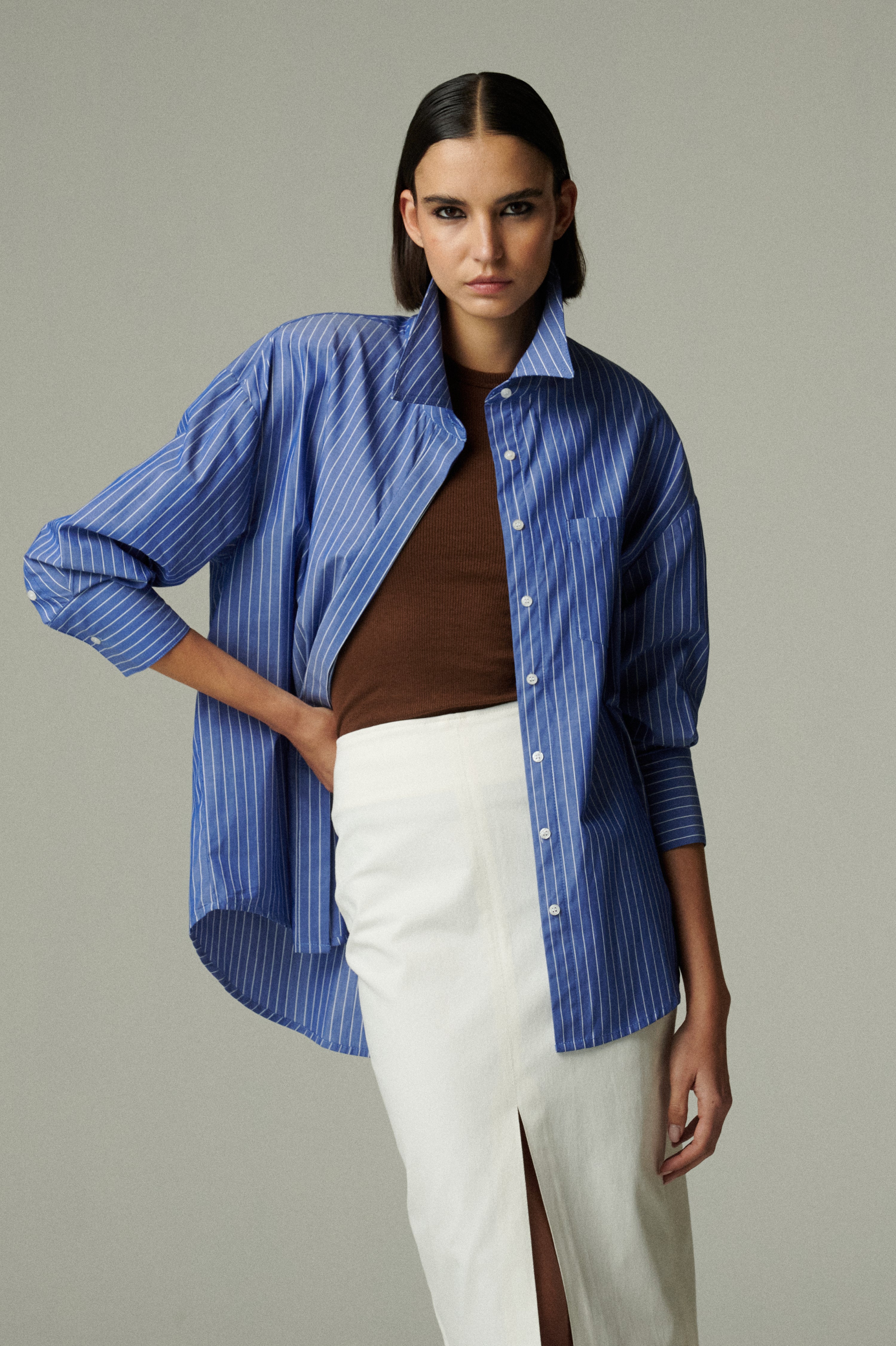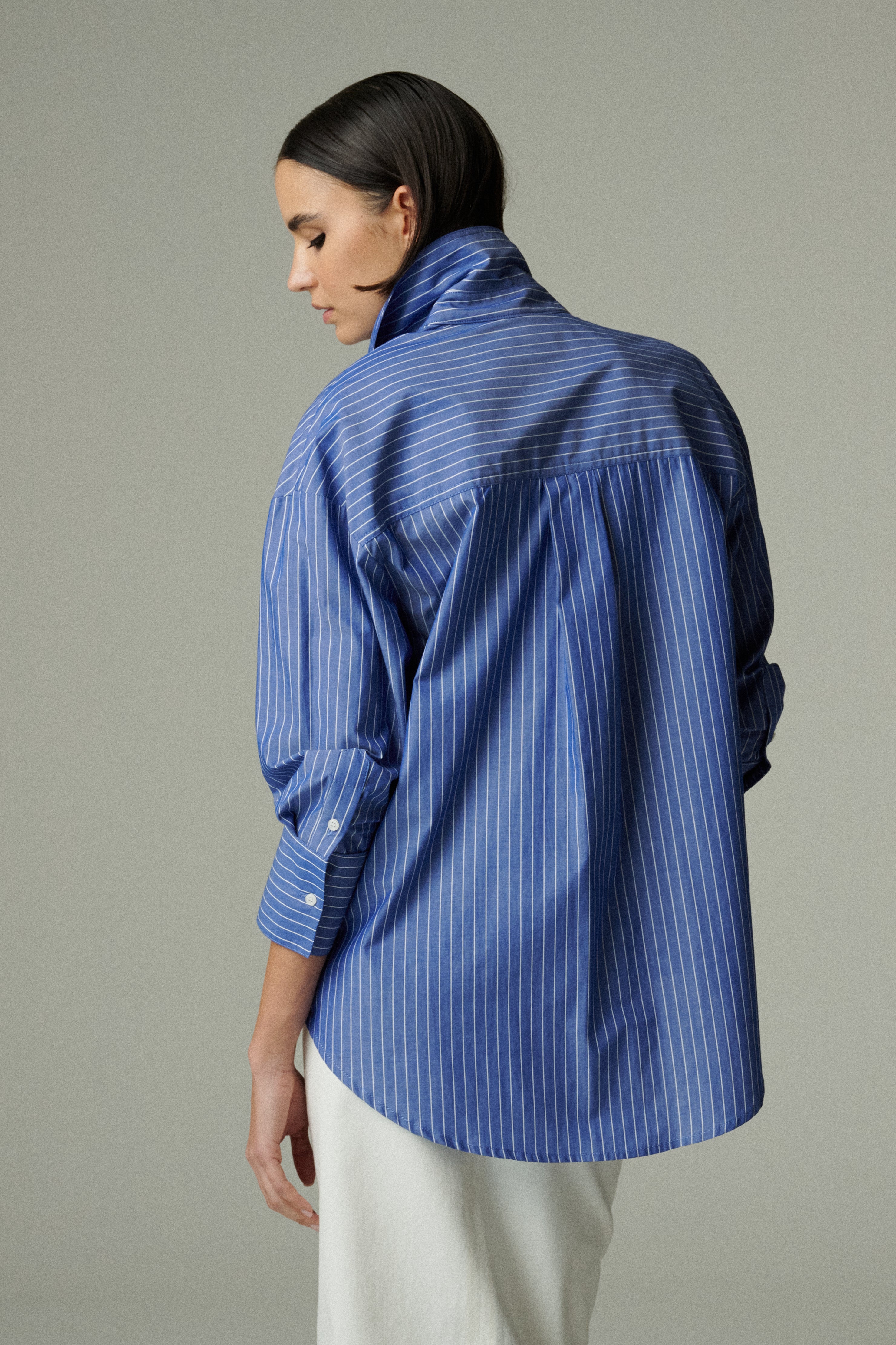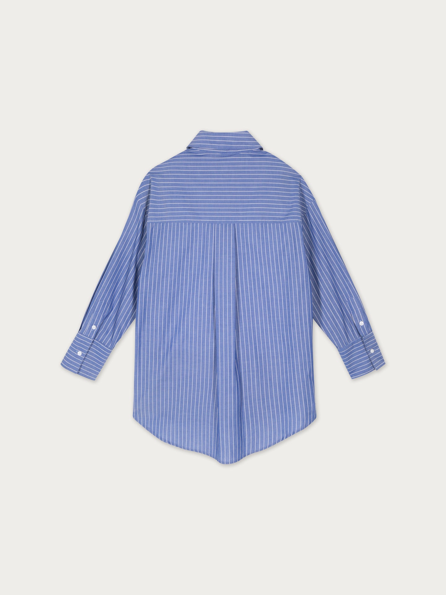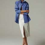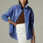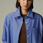 Camisa oversize confeccionada en popelina 100% de algodón azul rayado. Su diseño se mueve entre lo femenino y lo masculino. Funciona como prenda principal o para agregar capas en distintos looks. Versátil y atemporal, combina fácilmente con todo tipo de prendas, en diferentes estilos y ocasiones.