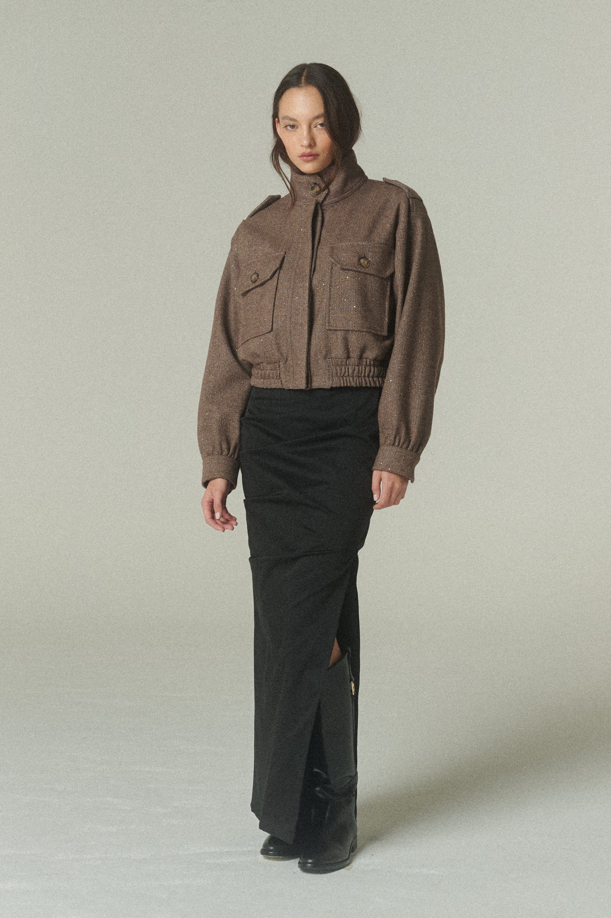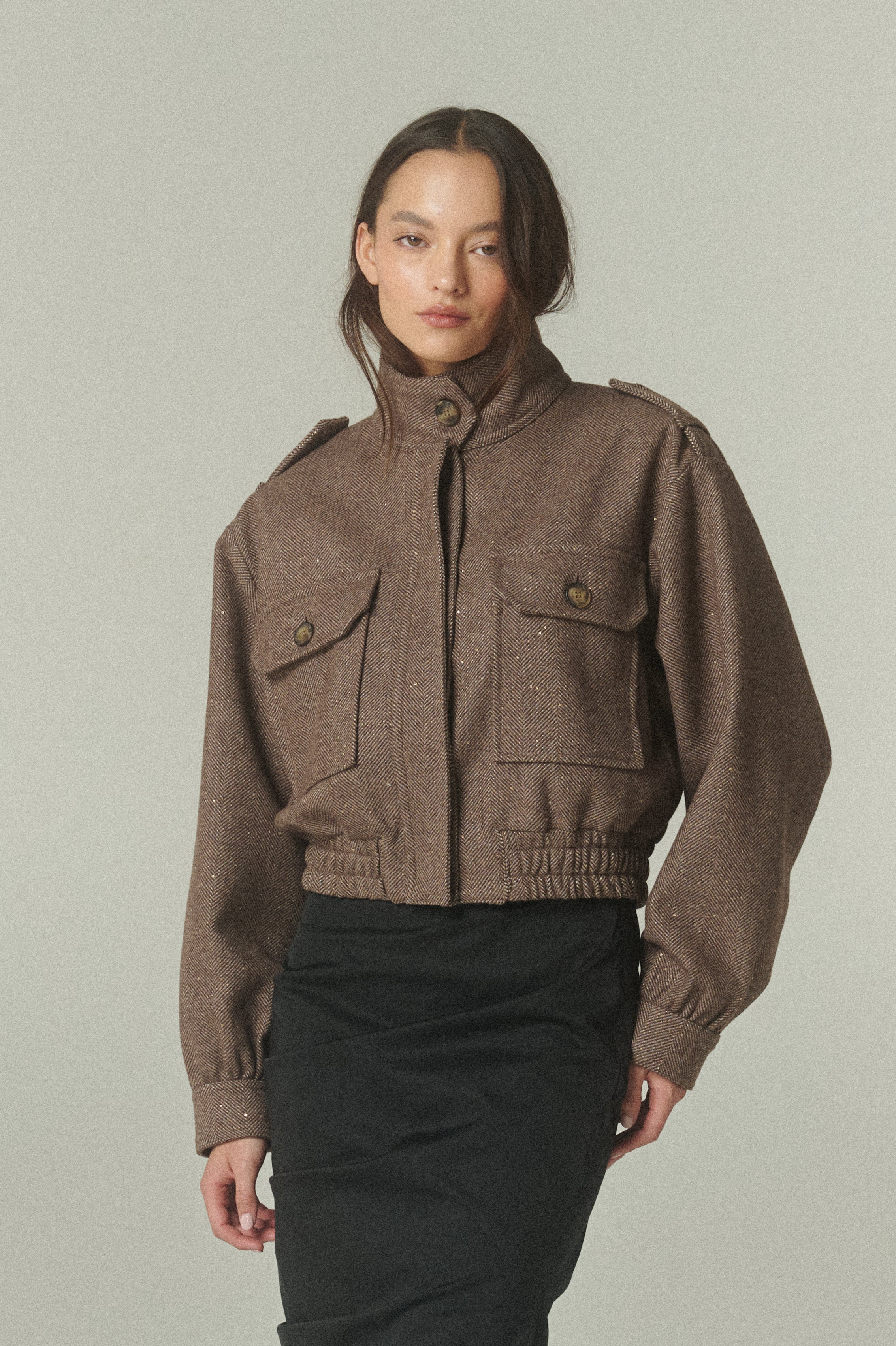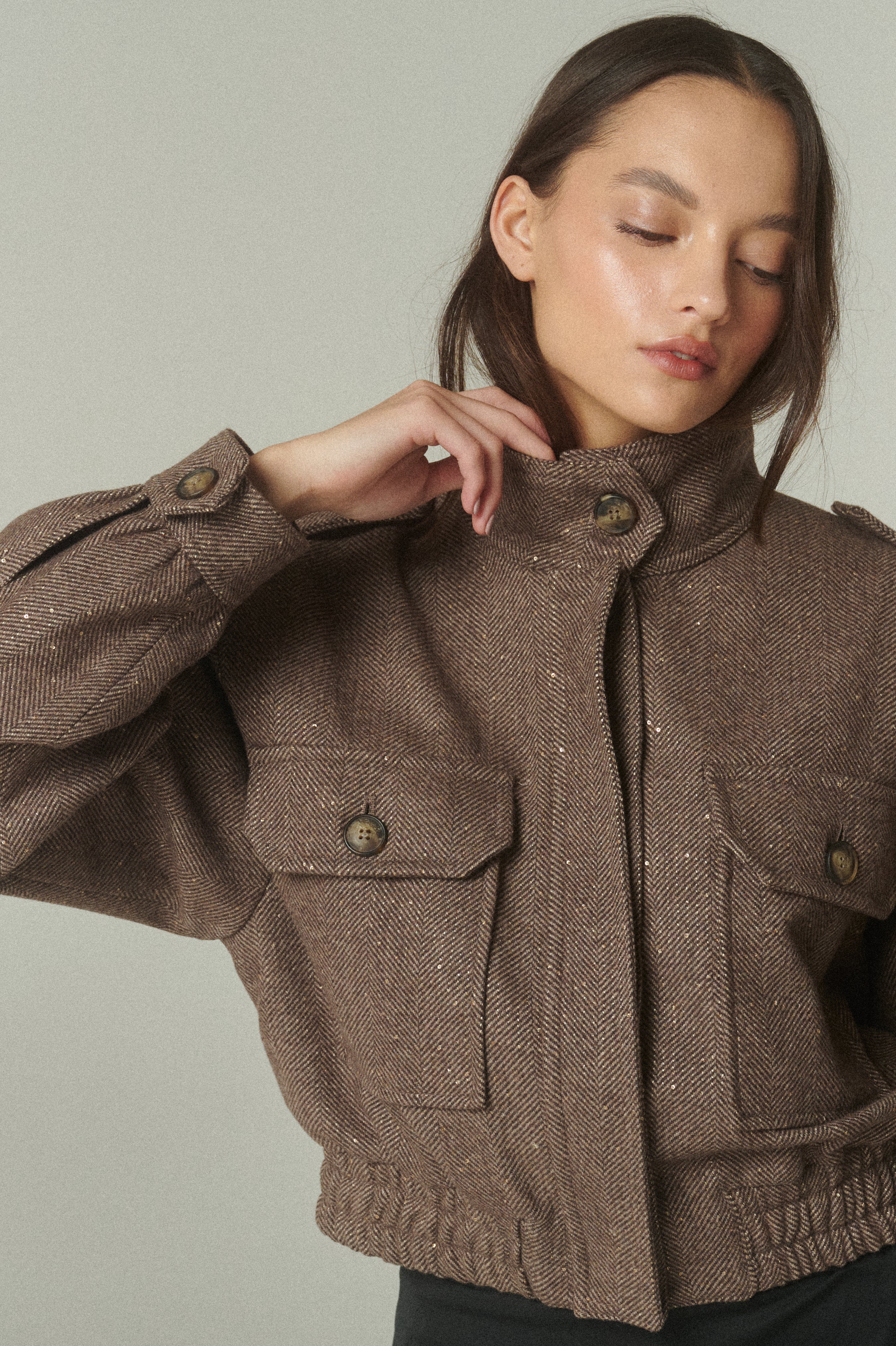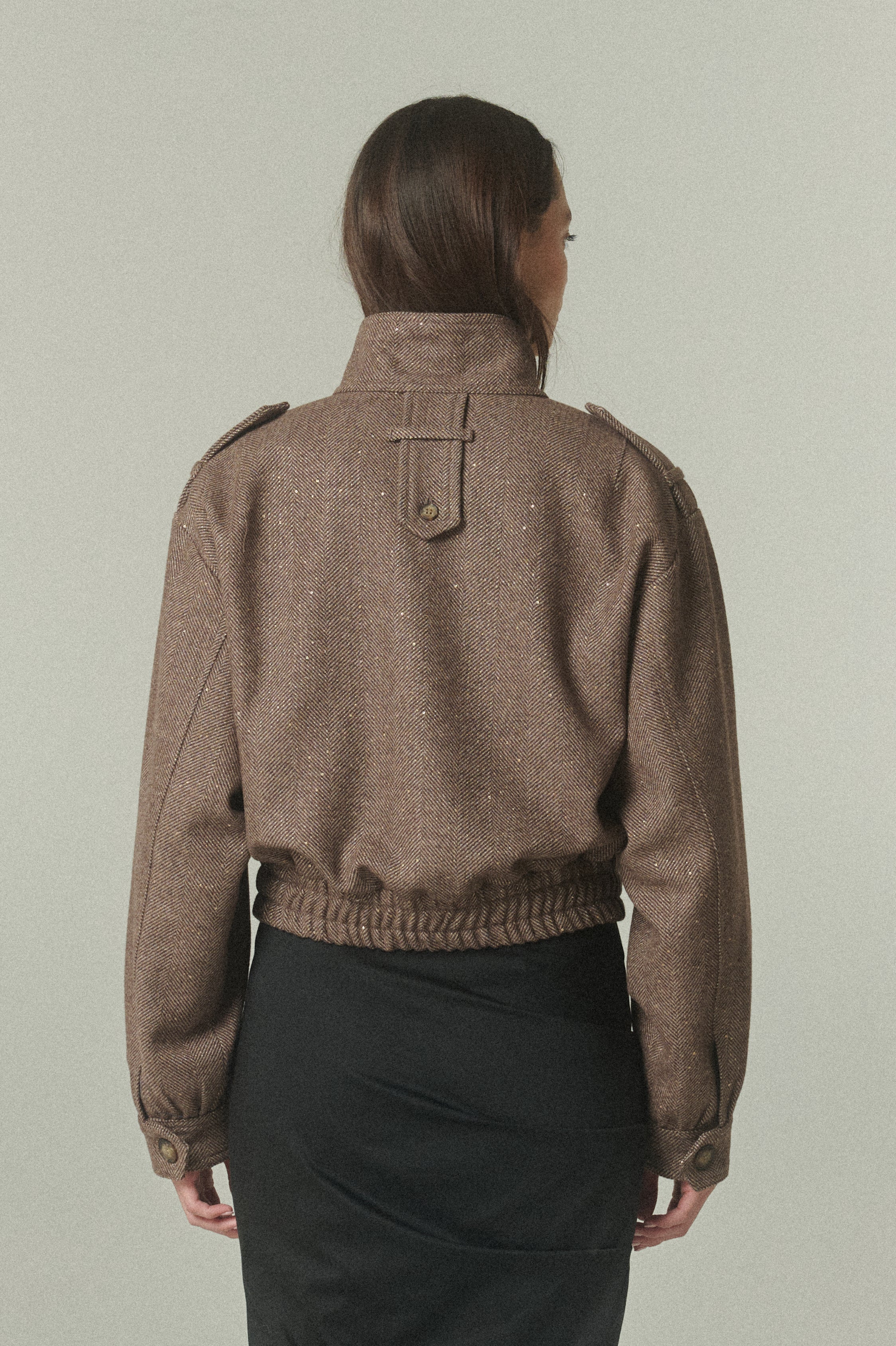 Abrigo, presencia y contemporaneidad. Nuestra Chaqueta Bomber Tweed Café, confeccionada en lana de alta calidad, propone una interesante combinación entre estructura y modernidad. Su diseño toma la silueta actual de una bomber y la traslada a un patrón de abrigo clásico.