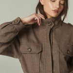 De forma relajada y levemente englobada, la chaqueta destaca por sus mangas con carácter y su cuello alto y cerrado, que aporta presencia y personalidad. La pieza se completa con detalles que marcan la diferencia: grandes bolsillos con tapetas y finos botones italianos.