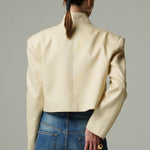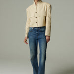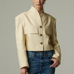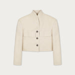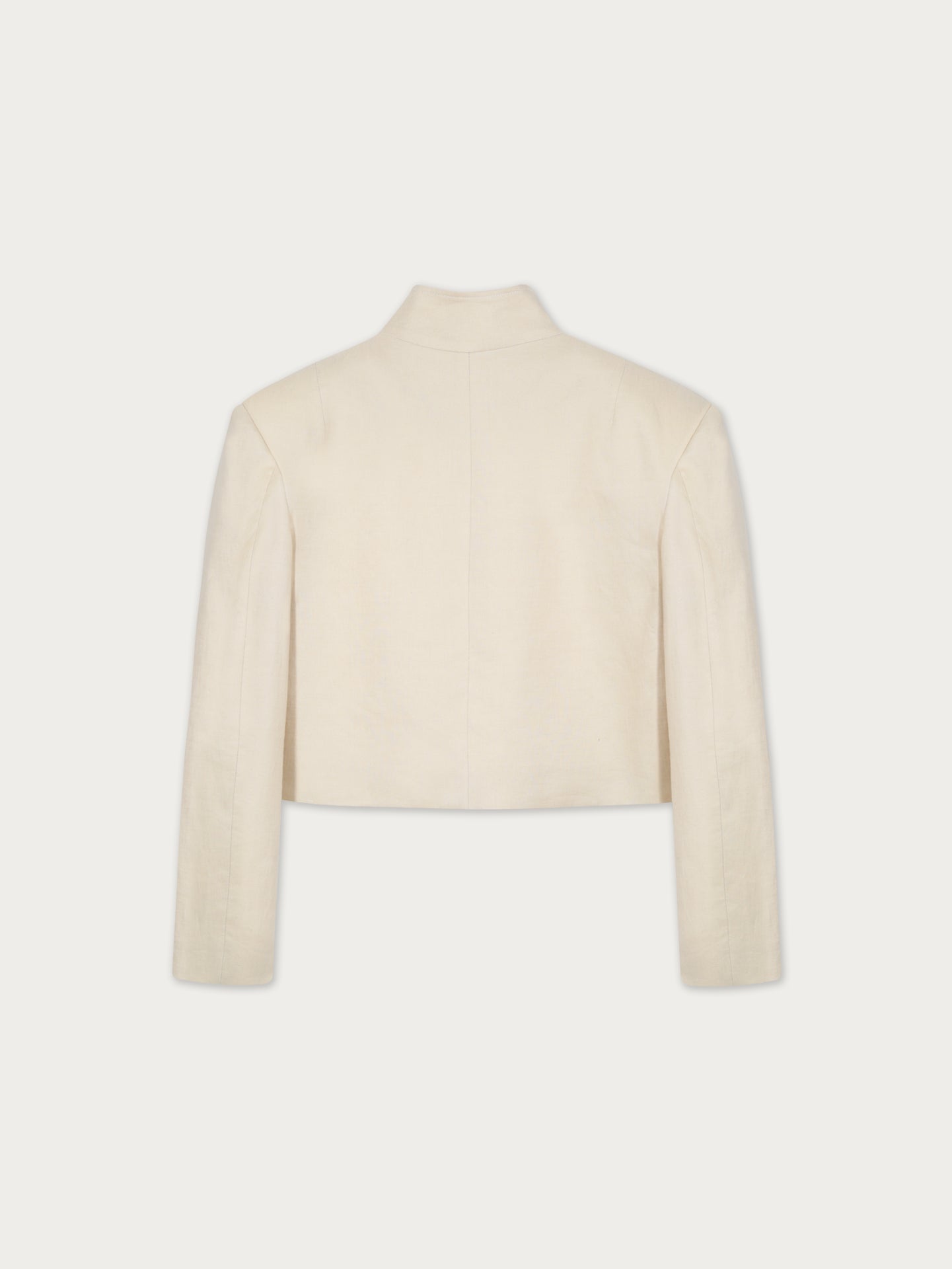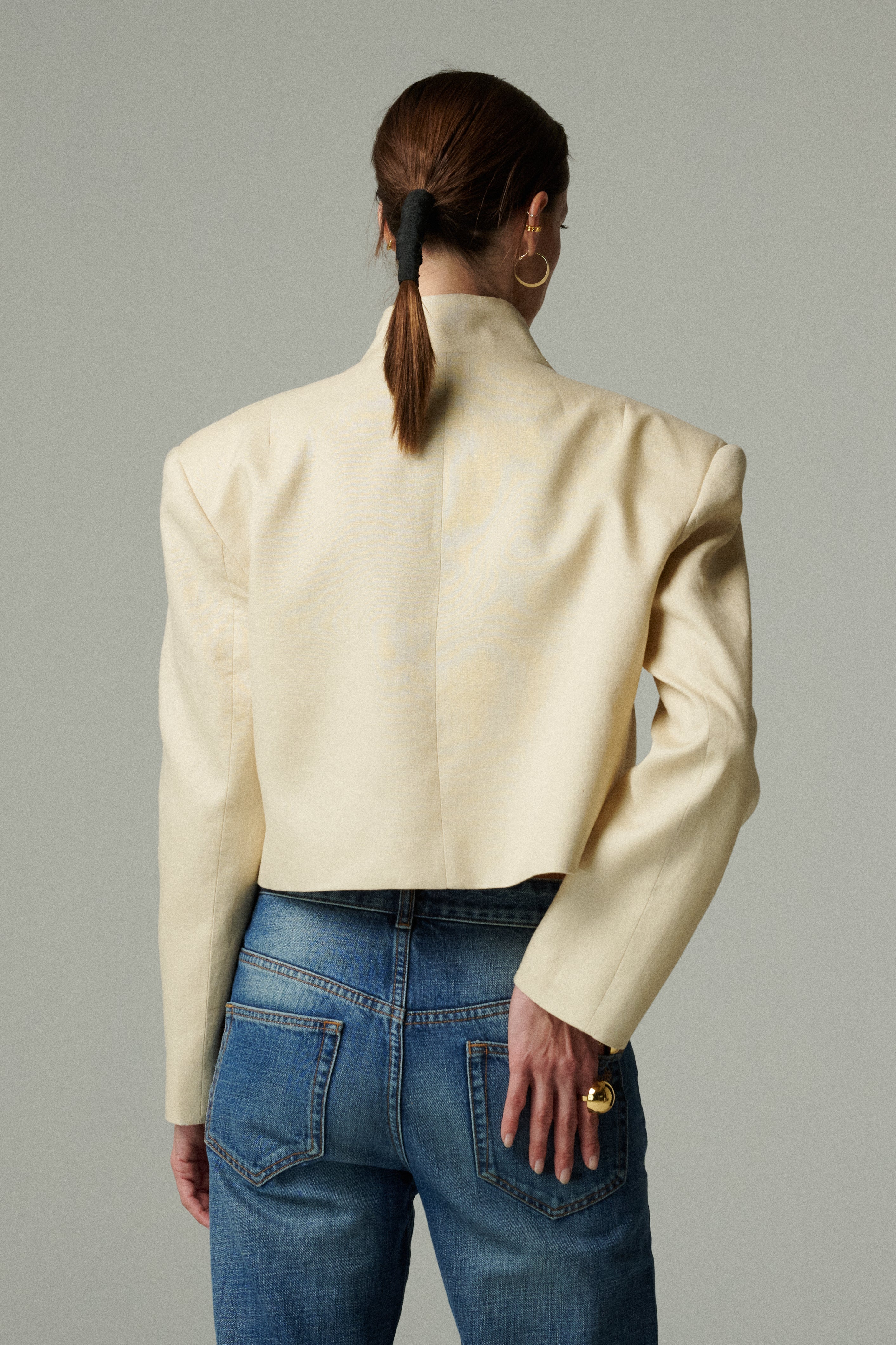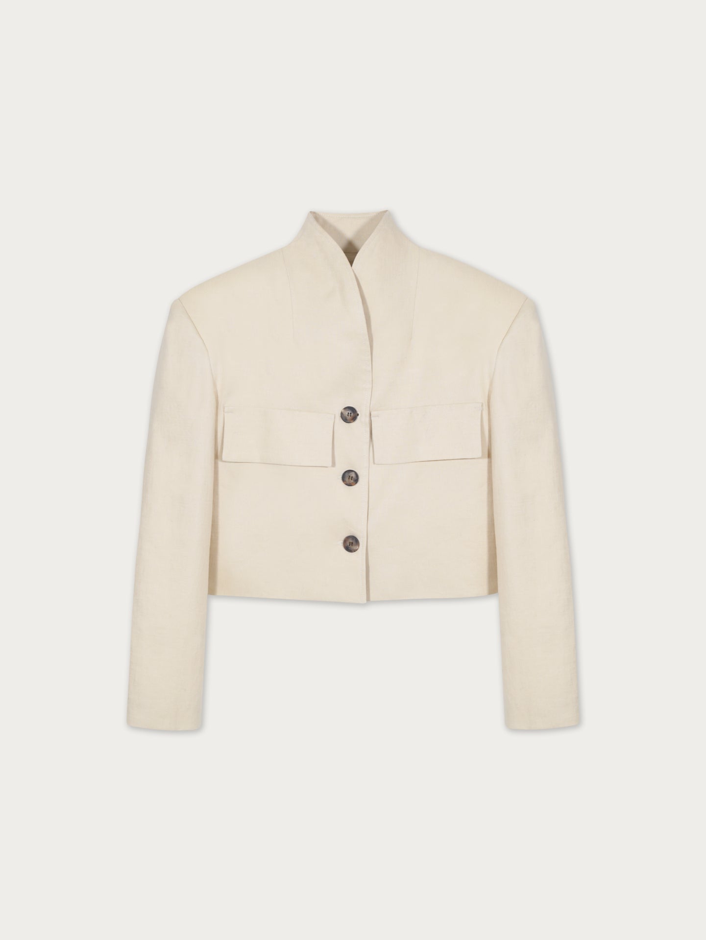 Un clásico Lalalou regresa en el color de la temporada. Confeccionada en 100% lino mantequilla, esta chaqueta es la prenda esencial para primavera-verano. Su cuello alto y estructura cuadrada, combinados con la naturalidad del lino, le dan un aire moderno y fresco a un blazer atemporal.