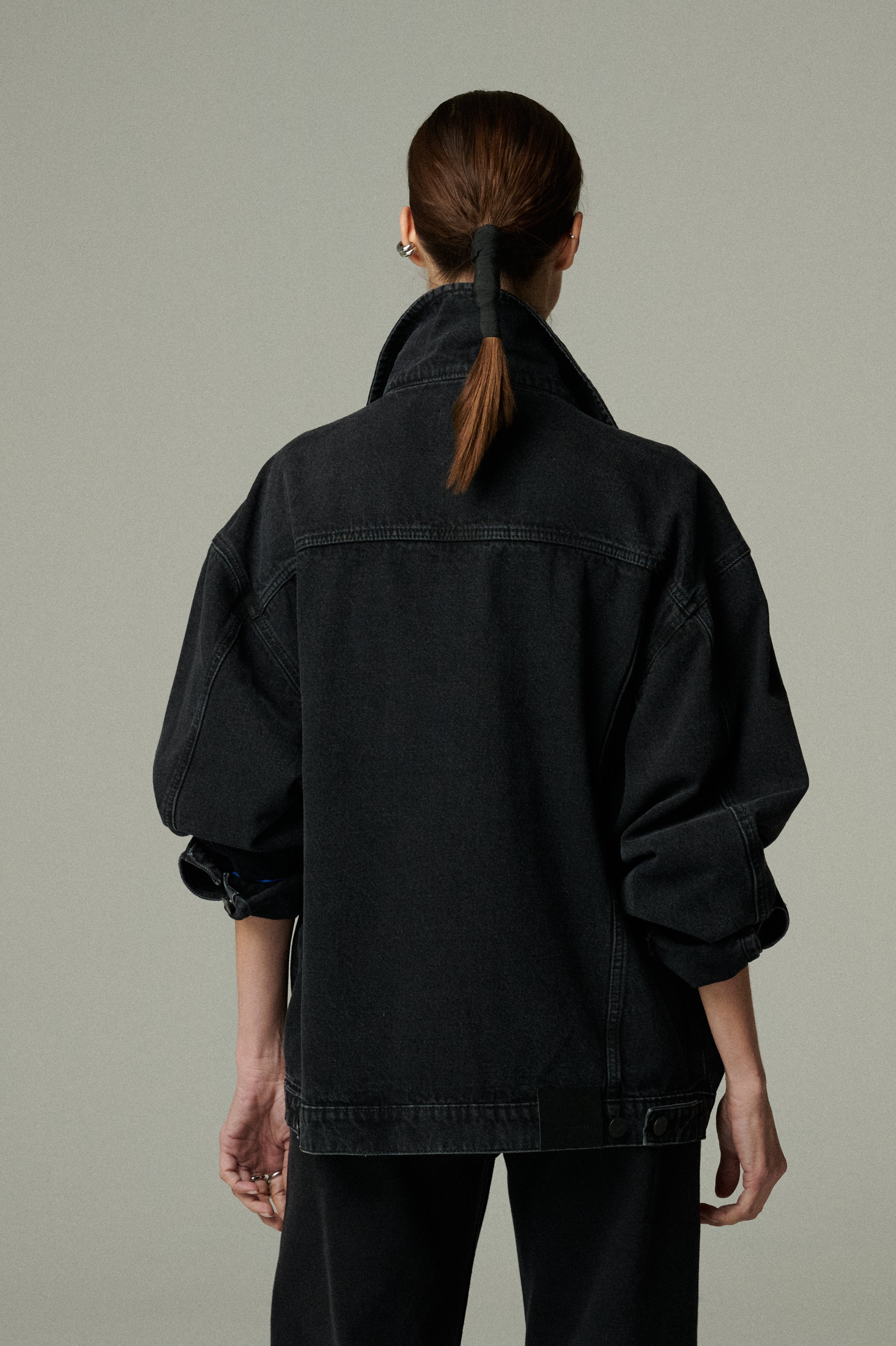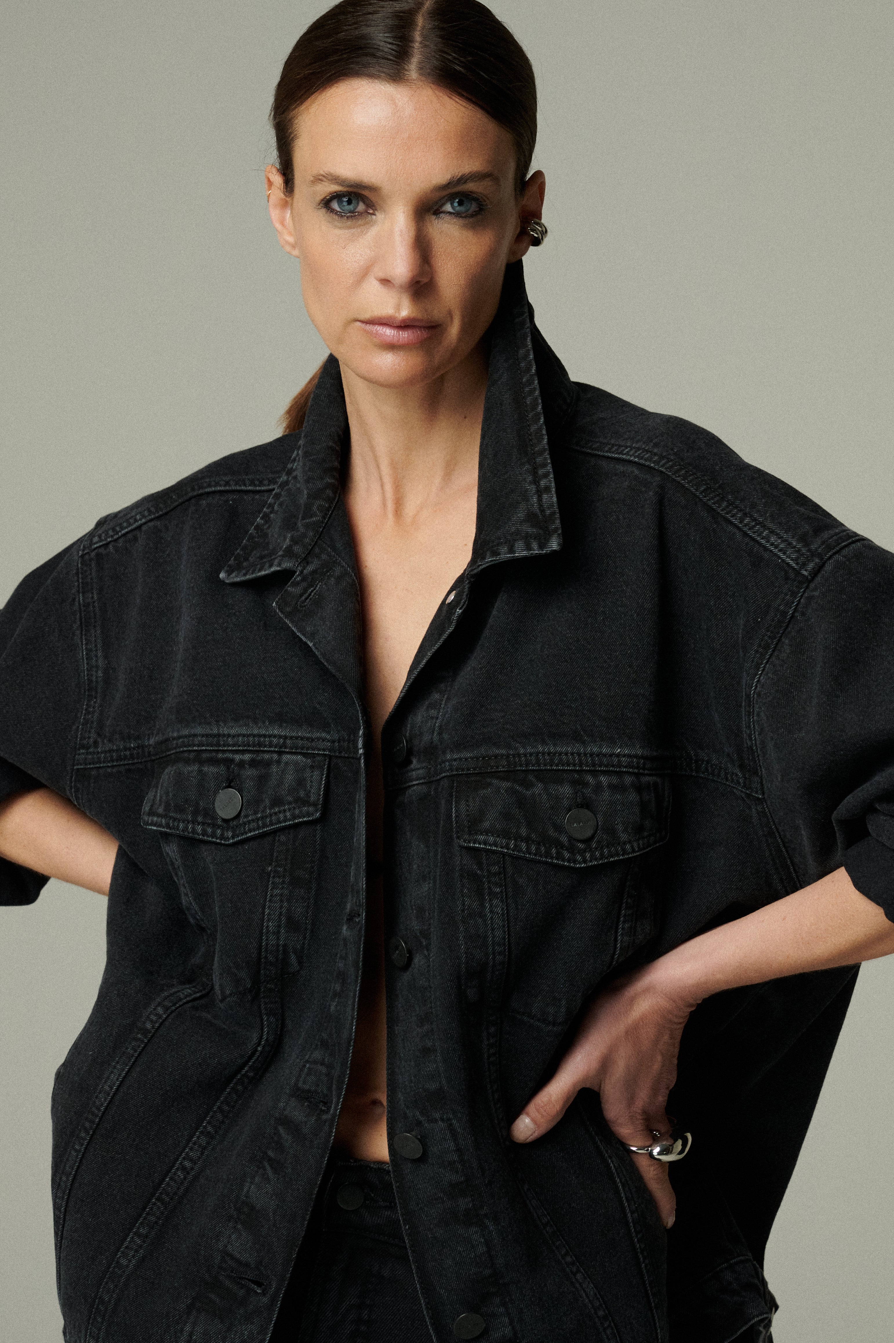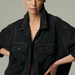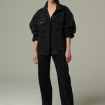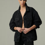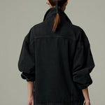 Una chaqueta de mezclilla negra oversize, diseñada para ser un clásico atemporal. Su silueta amplia la convierte en una prenda versátil y duradera, ideal para acompañar looks relajados de cualquier temporada. Un esencial que trasciende el tiempo y las tendencias.