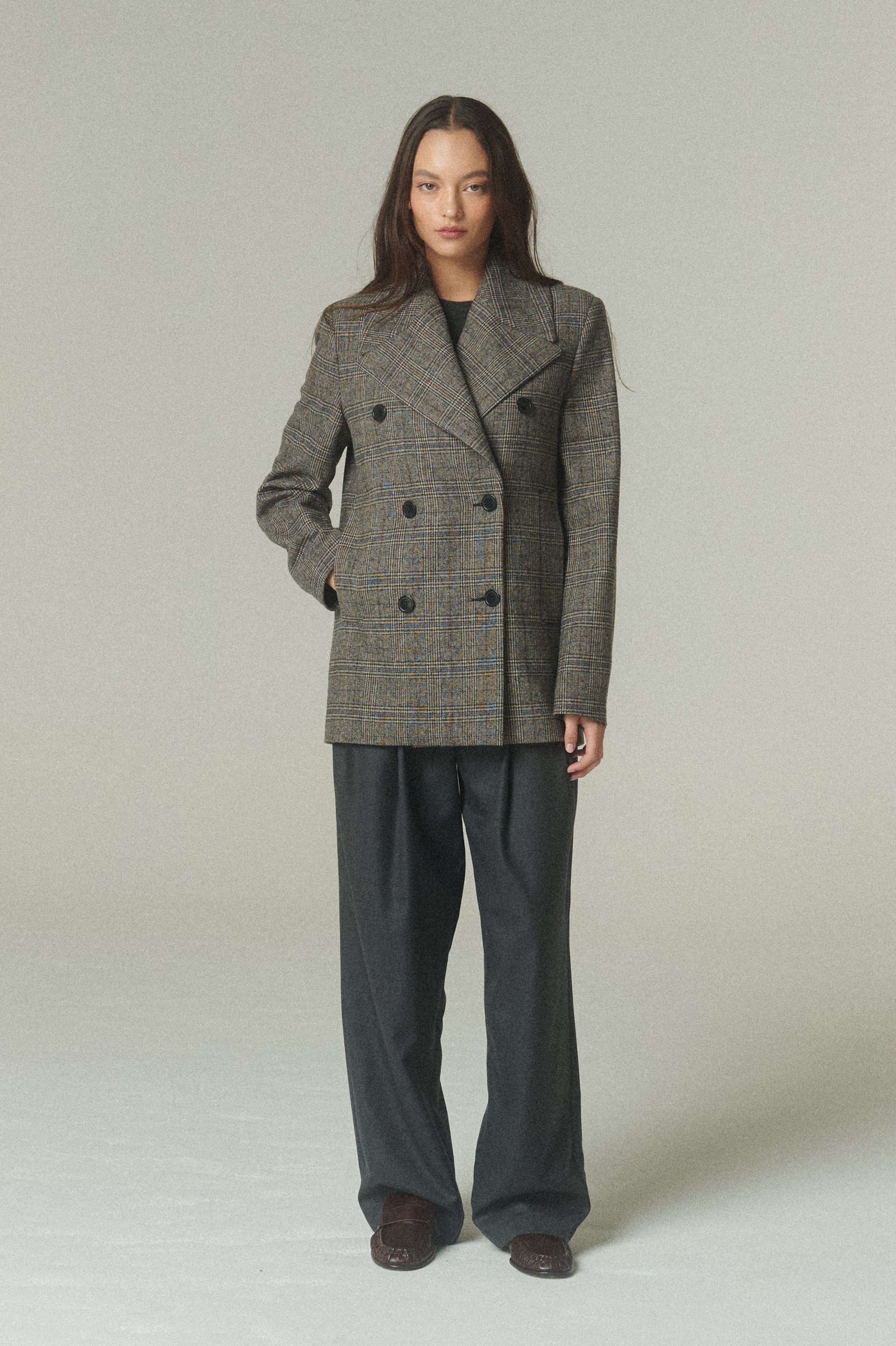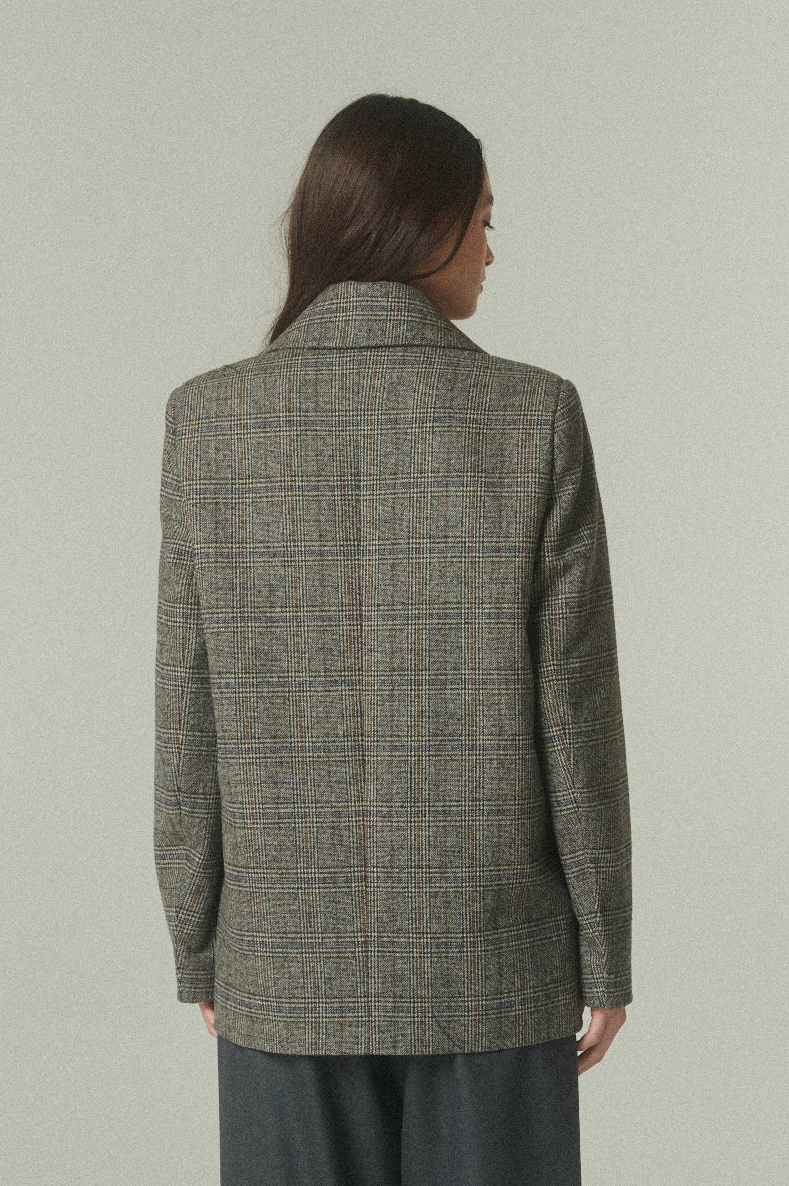 La reinterpretación del clásico chaquetón tweed escocés. Una pieza que abriga con estilo y sofisticación, combinando un calce clásico con una silueta relajada. Confeccionado en una fina tela de 100% lana, siendo el resultado de un diseño lento y ético.