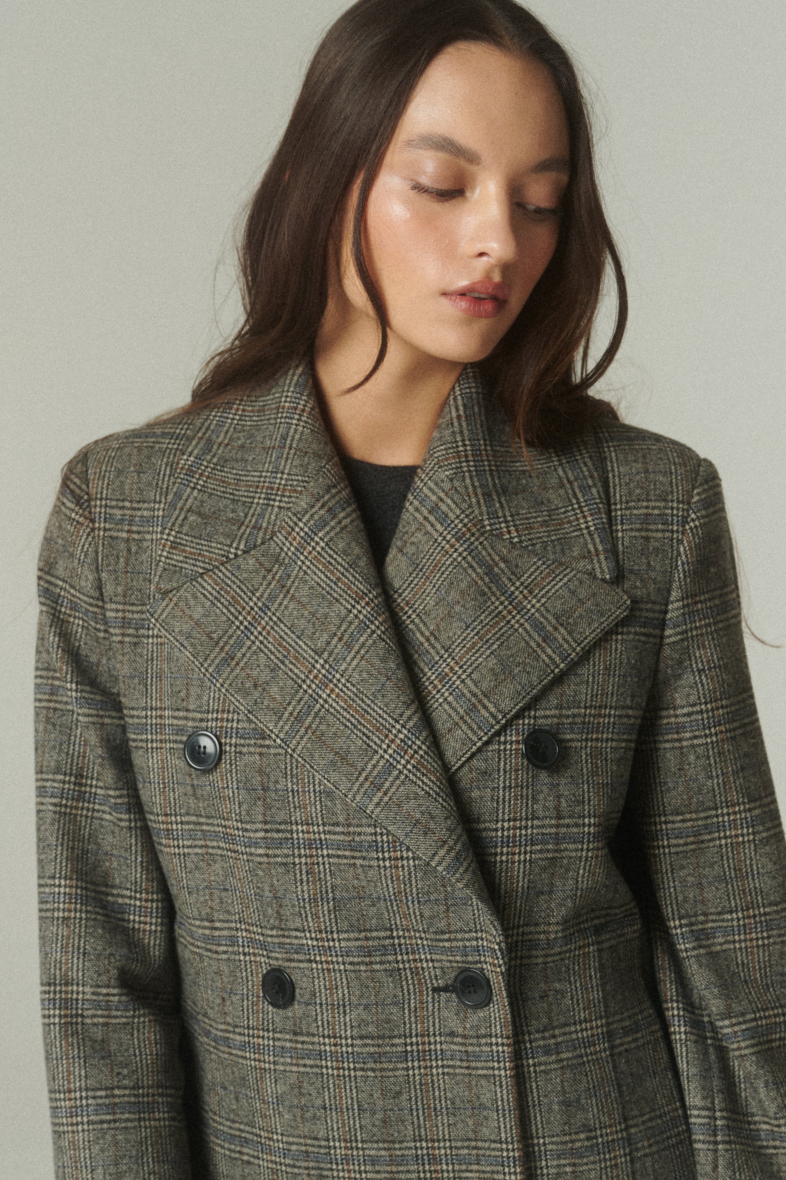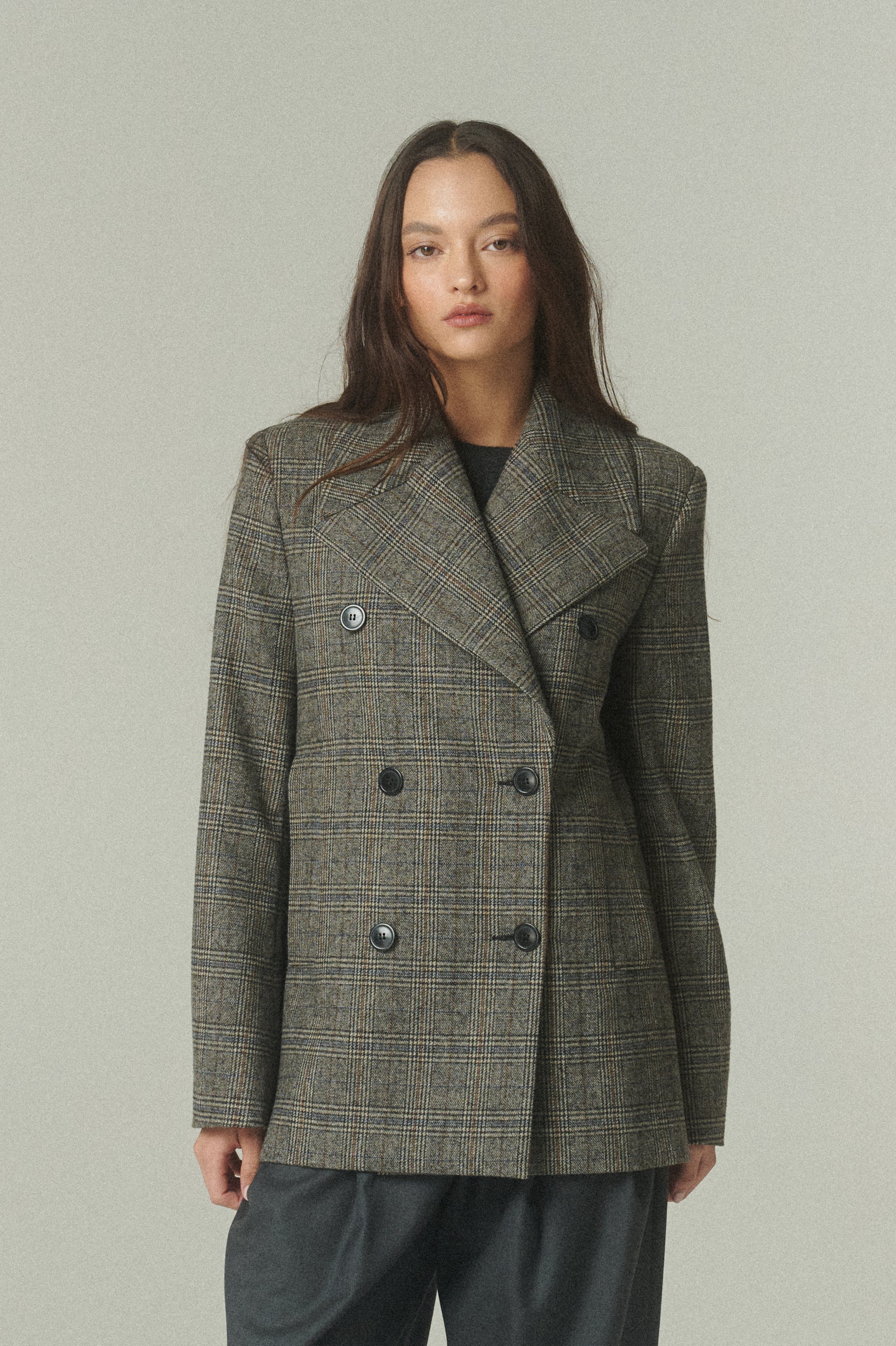 Imprescindible en un clóset de piezas únicas, este chaquetón destaca por su equilibrio entre estructura y soltura. Su gran solapa y su diseño cruzado evocan la tradición sastrera, mientras que los finos botones italianos aportan un sutil acento de elegancia.