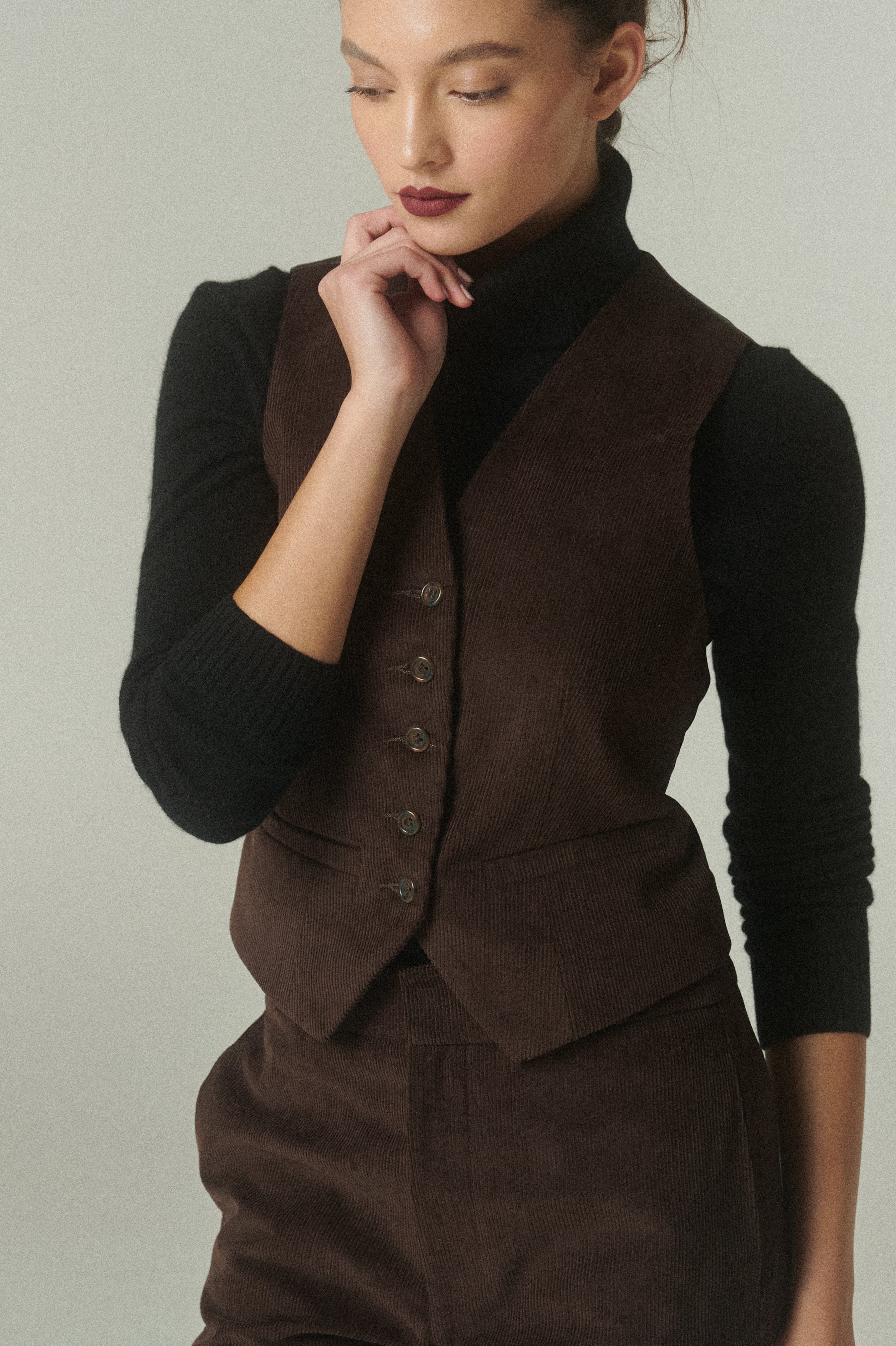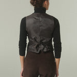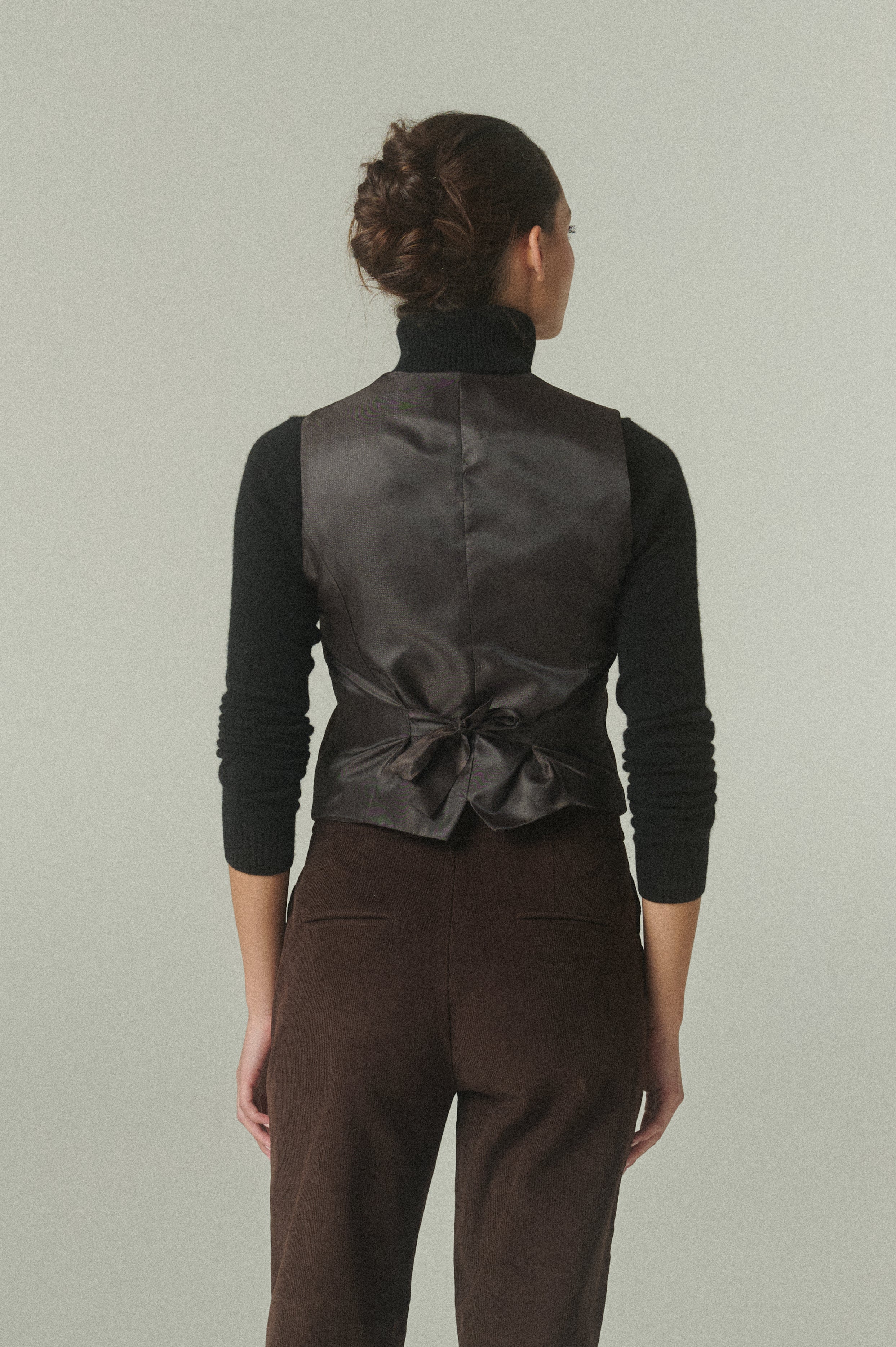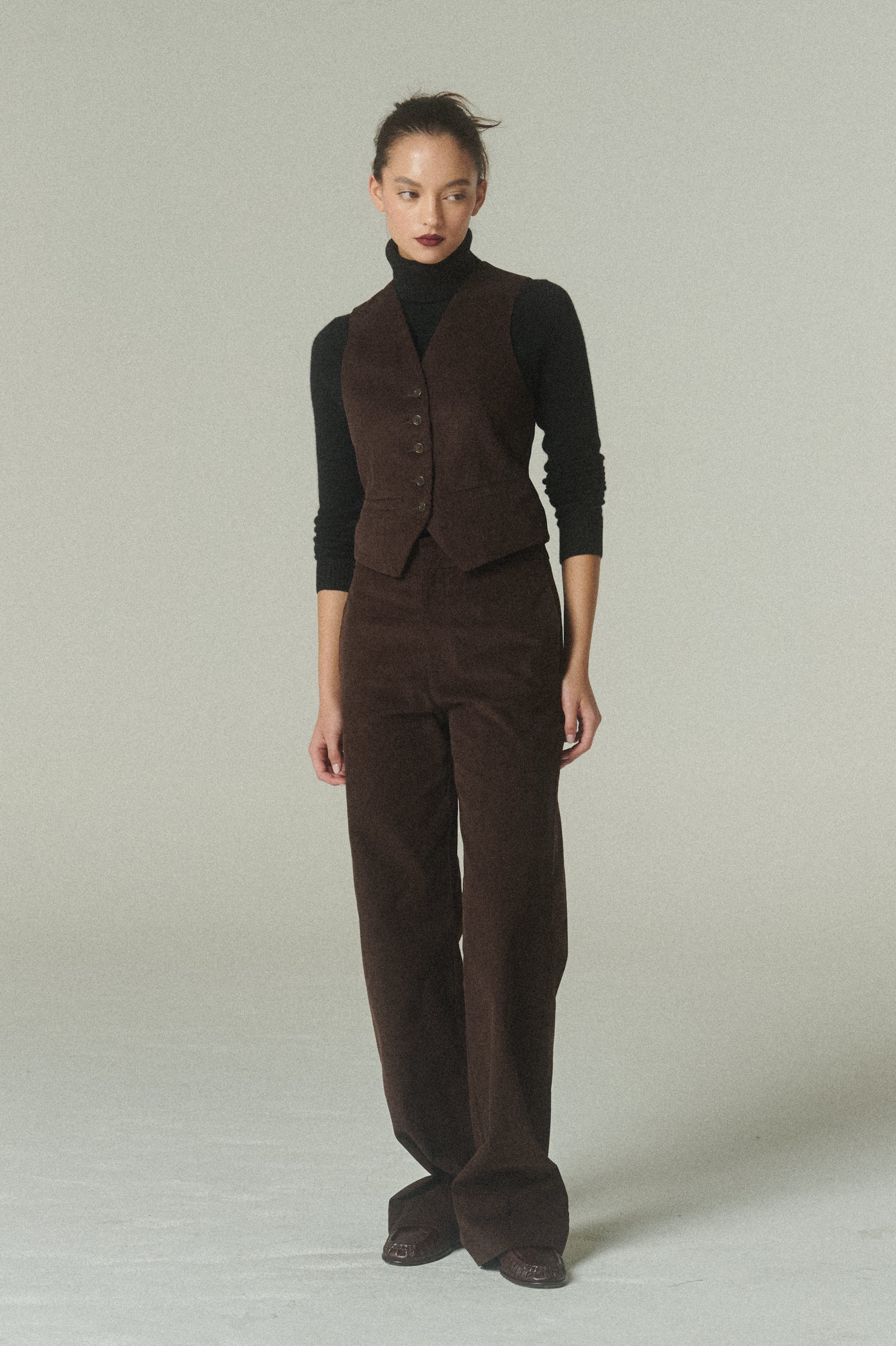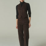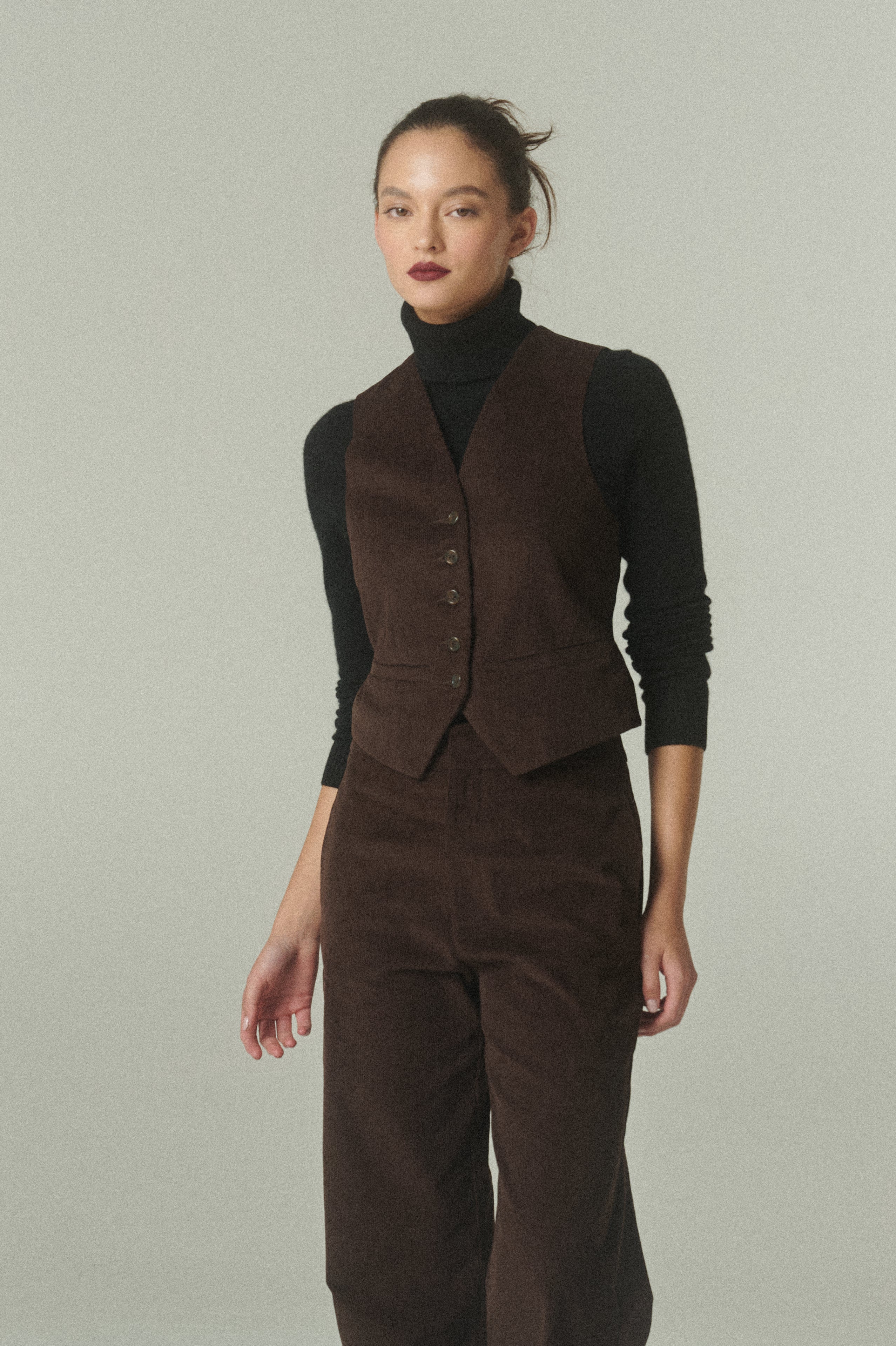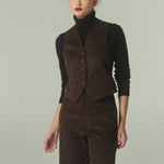 El gilet confeccionado en terciopelo café de alta calidad se presenta como una pieza sofisticada que redefine el vestir en capas. Su textura suave y suavidad de tono café aportan una riqueza visual única, elevando la presencia de la prenda con un acabado refinado.