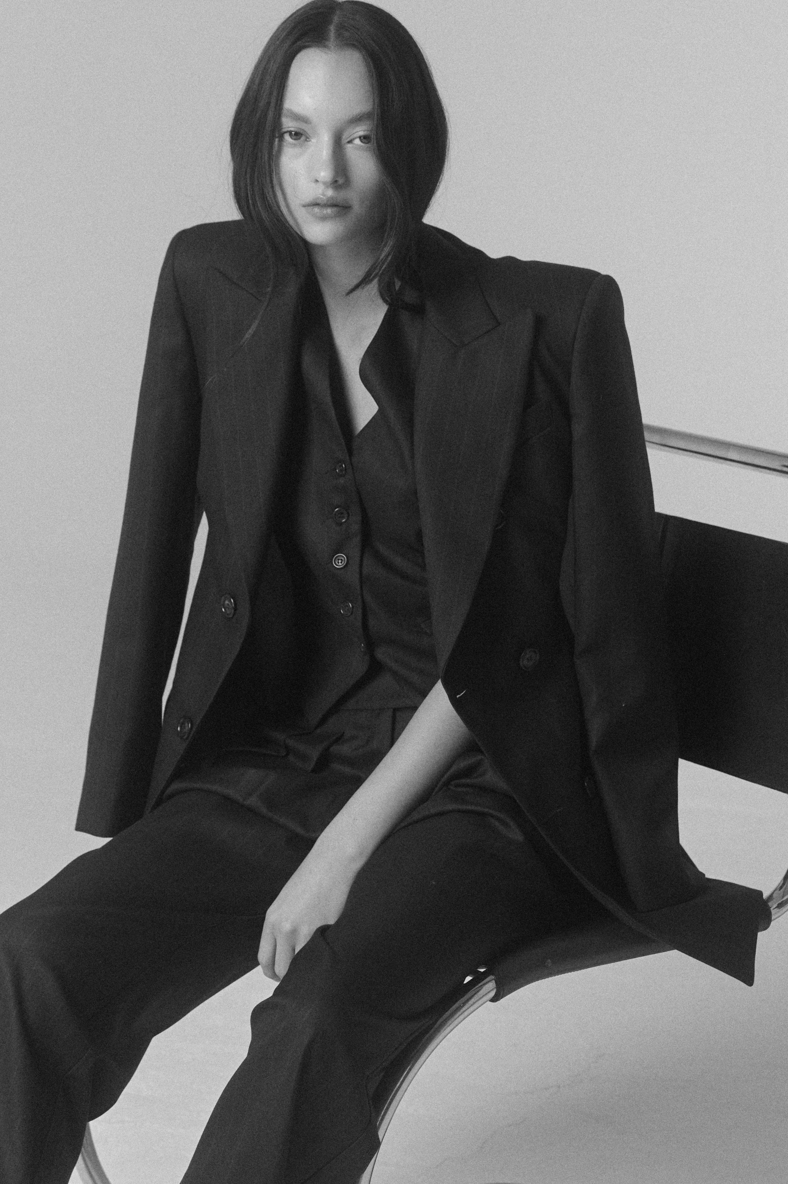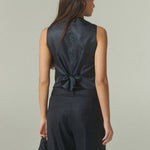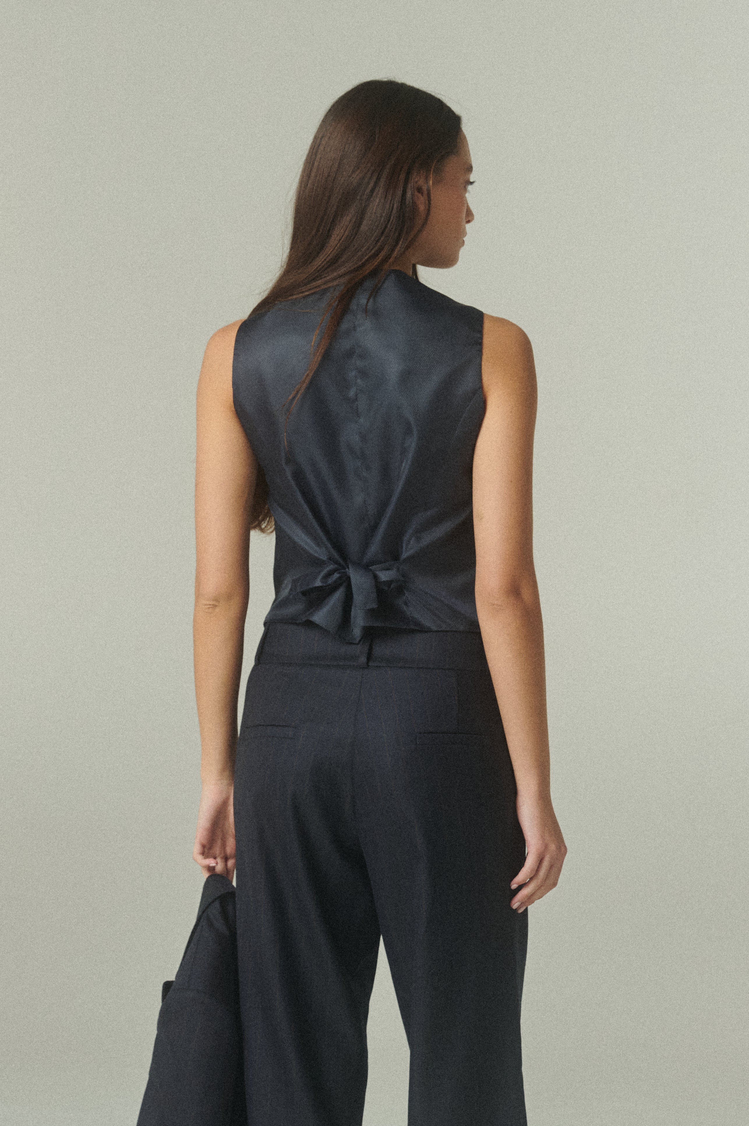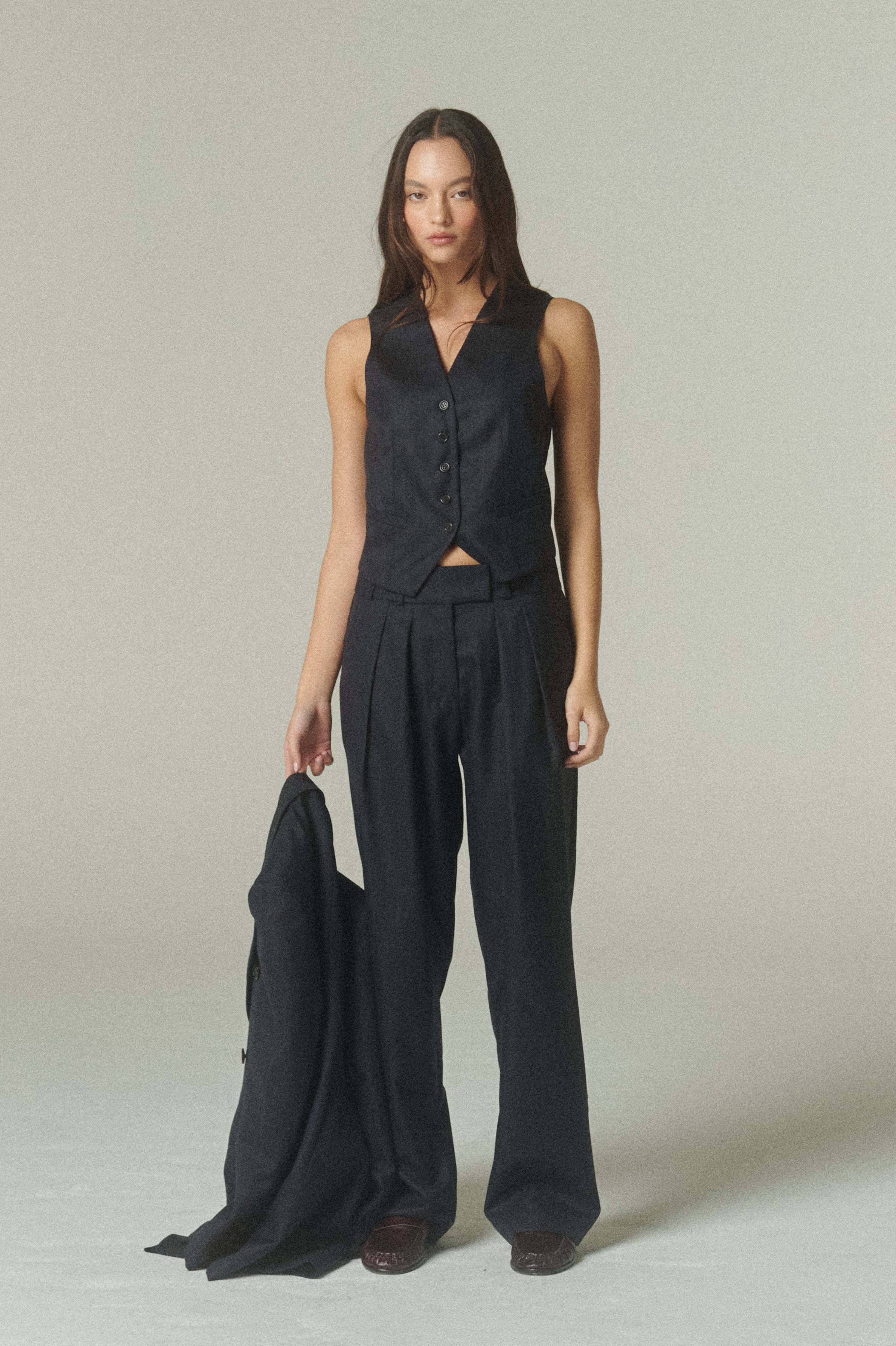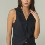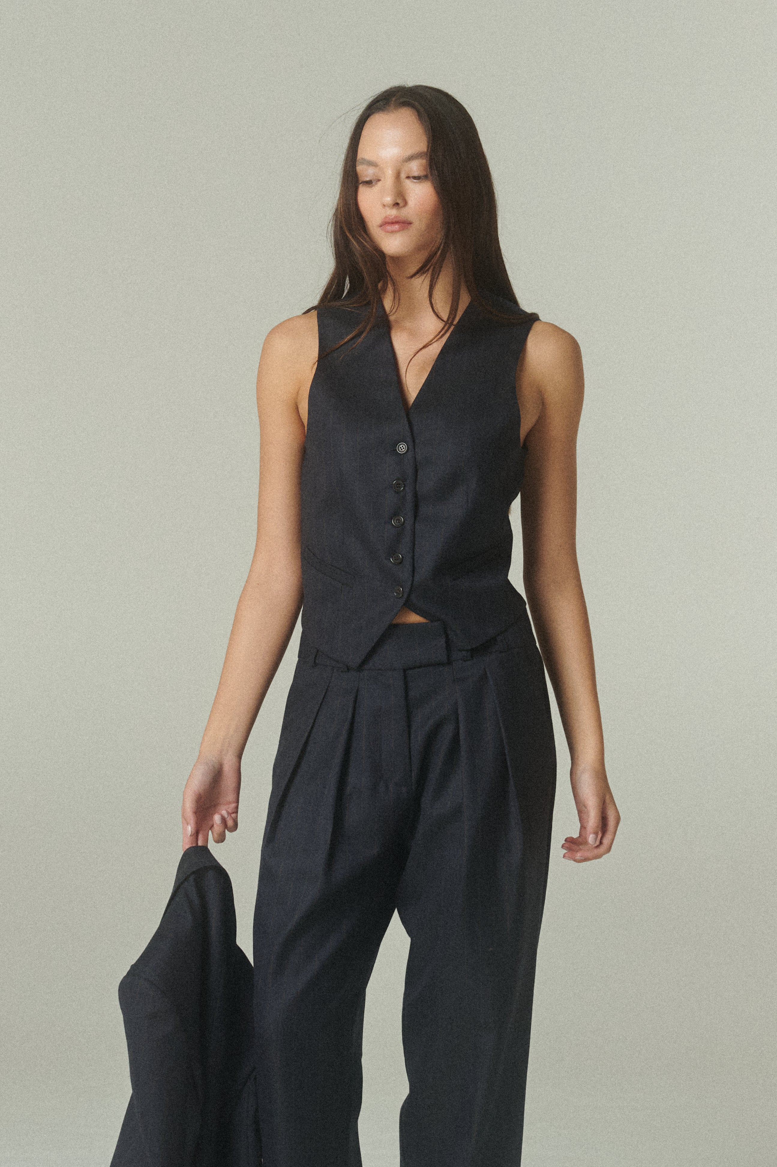 De silueta estructurada y líneas limpias, su calce acompaña el cuerpo con precisión, definiendo el torso de manera elegante. El escote en V alarga la figura, mientras los botones frontales y bolsillos discretos aportan un equilibrio entre funcionalidad y diseño. Su construcción permite integrarlo con facilidad en distintas combinaciones, aportando carácter y sofisticación a cada conjunto.