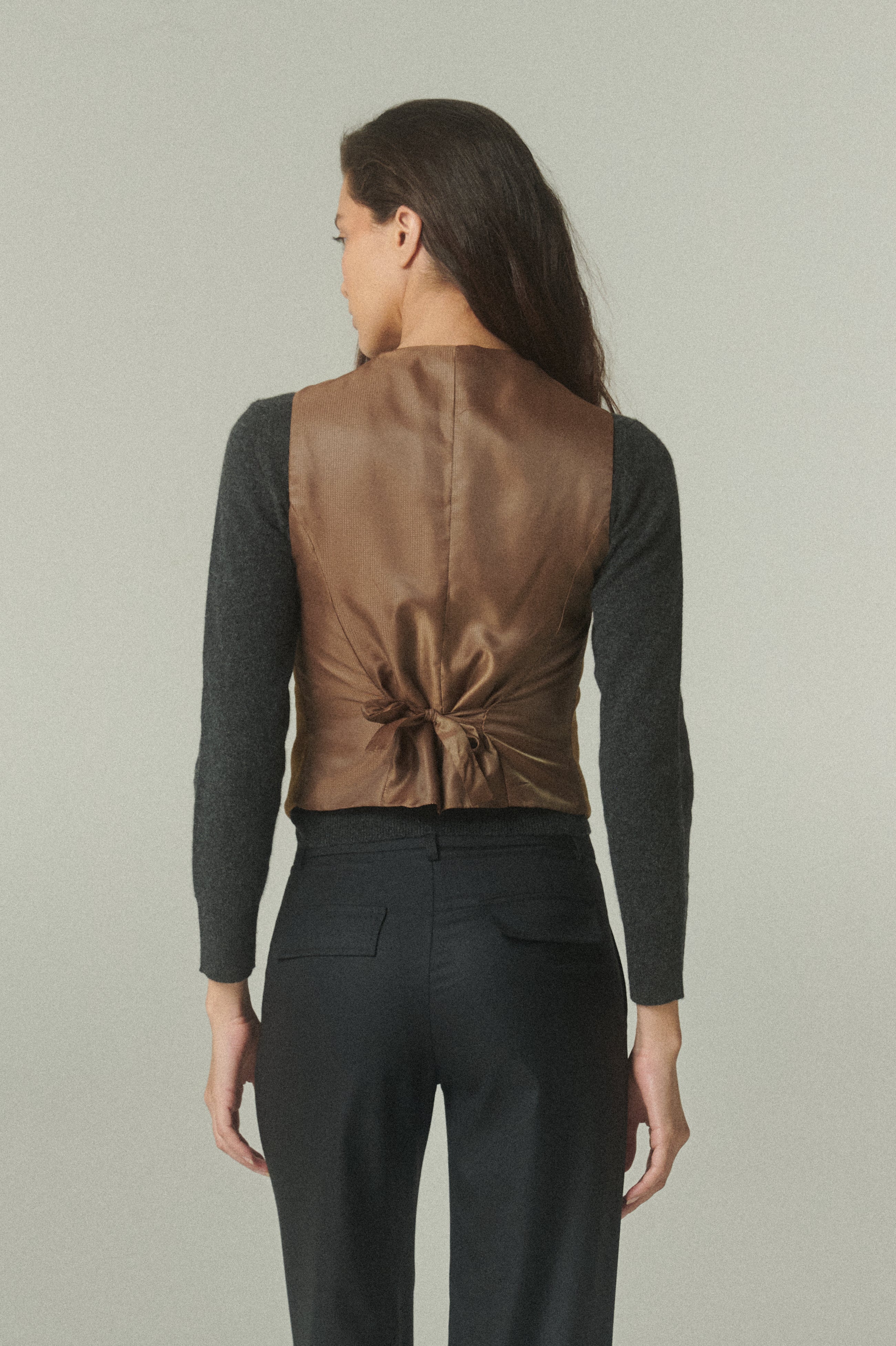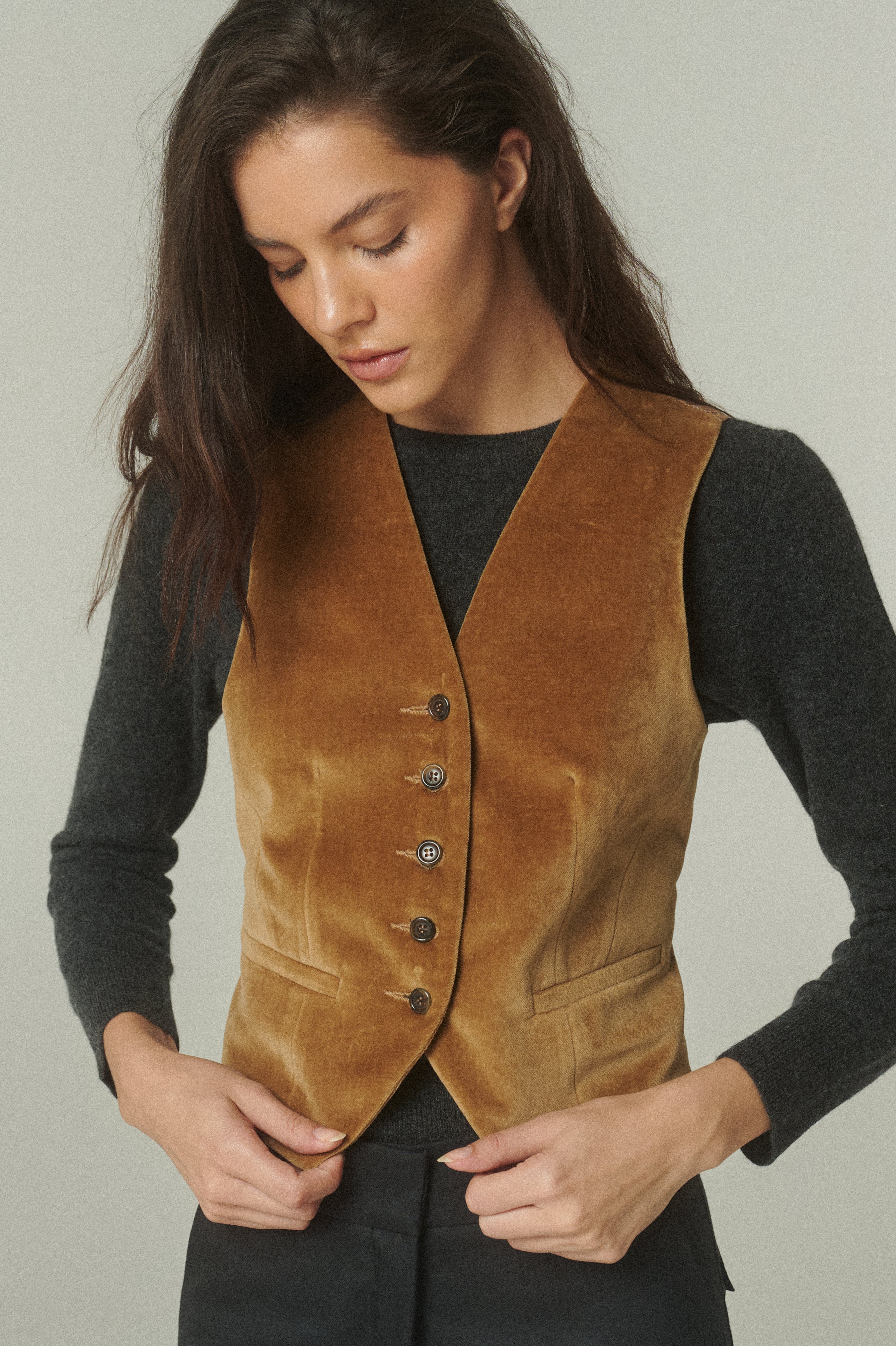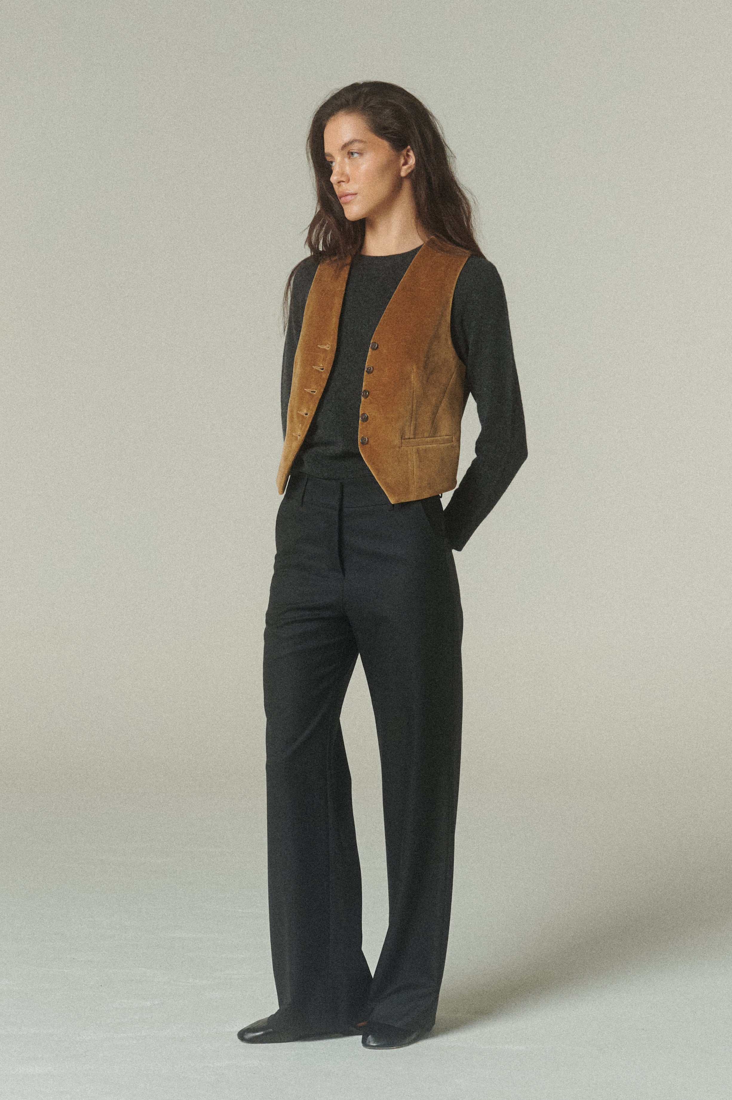 El gilet en terciopelo de alta calidad se presenta como una pieza sofisticada que redefine el vestir en capas. Su textura suave y suavidad de color beige aportan una riqueza visual única, elevando la presencia de la prenda con un acabado refinado.