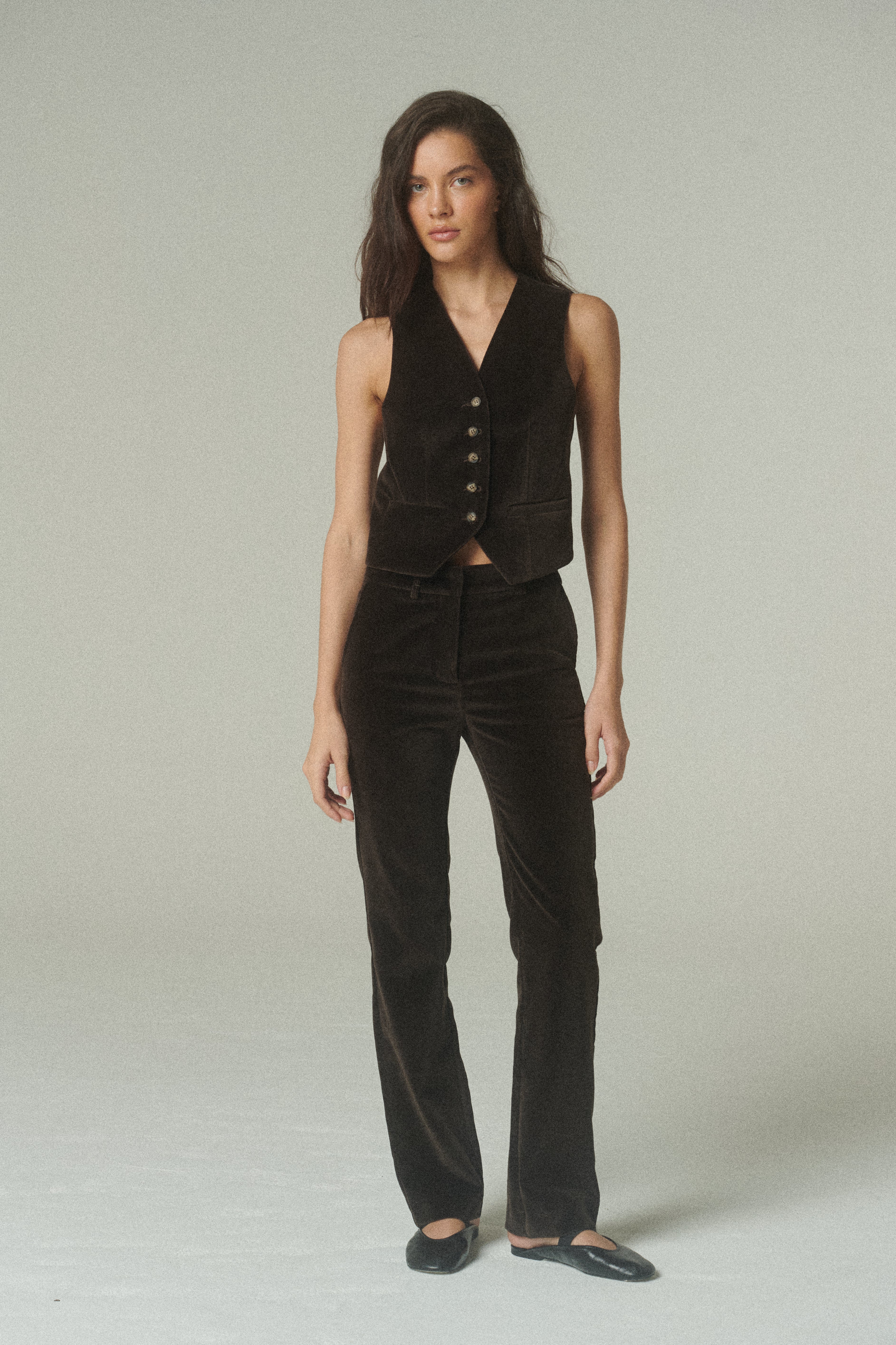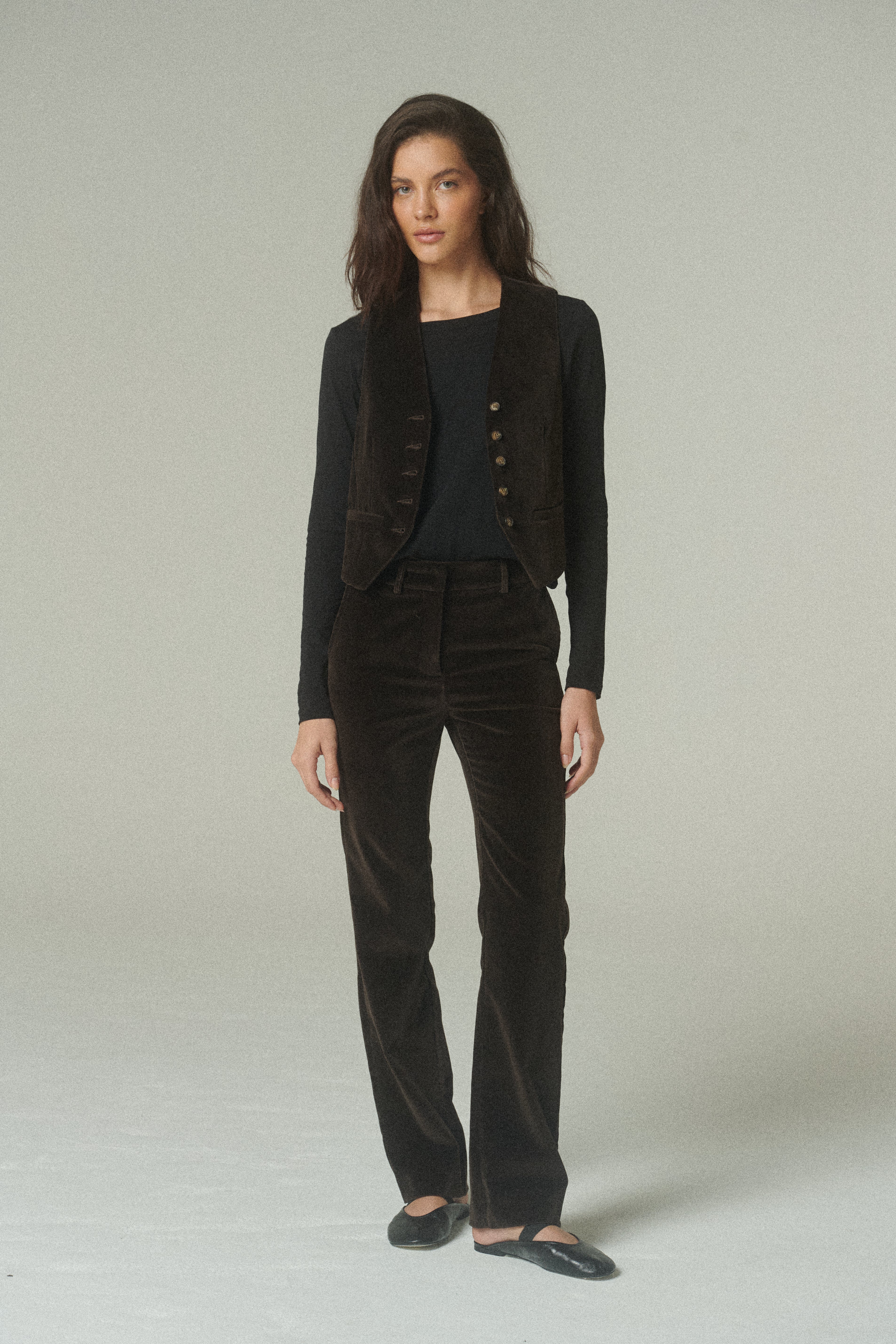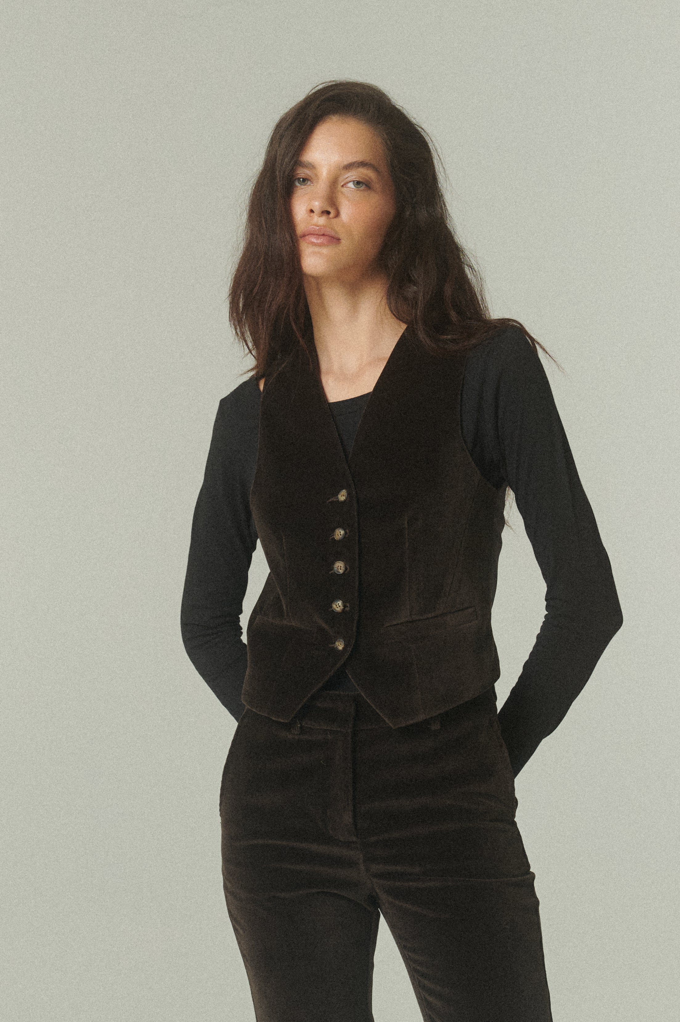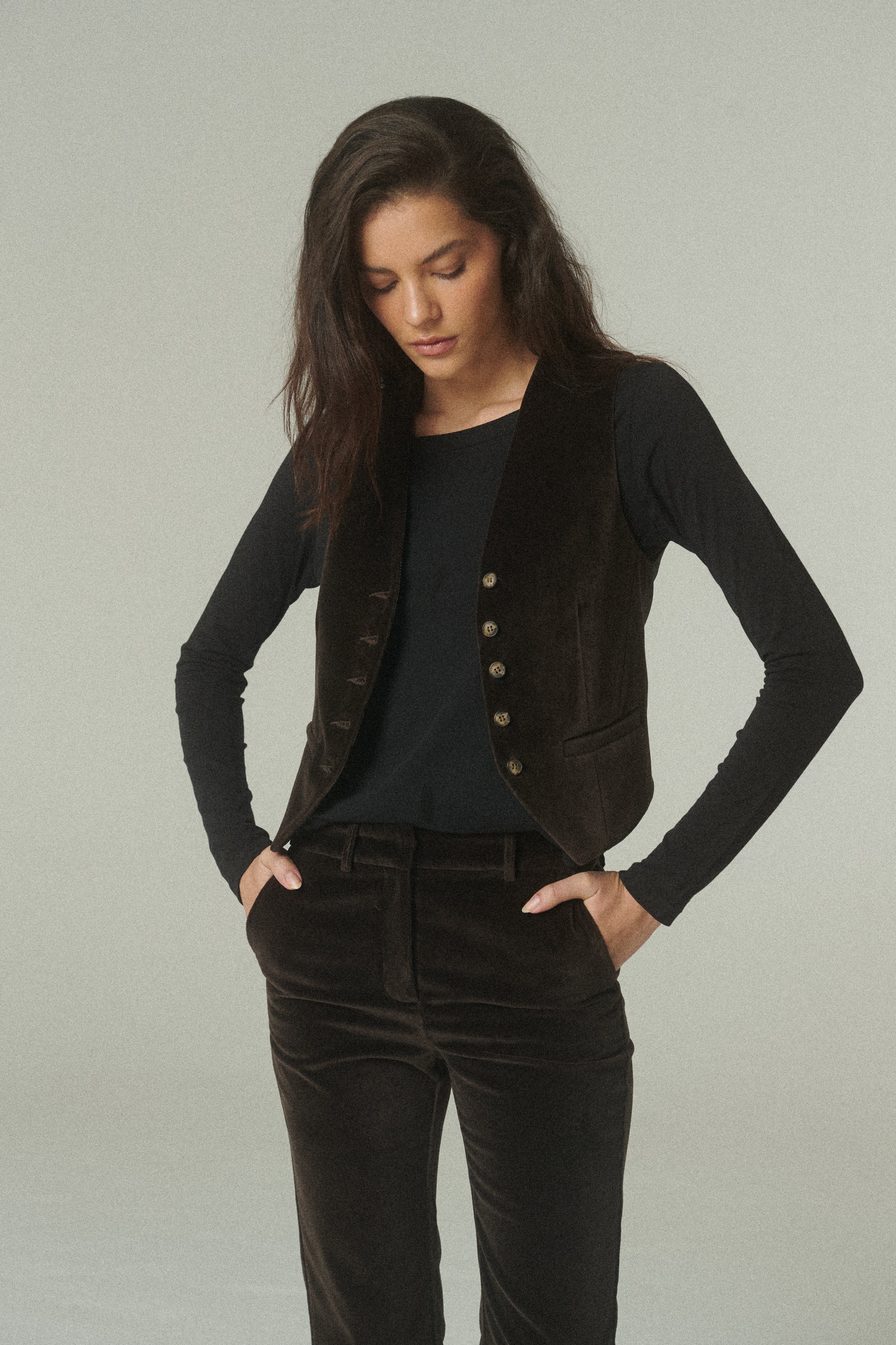 El gilet en terciopelo de alta calidad se presenta como una pieza sofisticada que redefine el vestir en capas. Su textura suave y profundidad de color chocolate aportan una riqueza visual única, elevando la presencia de la prenda con un acabado refinado.