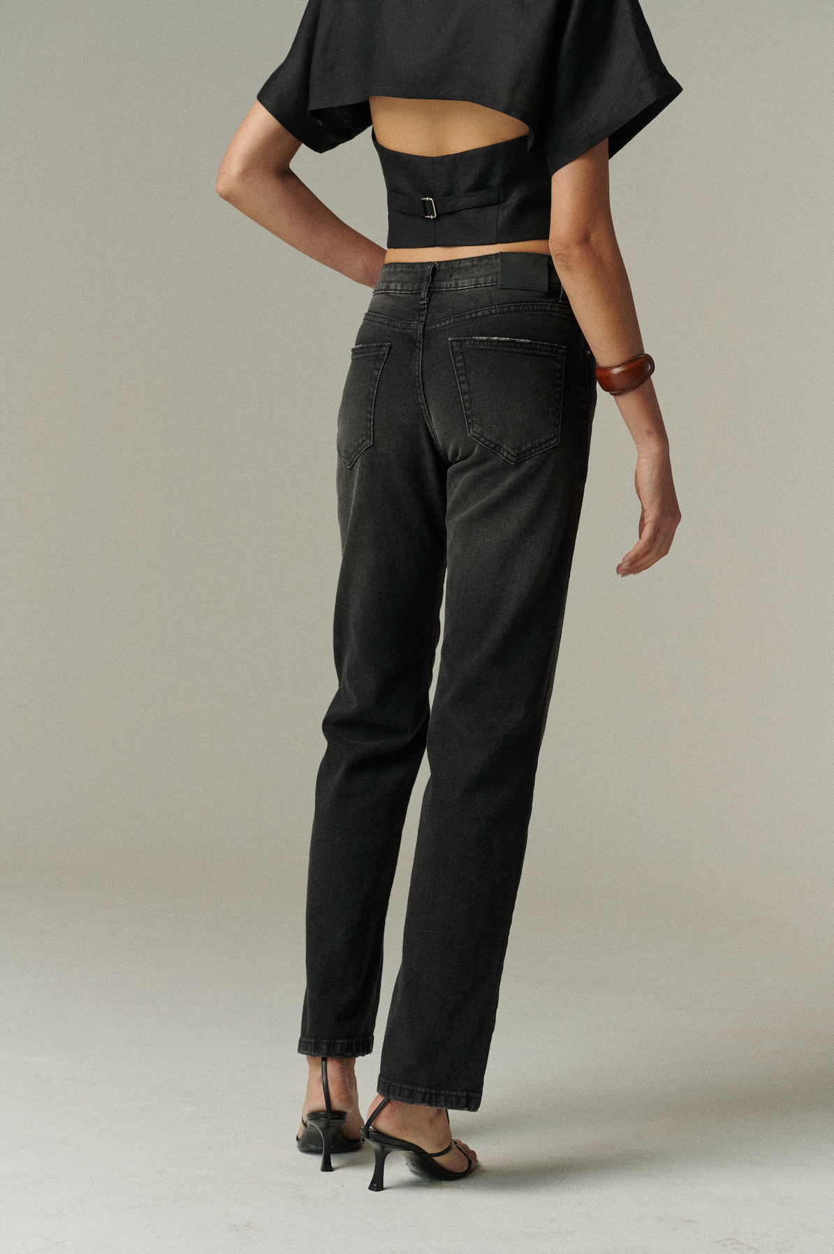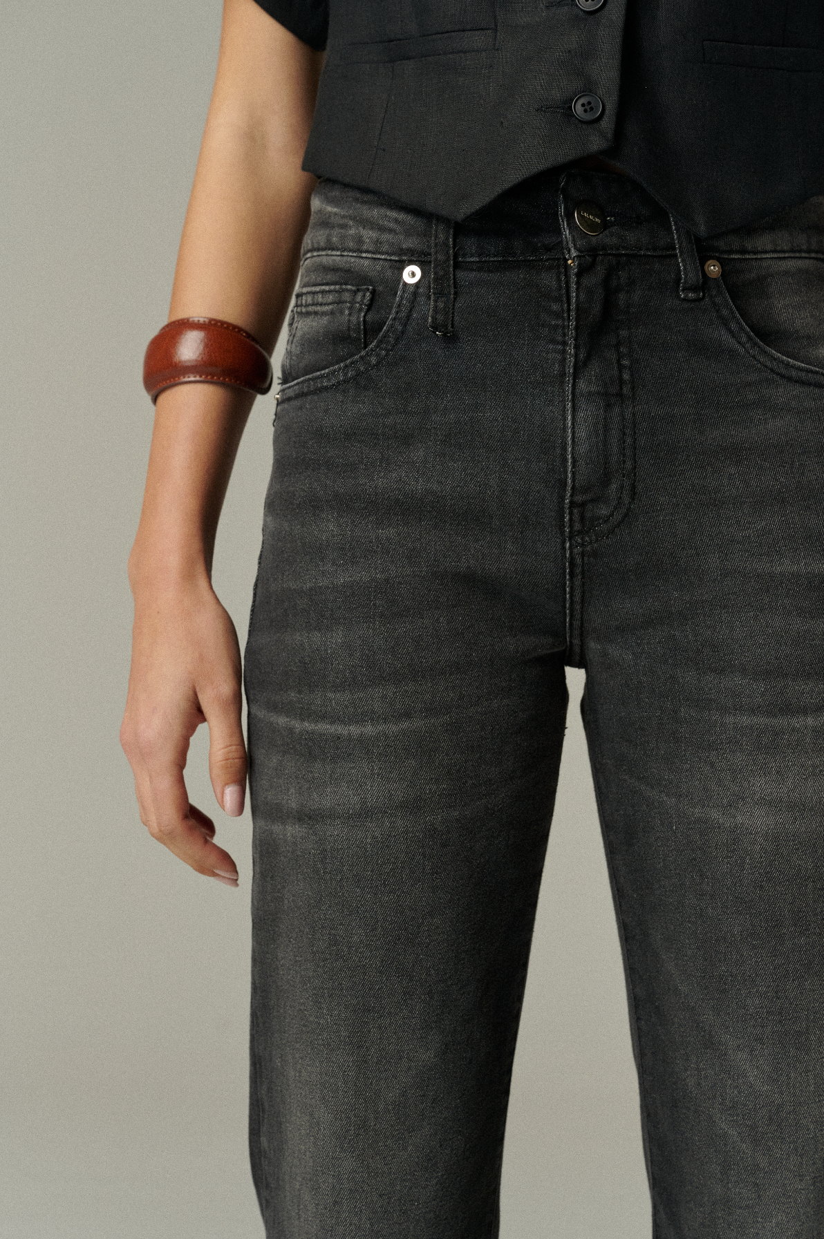 Confeccionado en denim negro elasticado de alta calidad.