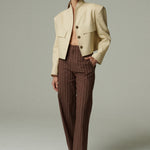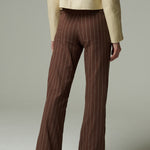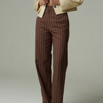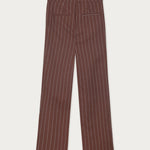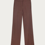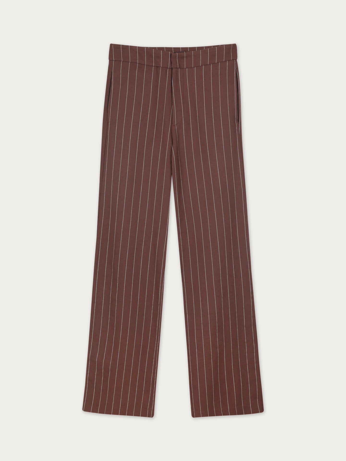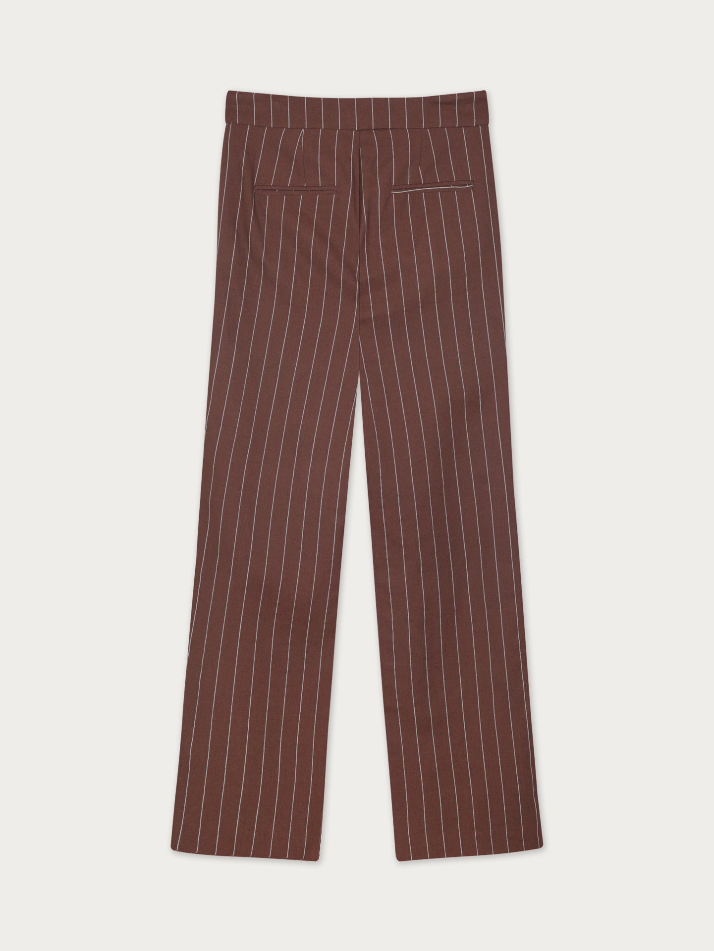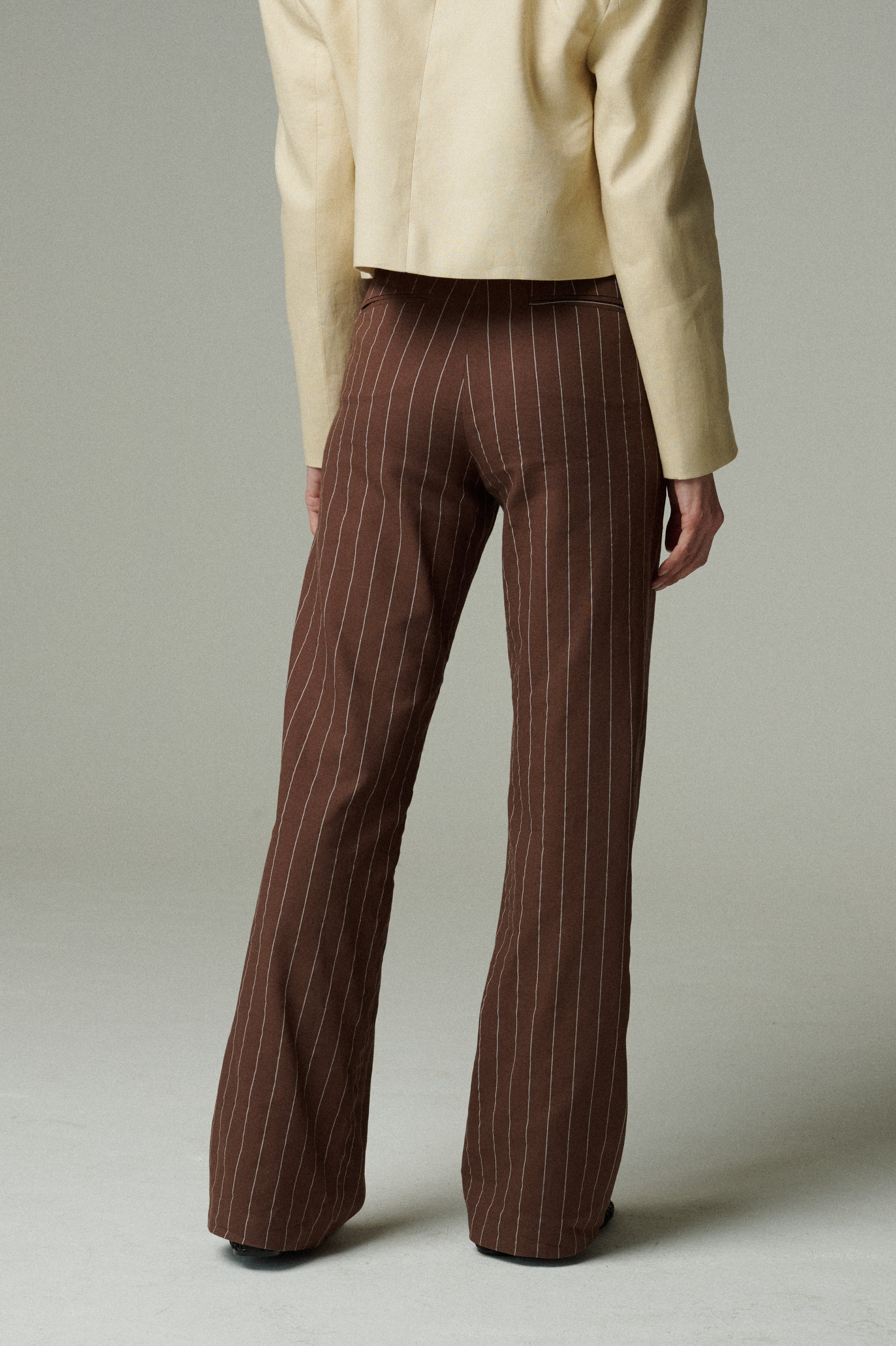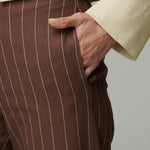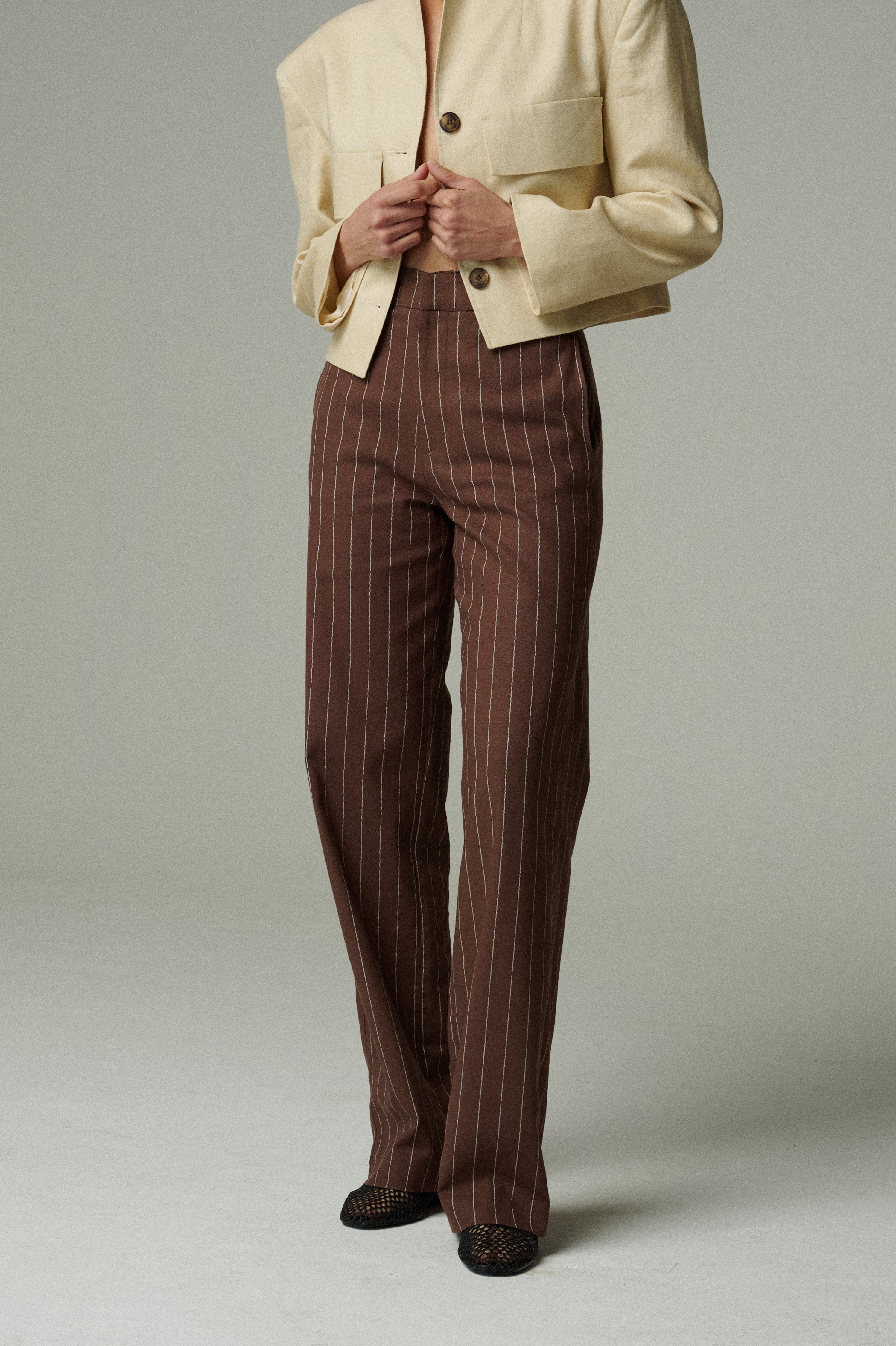 Pantalón de 100% lino café rayado, de inspiración sastre. Atemporal y fresco, pensado como una pieza clásica adaptada al verano. Perfecto para elevar un look casual o complementar uno más formal.
