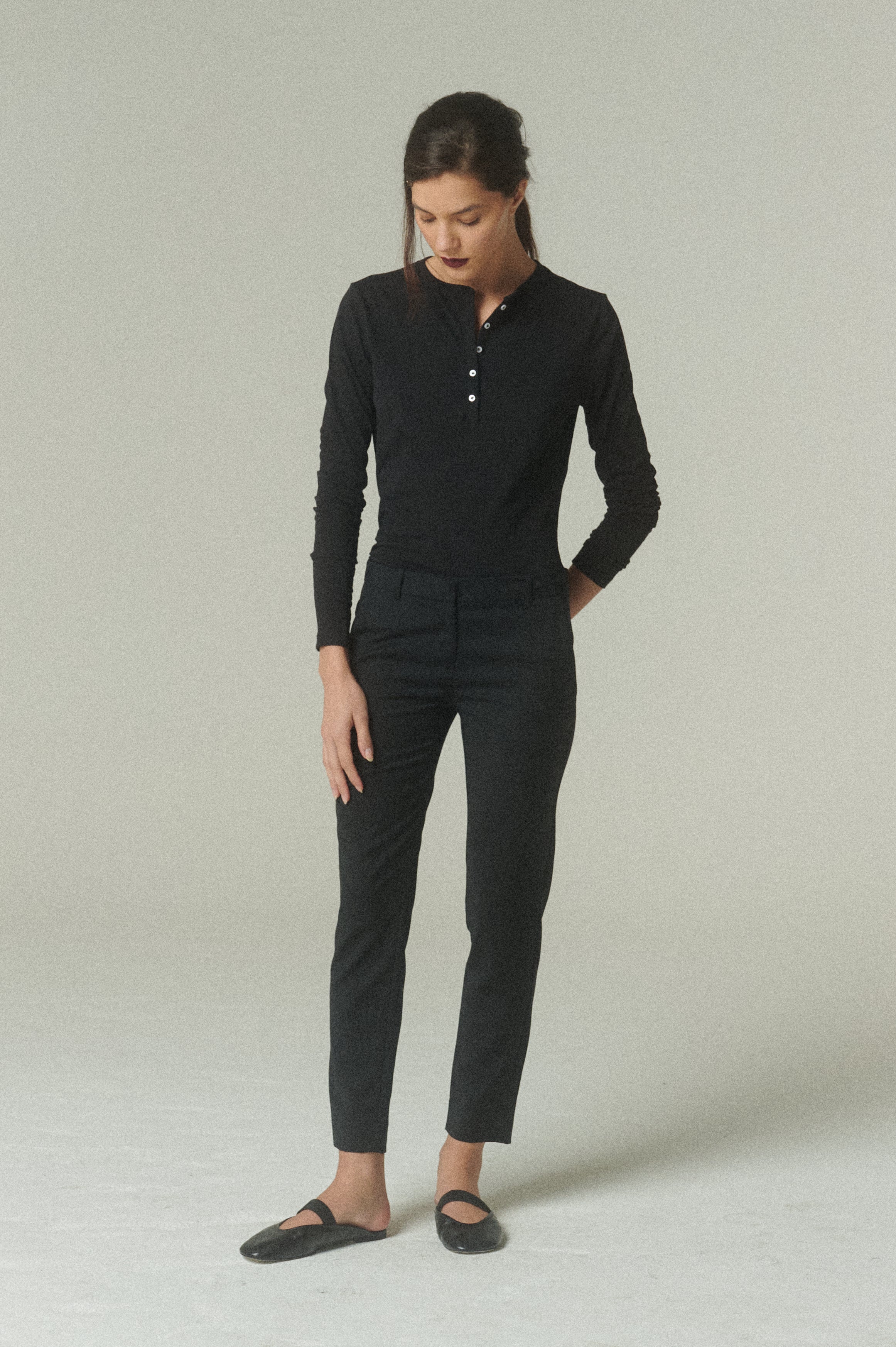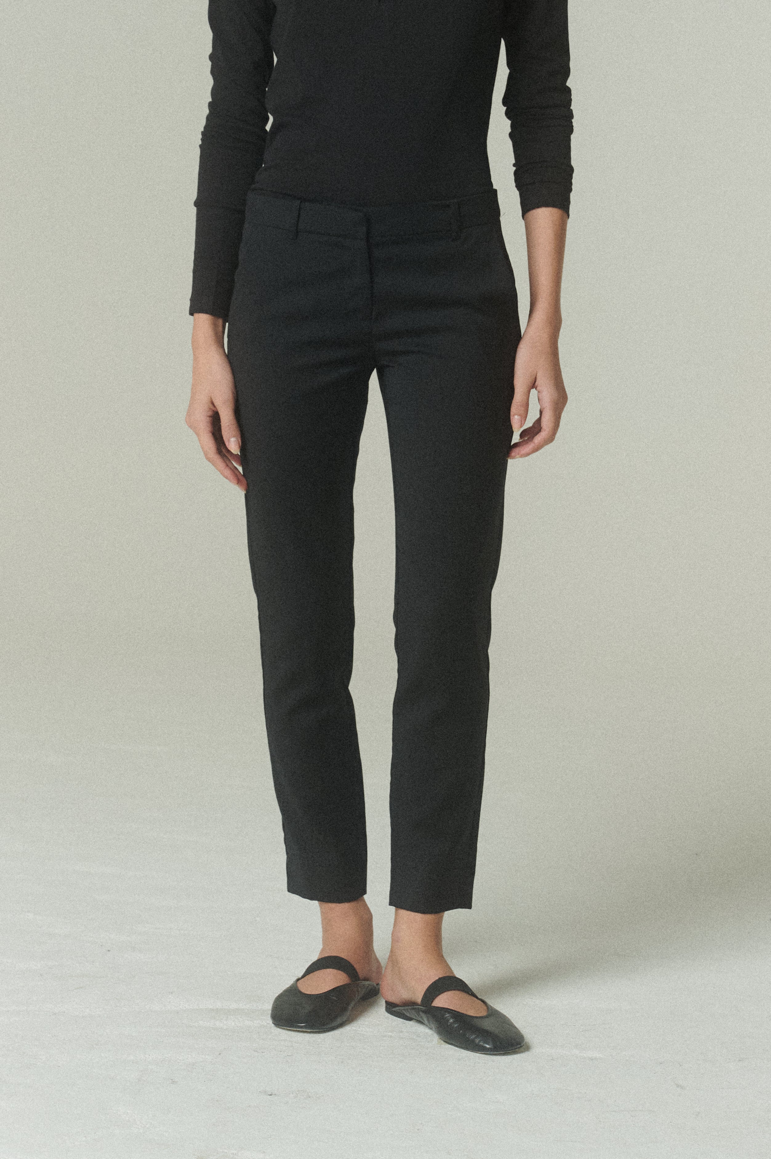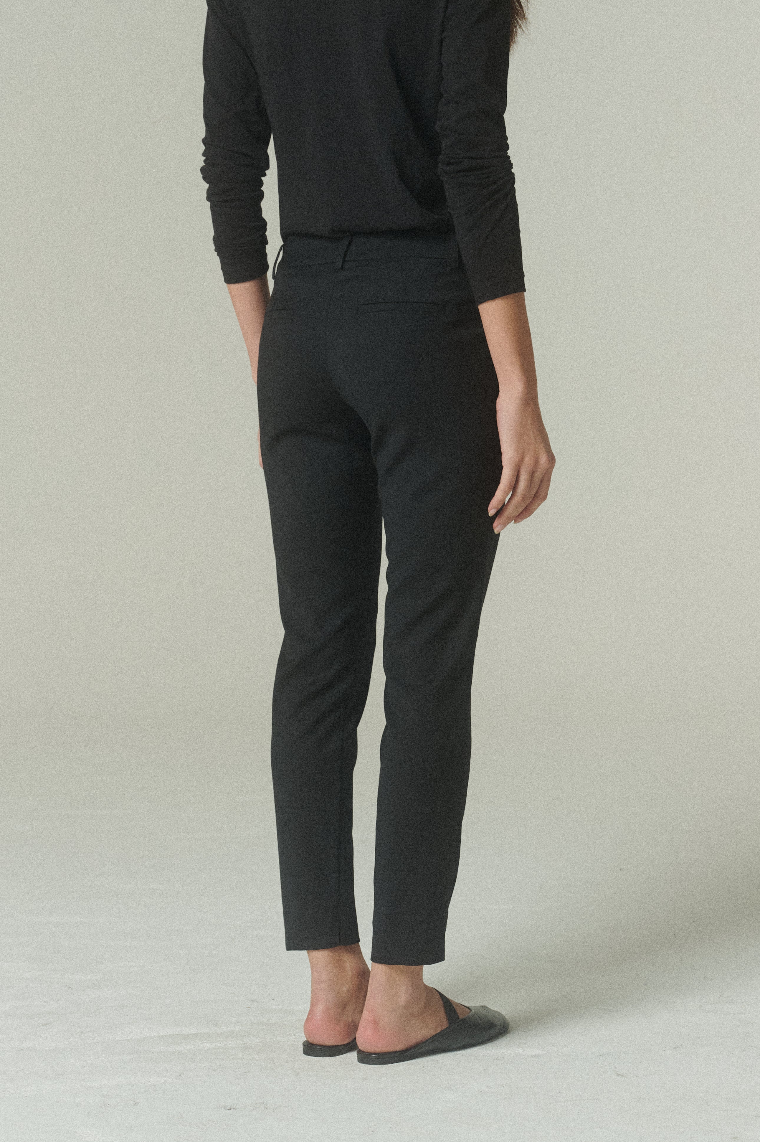 Nuestro Pantalón Lápiz reinterpreta la sastrería clásica desde una silueta más depurada y contemporánea. Confeccionado en 100% lana peinada negra de alta calidad, destaca por su caída limpia y su acabado sobrio.