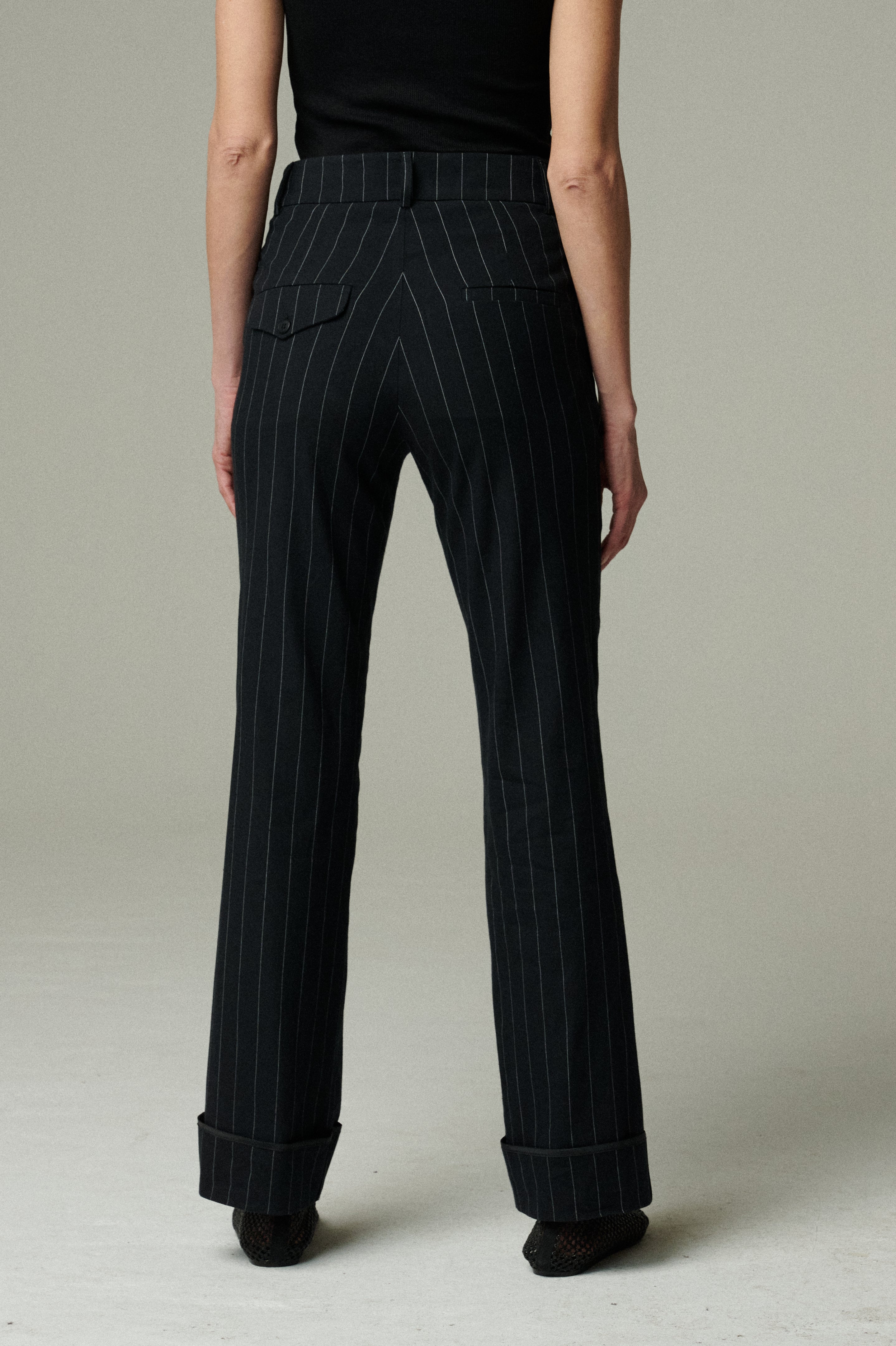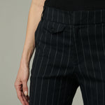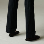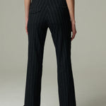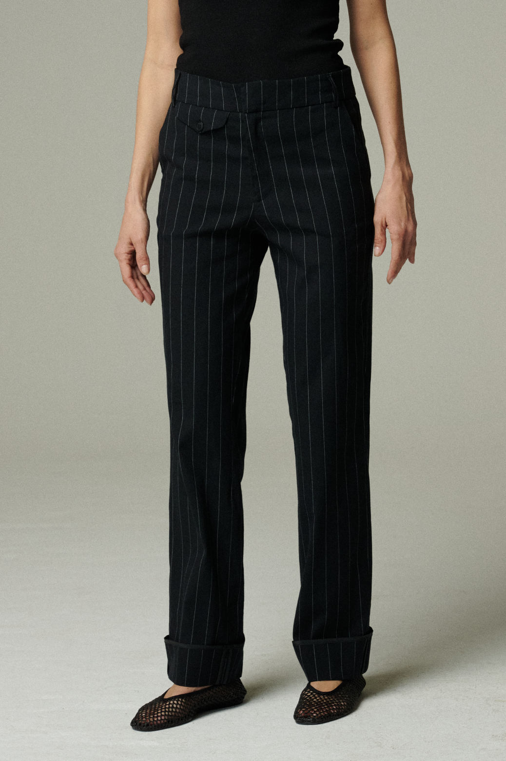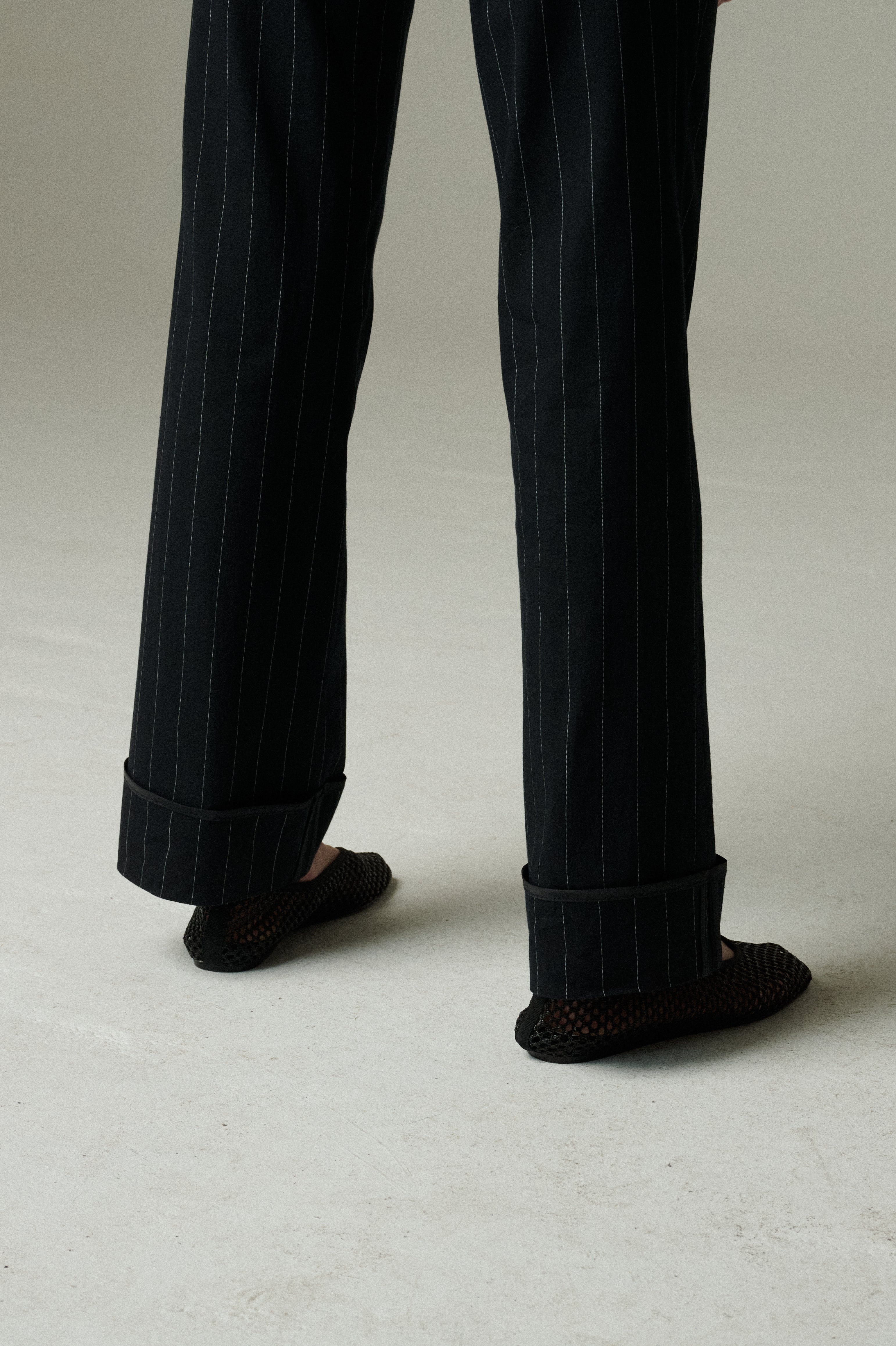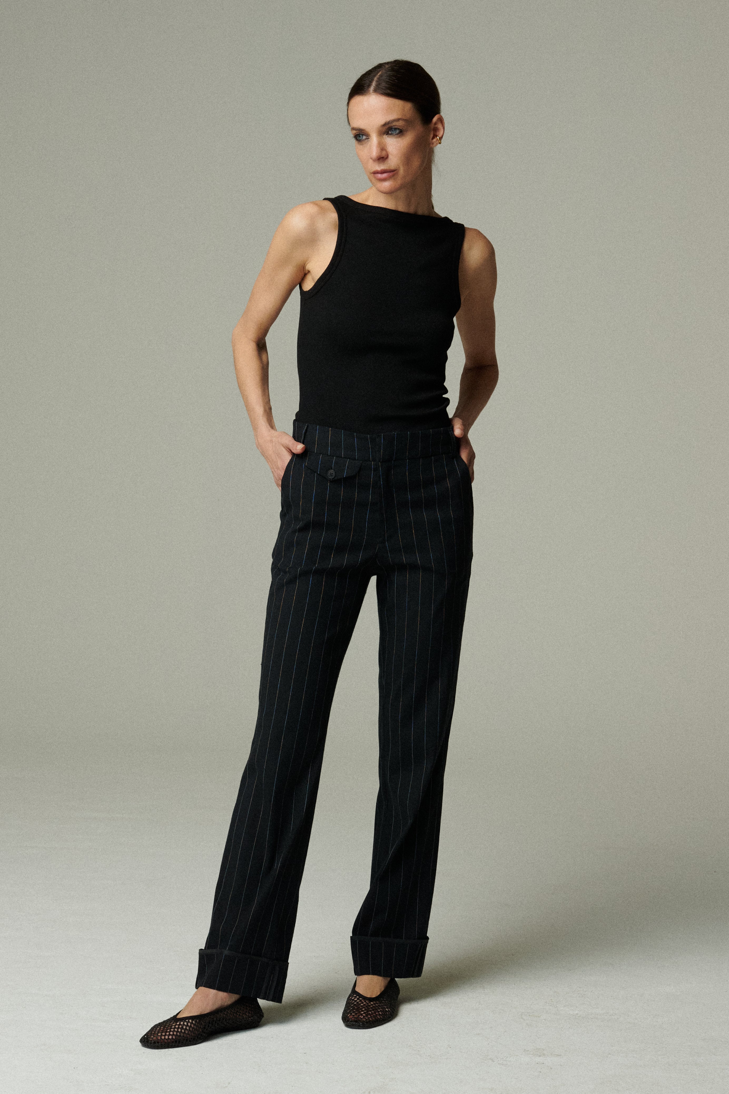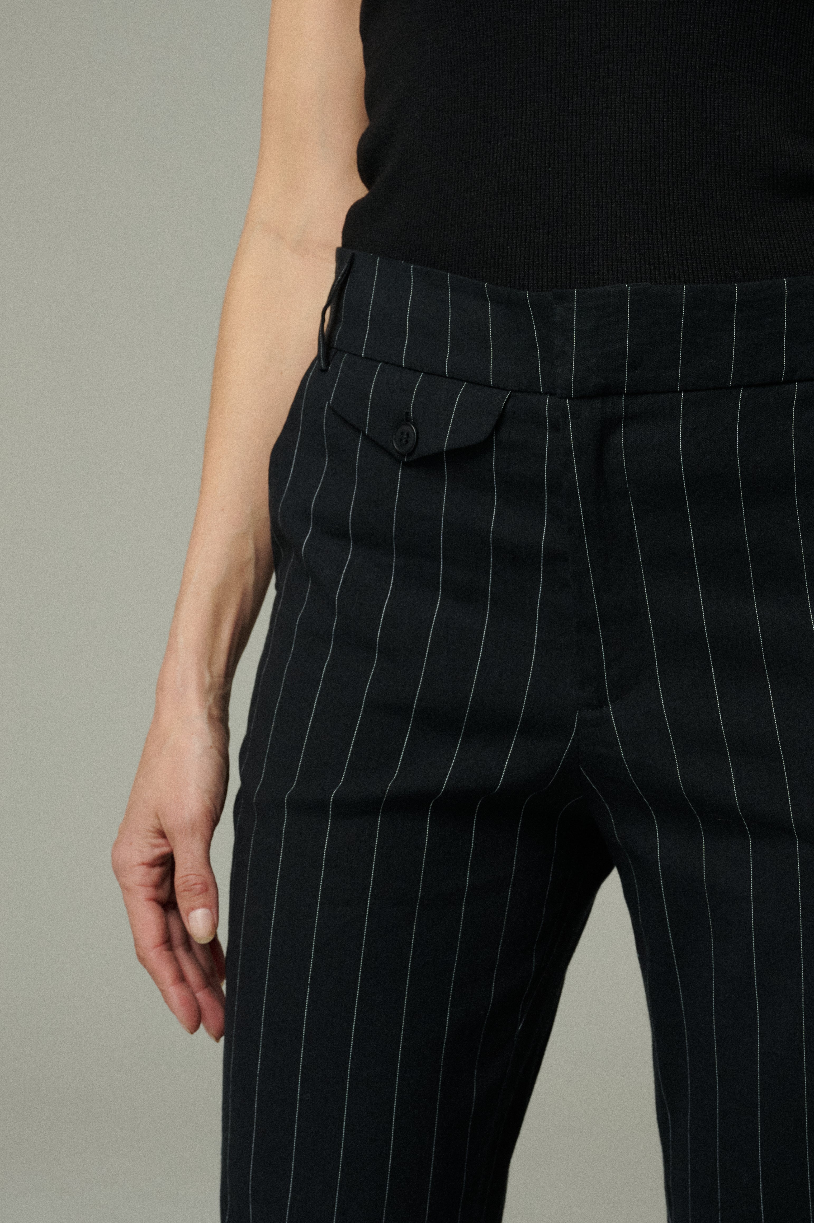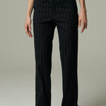 Un pantalón de 100% lino negro con rayas, que reinterpreta la sastrería en clave fresca y veraniega. Con detalles como bolsillos sutiles y basta intencional, se convierte en un básico elevado con carácter.