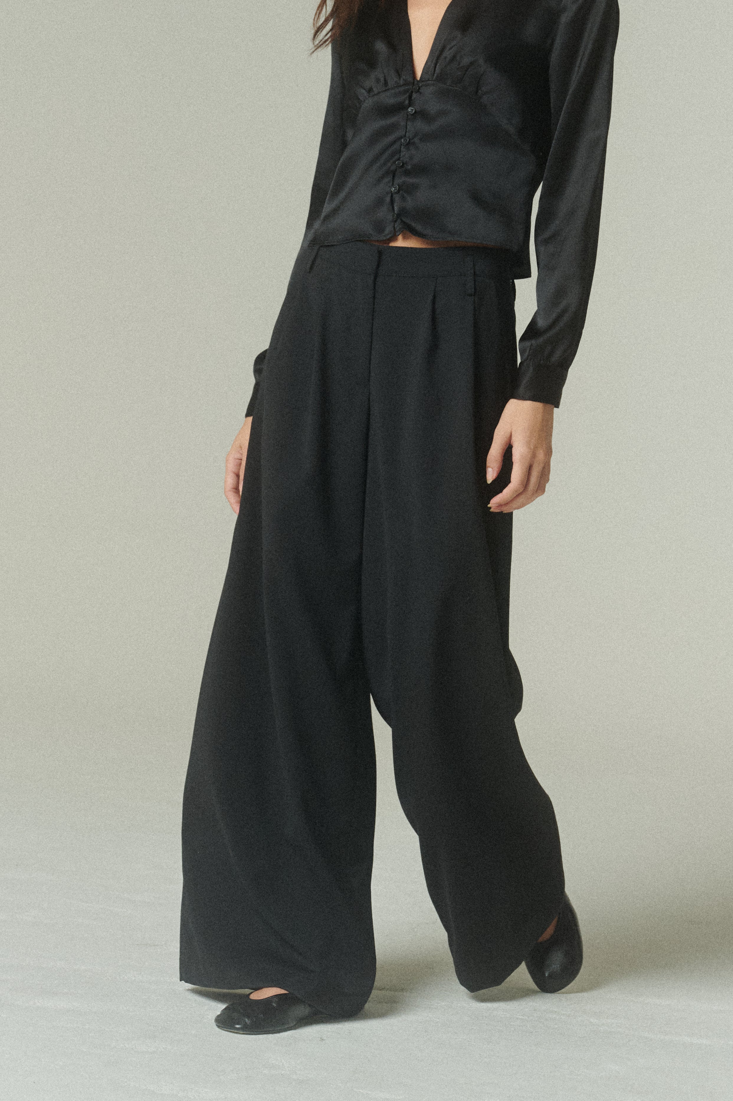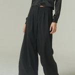 De tiro medio y pierna ancha, su calce propone una silueta contemporánea que equilibra soltura y estructura. Las pinzas aportan un gesto clásico y femenino, reforzando su inspiración sastrera.