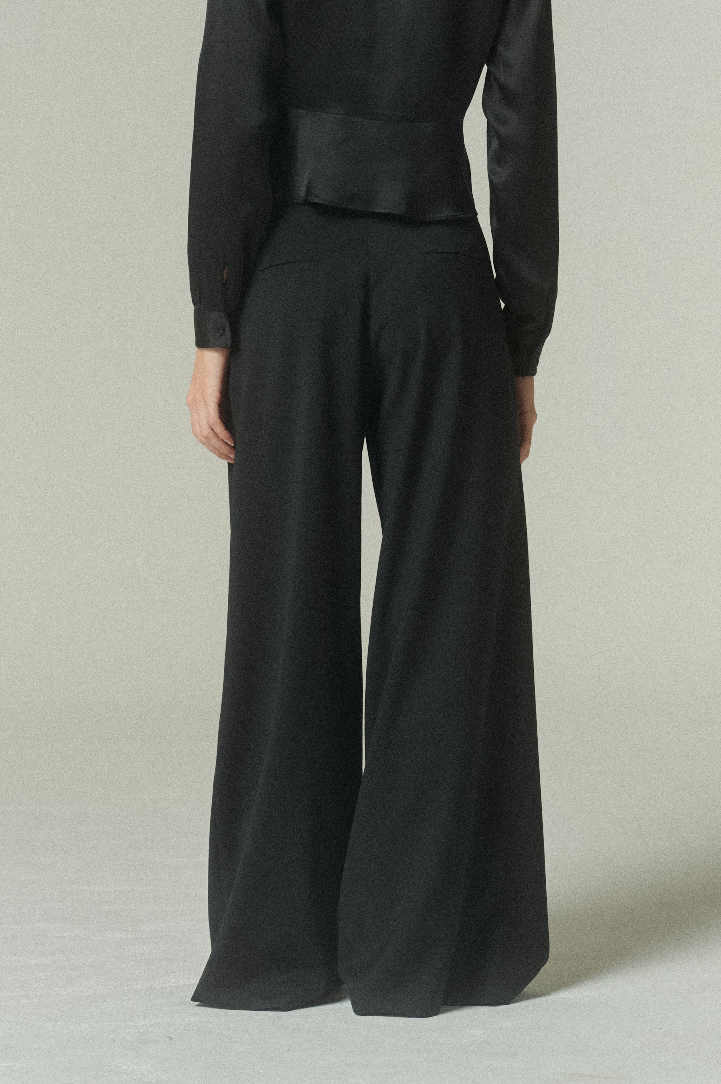 Nuestro Pantalón Tere es la versión amplia y relajada del pantalón sastrero. Confeccionado en 100% lana peinada negra, destaca por su textura y elegancia natural.