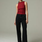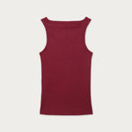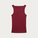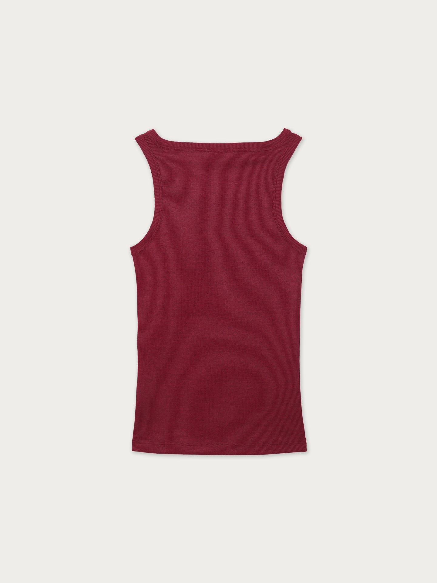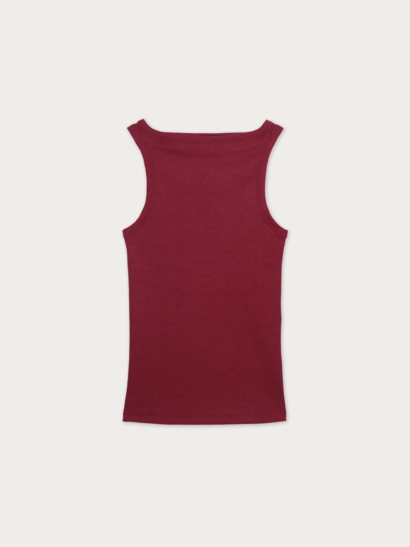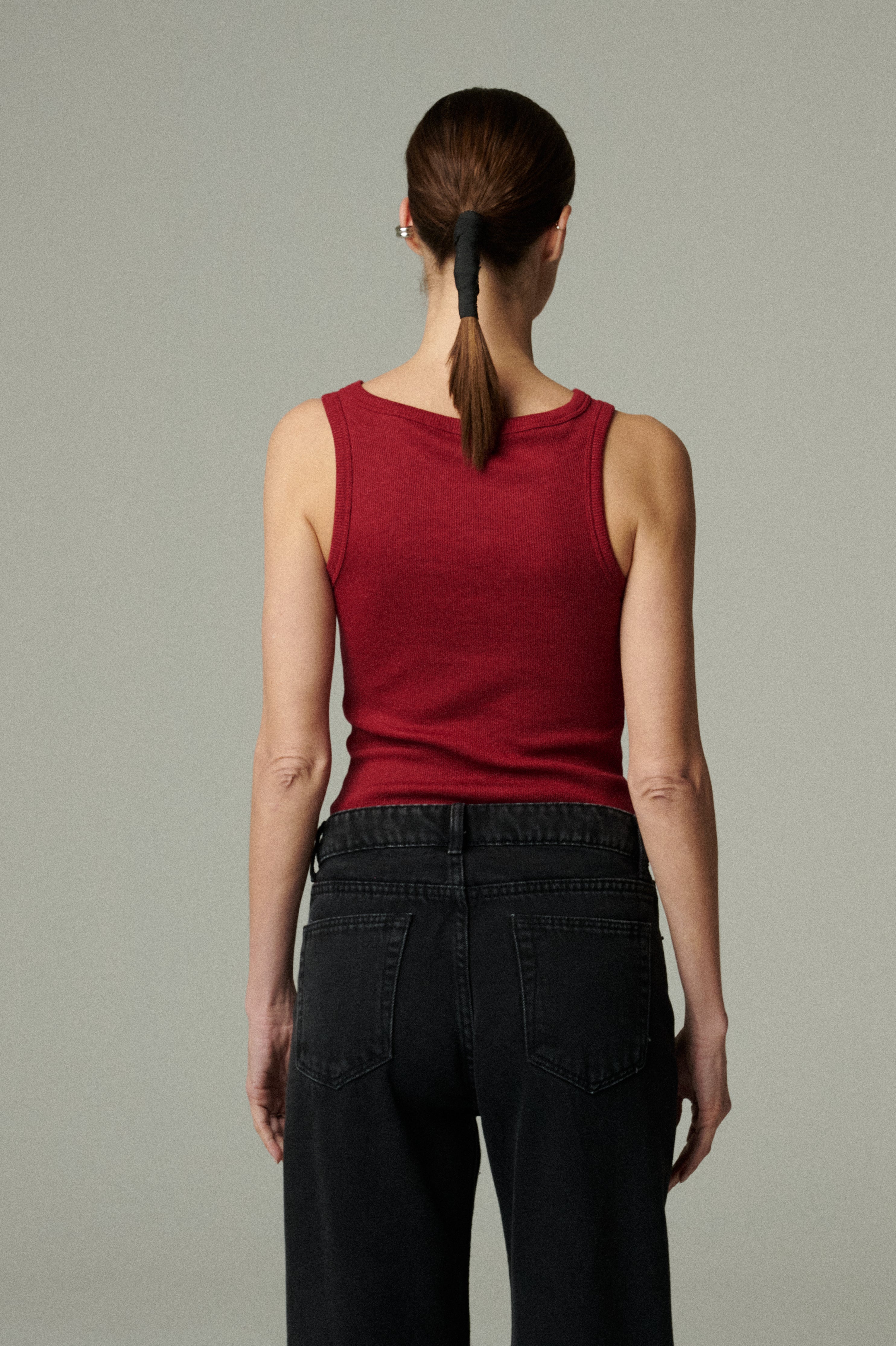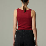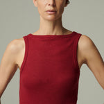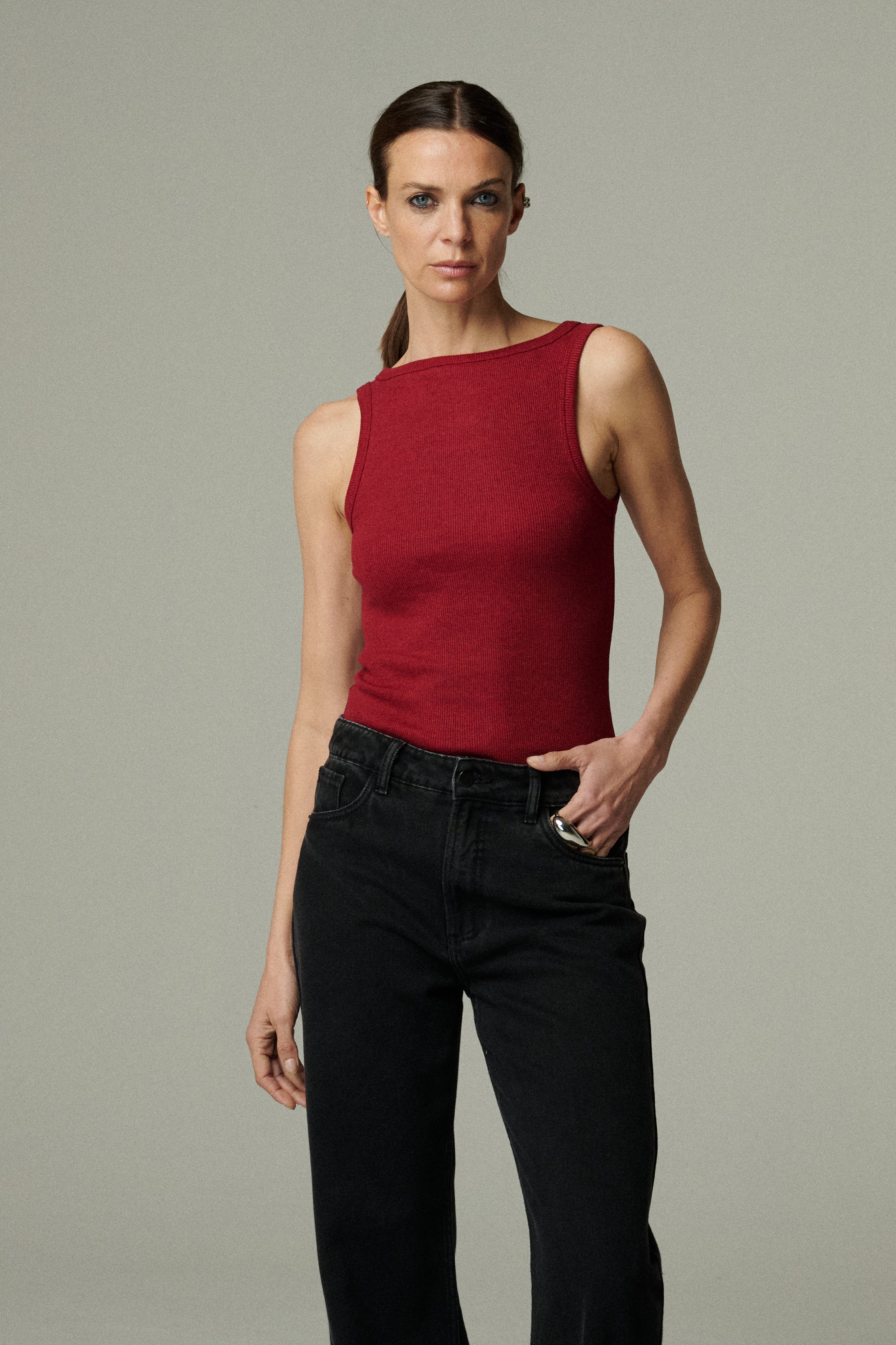 Musculosa de cuello cerrado y silueta ajustada en color rojo oscuro. Atemporal, fresca y con un escote elegante y original. Disponible también en negro.
