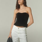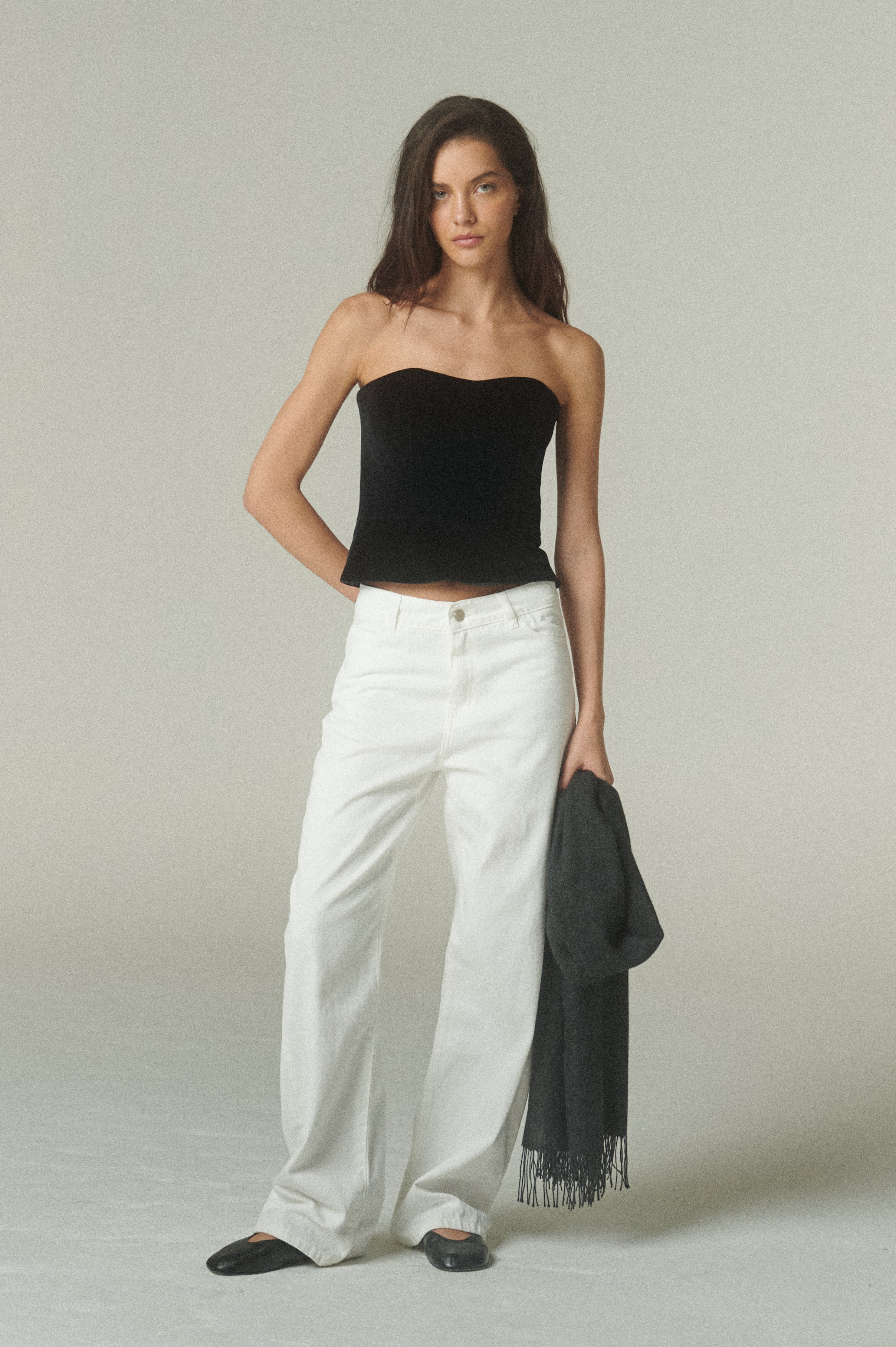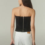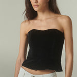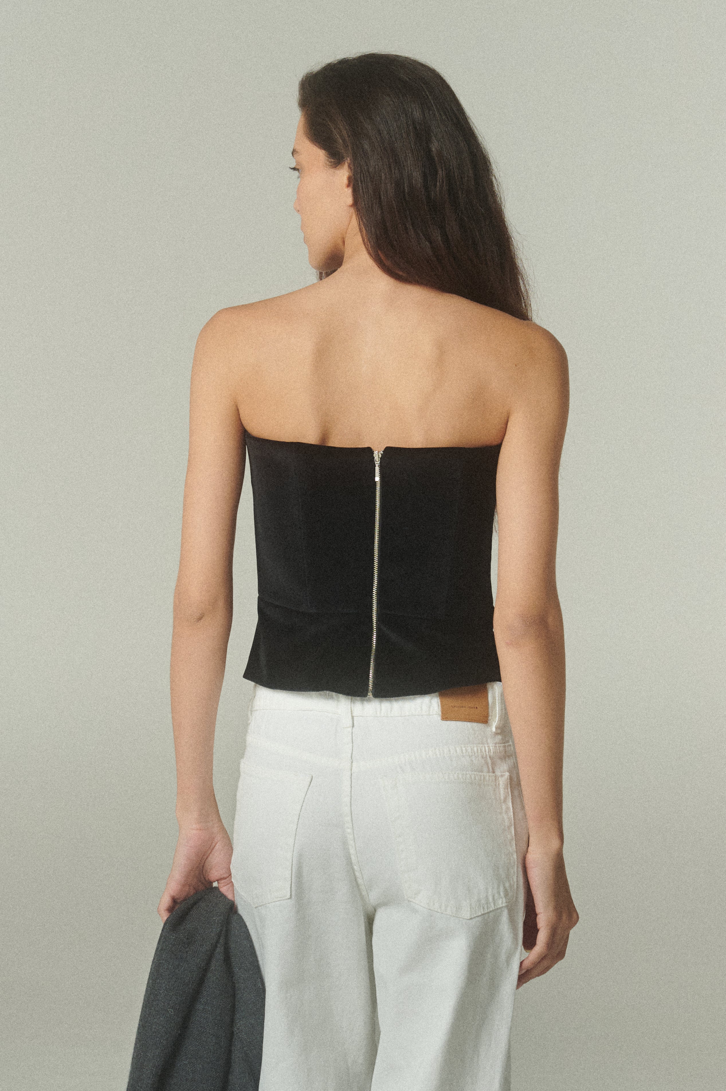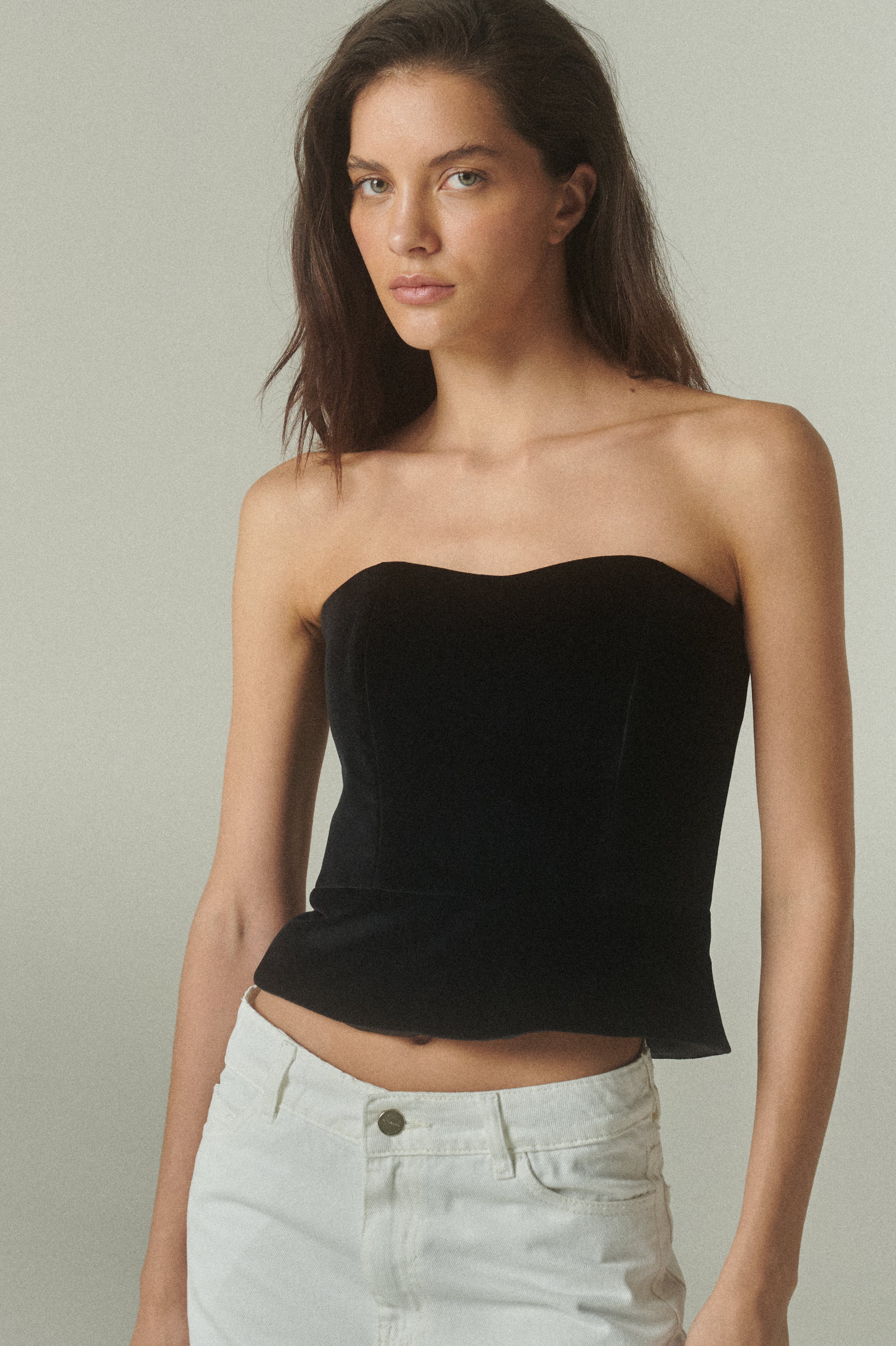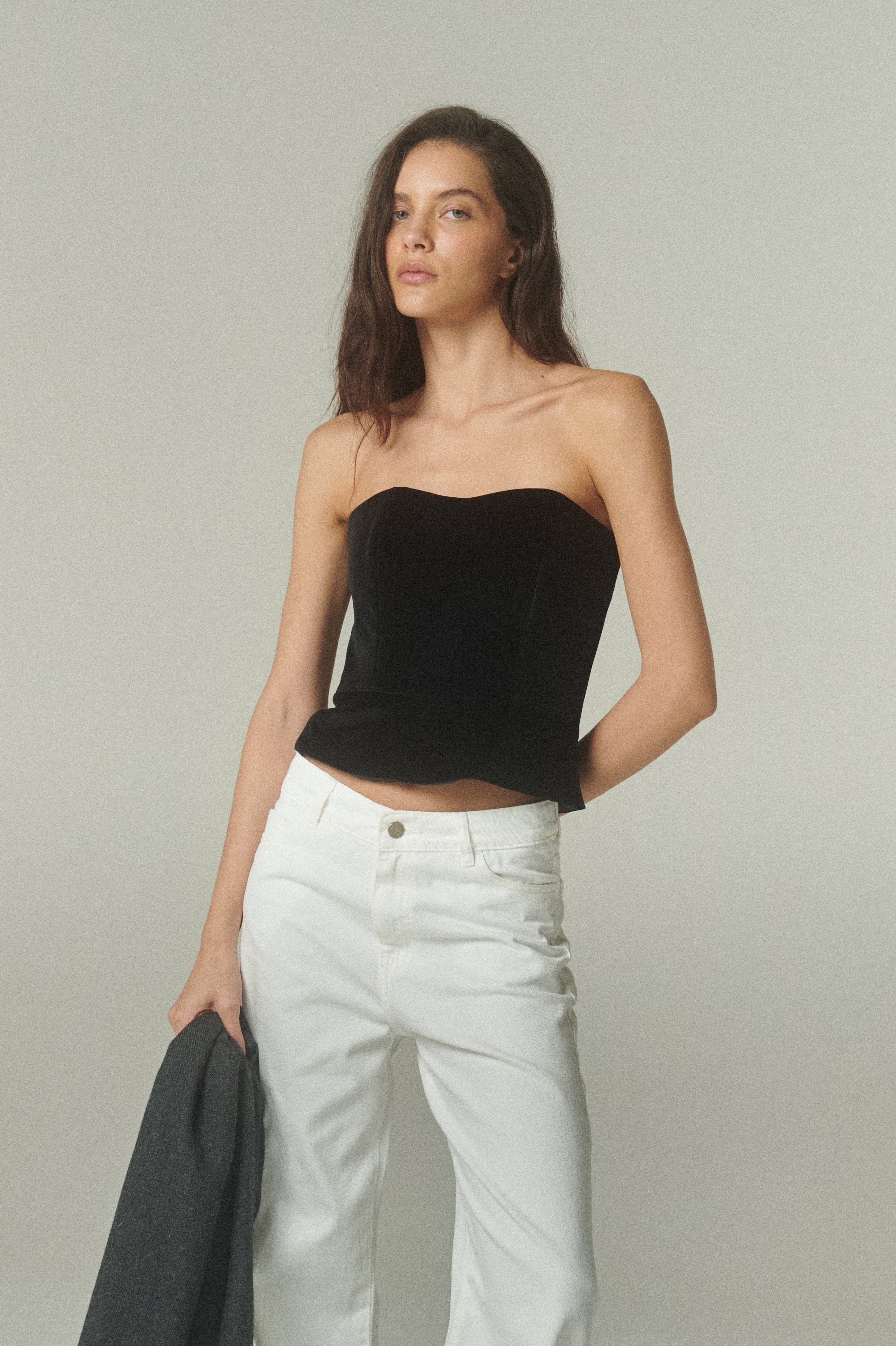 De estructura firme y calce preciso, esta prenda se ajusta al cuerpo de manera impecable, definiendo el torso y realzando la silueta con elegancia. Su diseño strapless deja los hombros al descubierto, mientras el leve faldón aporta equilibrio y un sutil volumen que acompaña el movimiento con naturalidad.