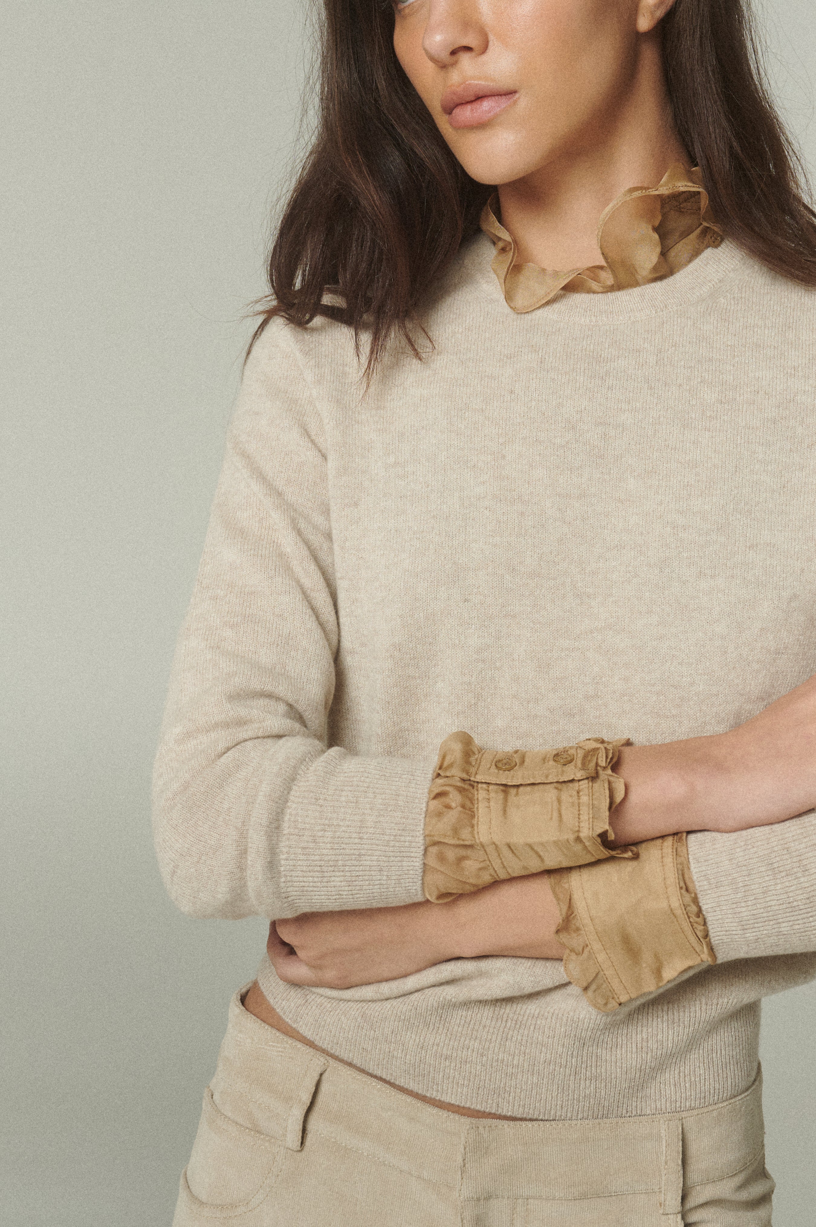 En su versión arena, acompaña el invierno con un abrigo ligero y una suavidad excepcional. De diseño clásico, de cuello redondo y terminaciones acanaladas en cuello, puños y bajo. Una estructura versátil que se adapta con naturalidad a distintos looks y momentos, trascendiendo temporadas.