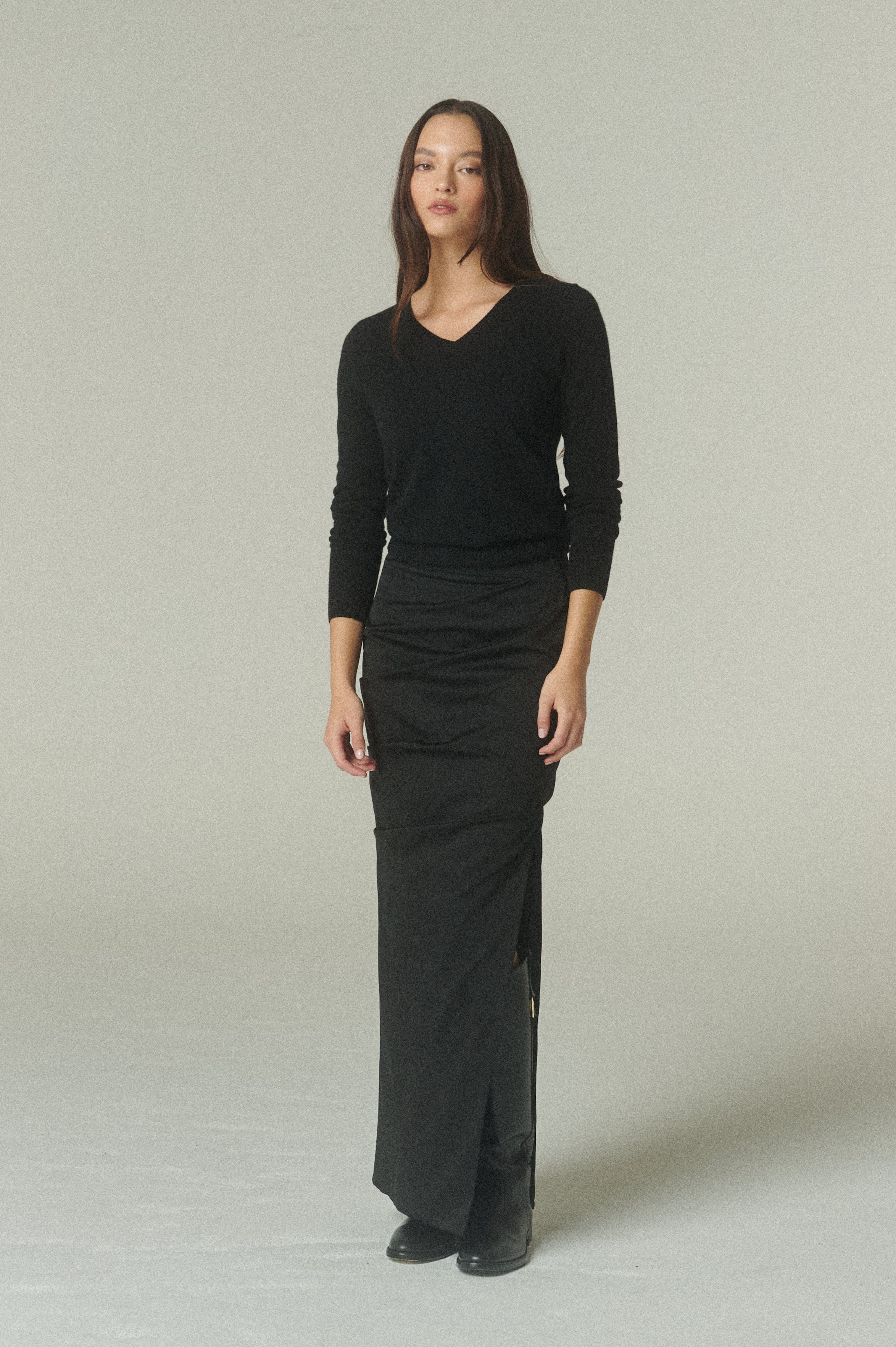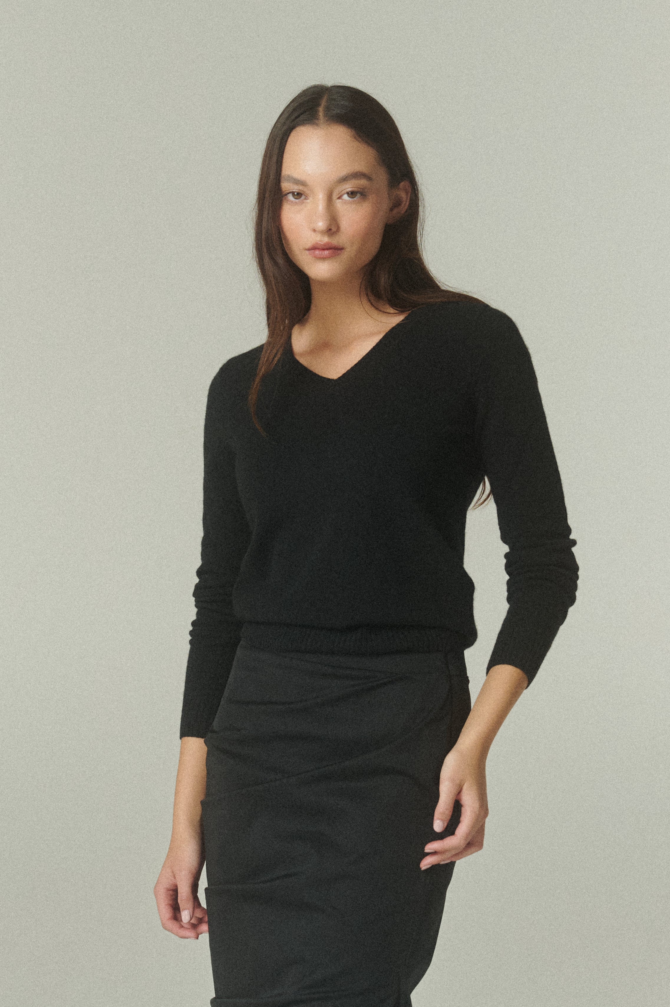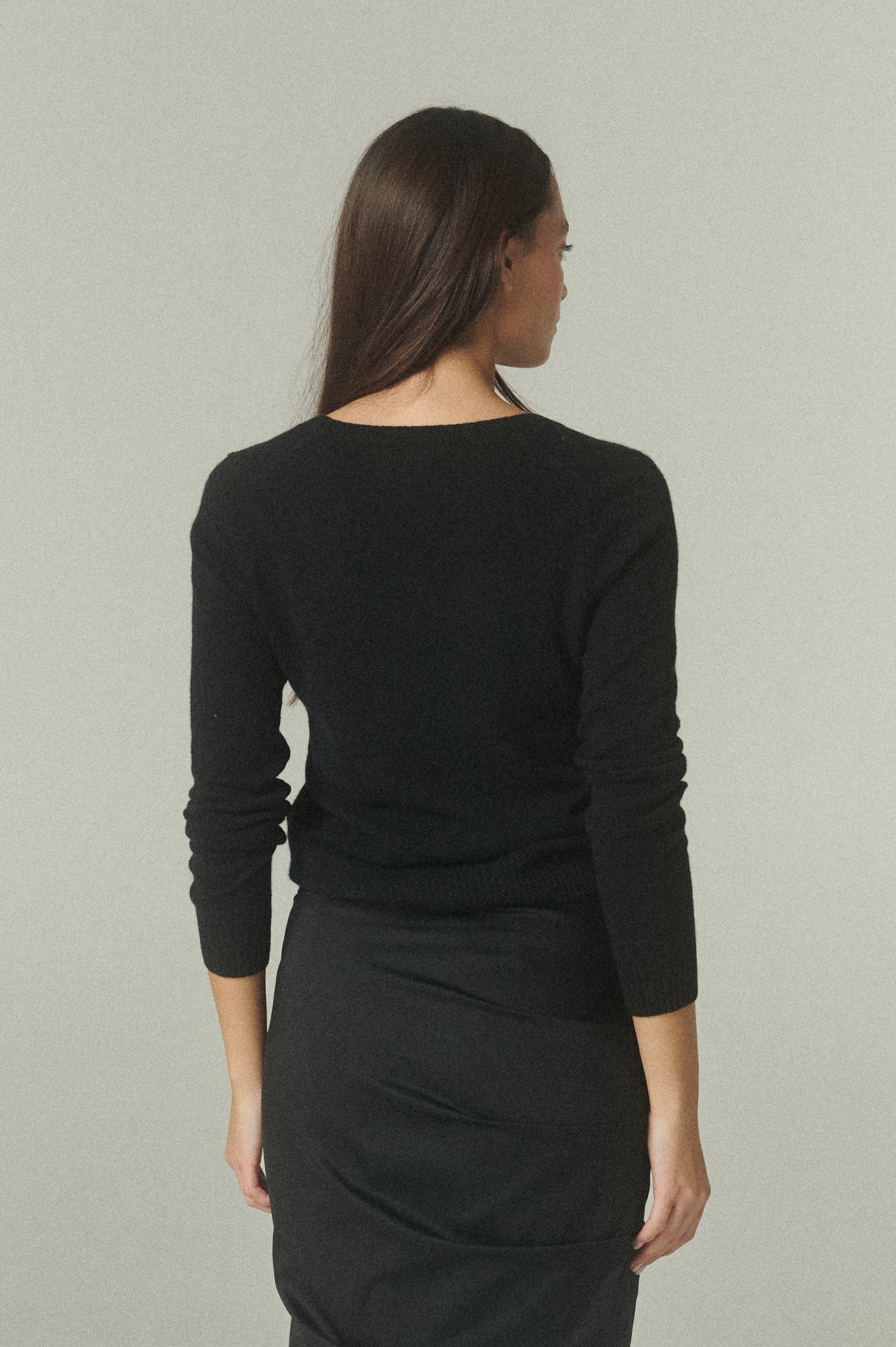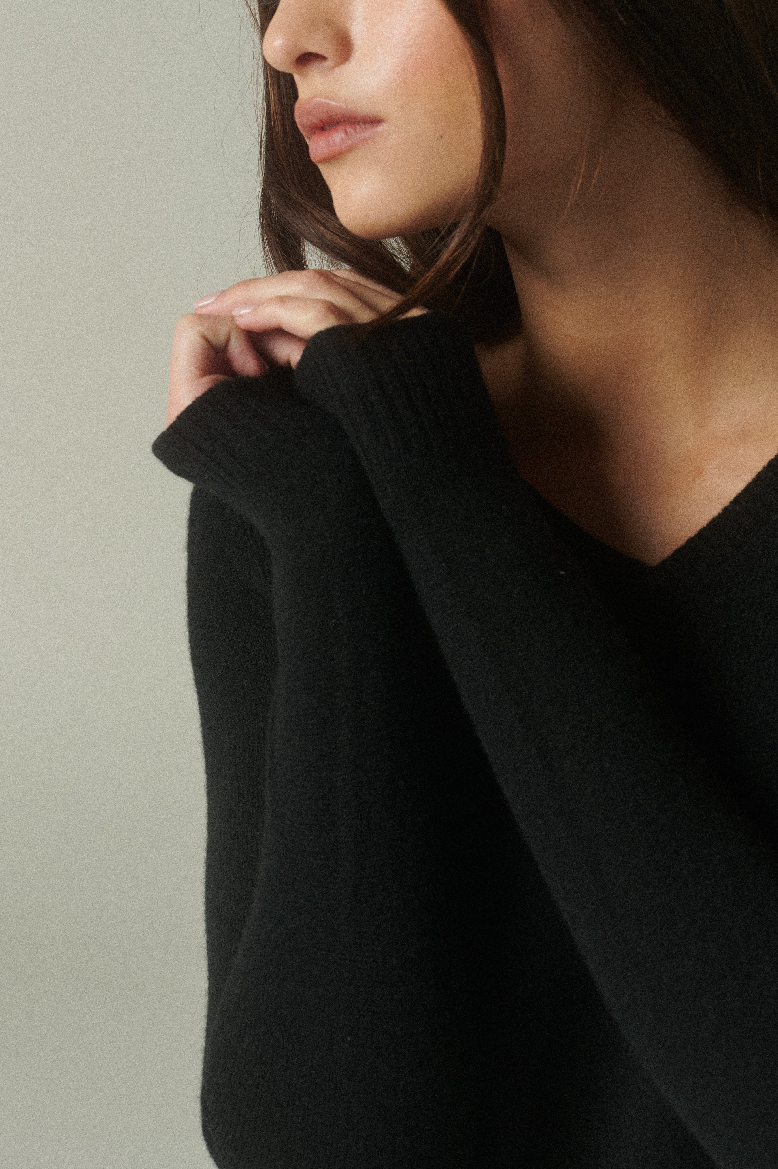 En su versión negro, acompaña el invierno con un abrigo ligero y una suavidad excepcional. De diseño clásico, su escote en V aporta una línea estilizada y versátil, ideal para superponer con otras prendas. Las terminaciones acanaladas en cuello, puños y bajo completan una estructura que se adapta con naturalidad a distintos looks y momentos, trascendiendo temporadas.