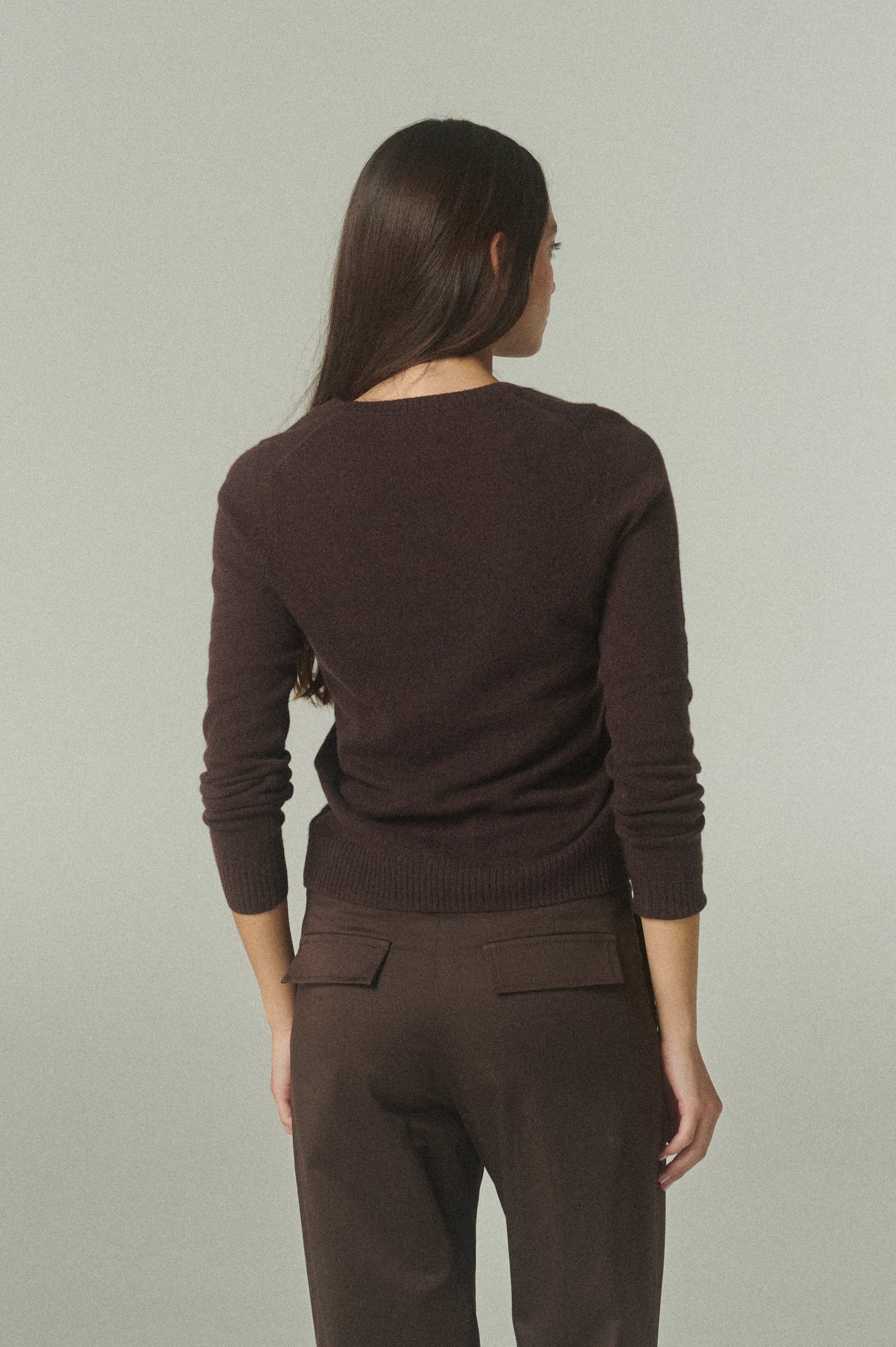 En su versión café, acompaña el invierno con un abrigo ligero y una suavidad excepcional. De diseño clásico, su escote en V aporta una línea estilizada y versátil, ideal para superponer con otras prendas. Las terminaciones acanaladas en cuello, puños y bajo completan una estructura que se adapta con naturalidad a distintos looks y momentos, trascendiendo temporadas.
