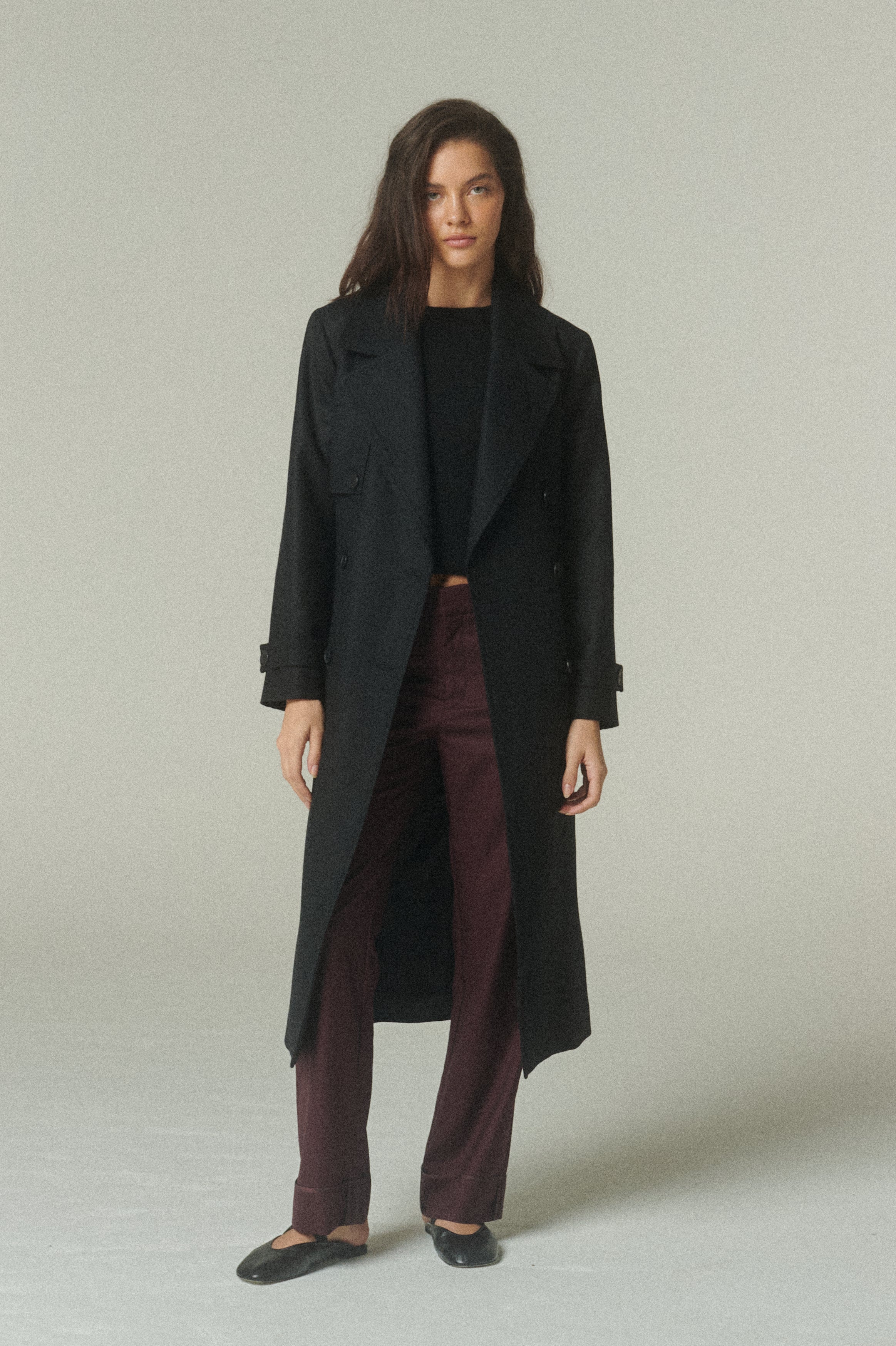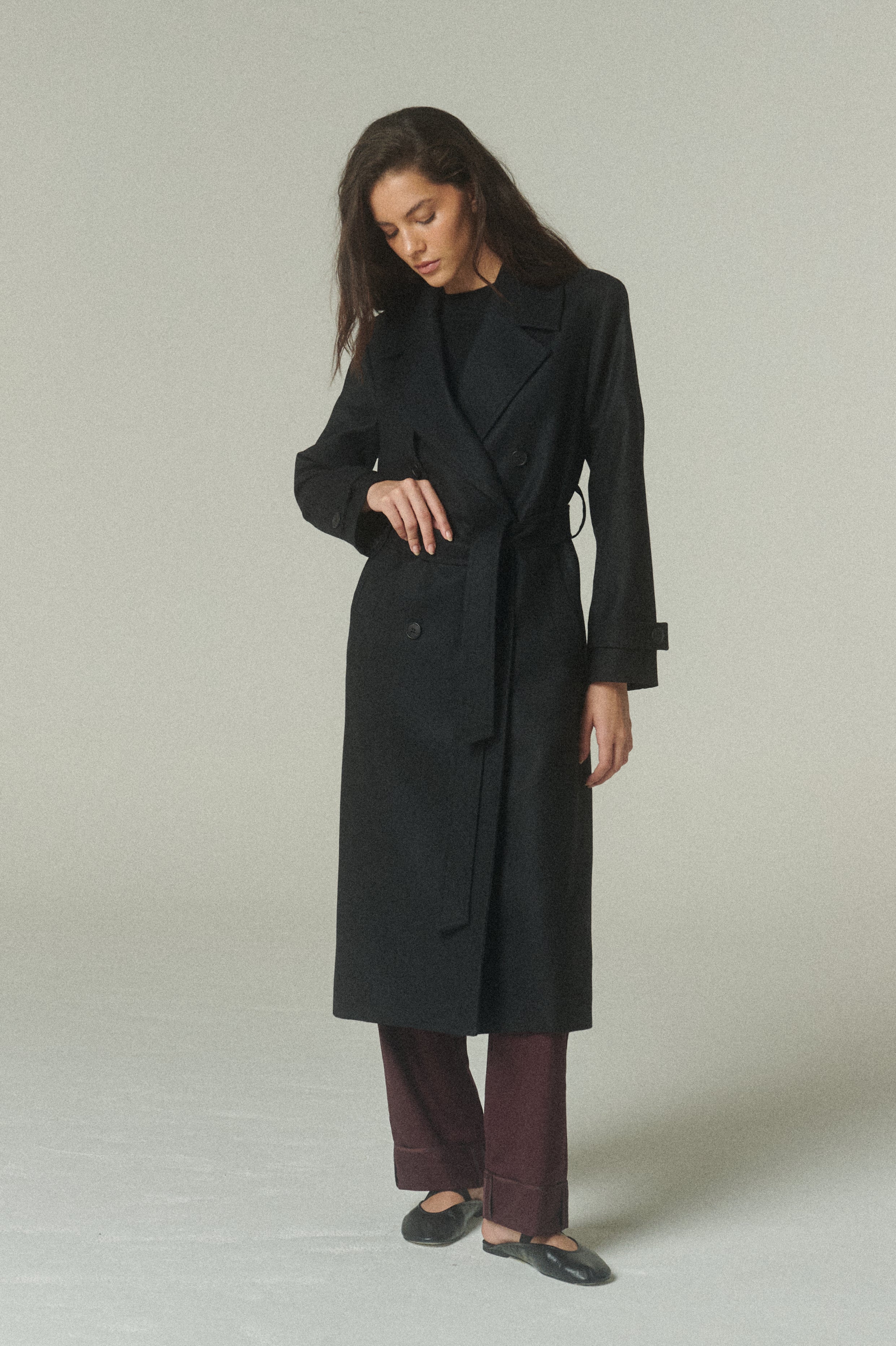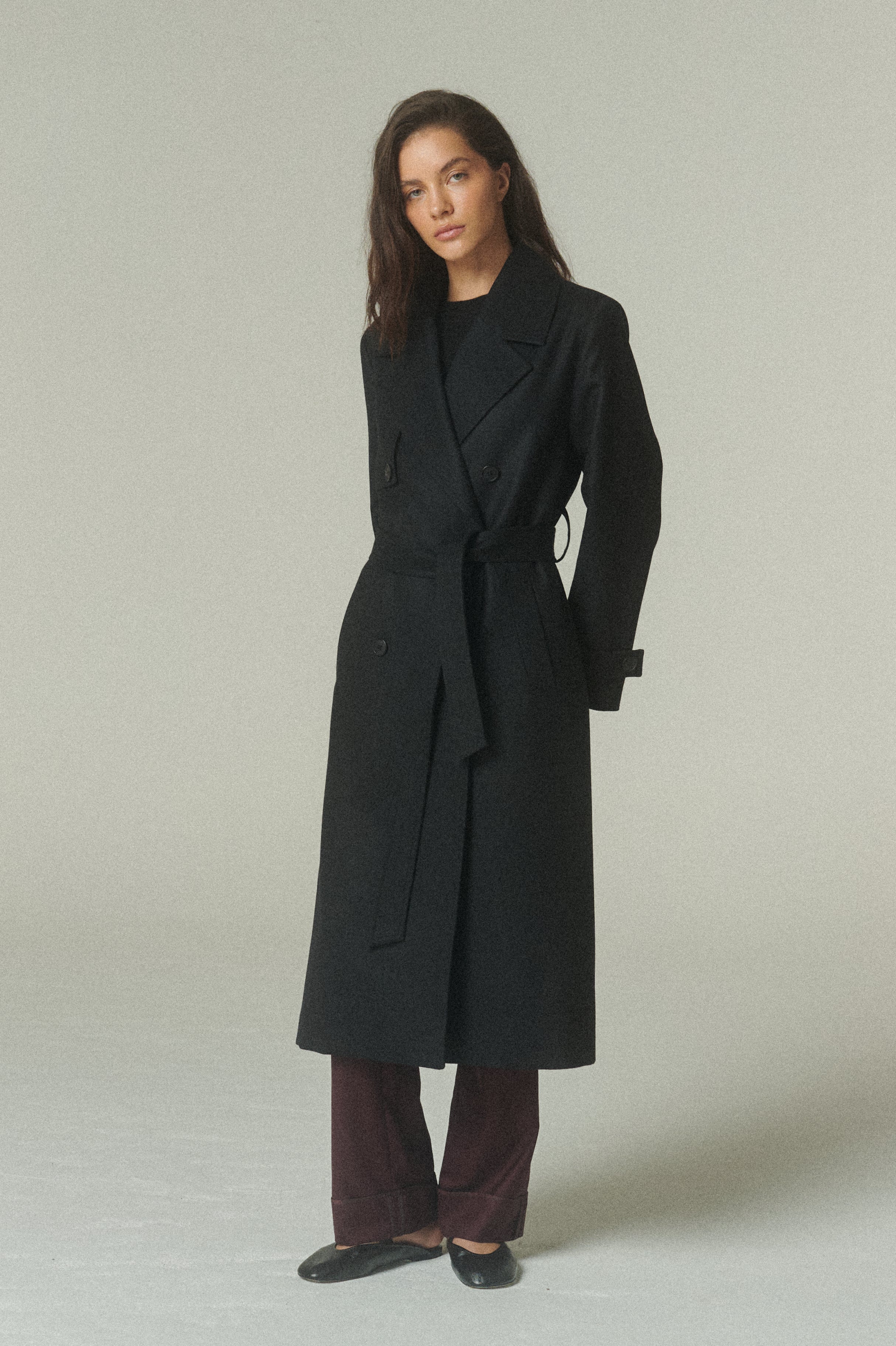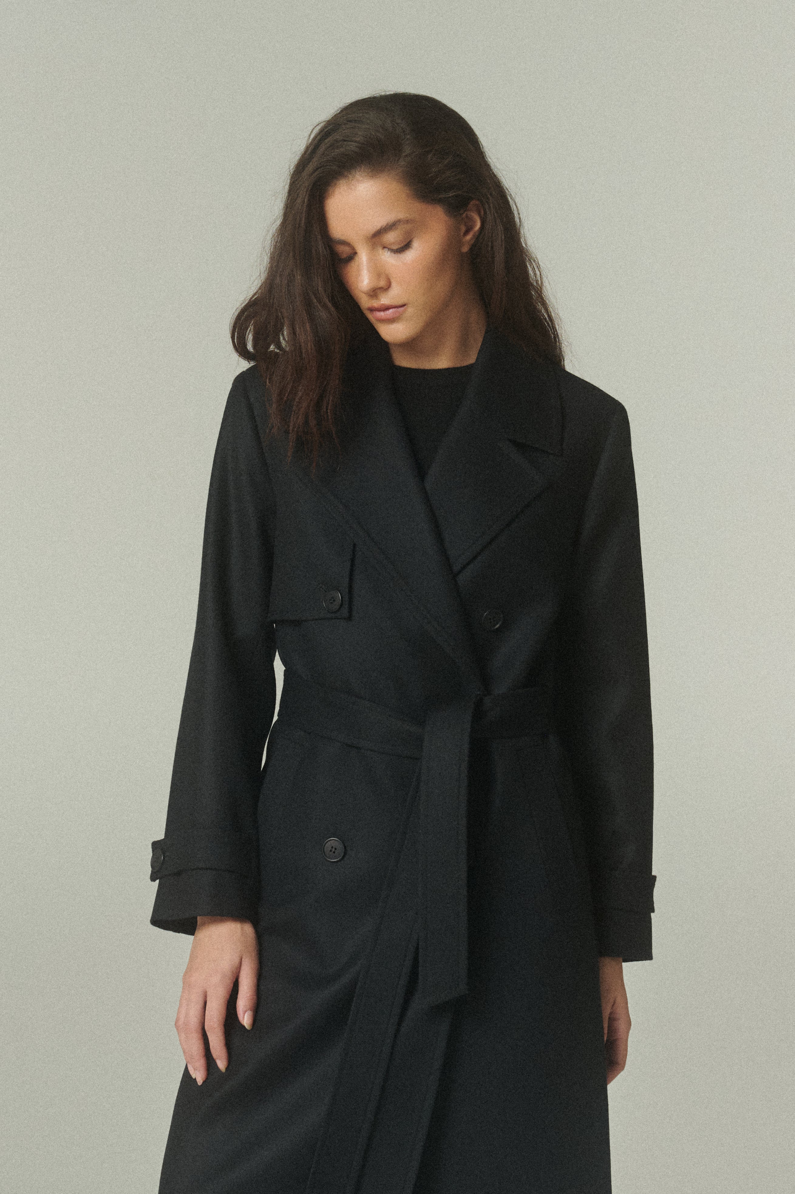 Nuestro Trench es la combinación perfecta entre abrigo, comodidad y estilo. Confeccionado en 100% lana negro de alta calidad, que destaca por su textura suave y su caída elegante, siendo el resultado de un diseño lento y ético.