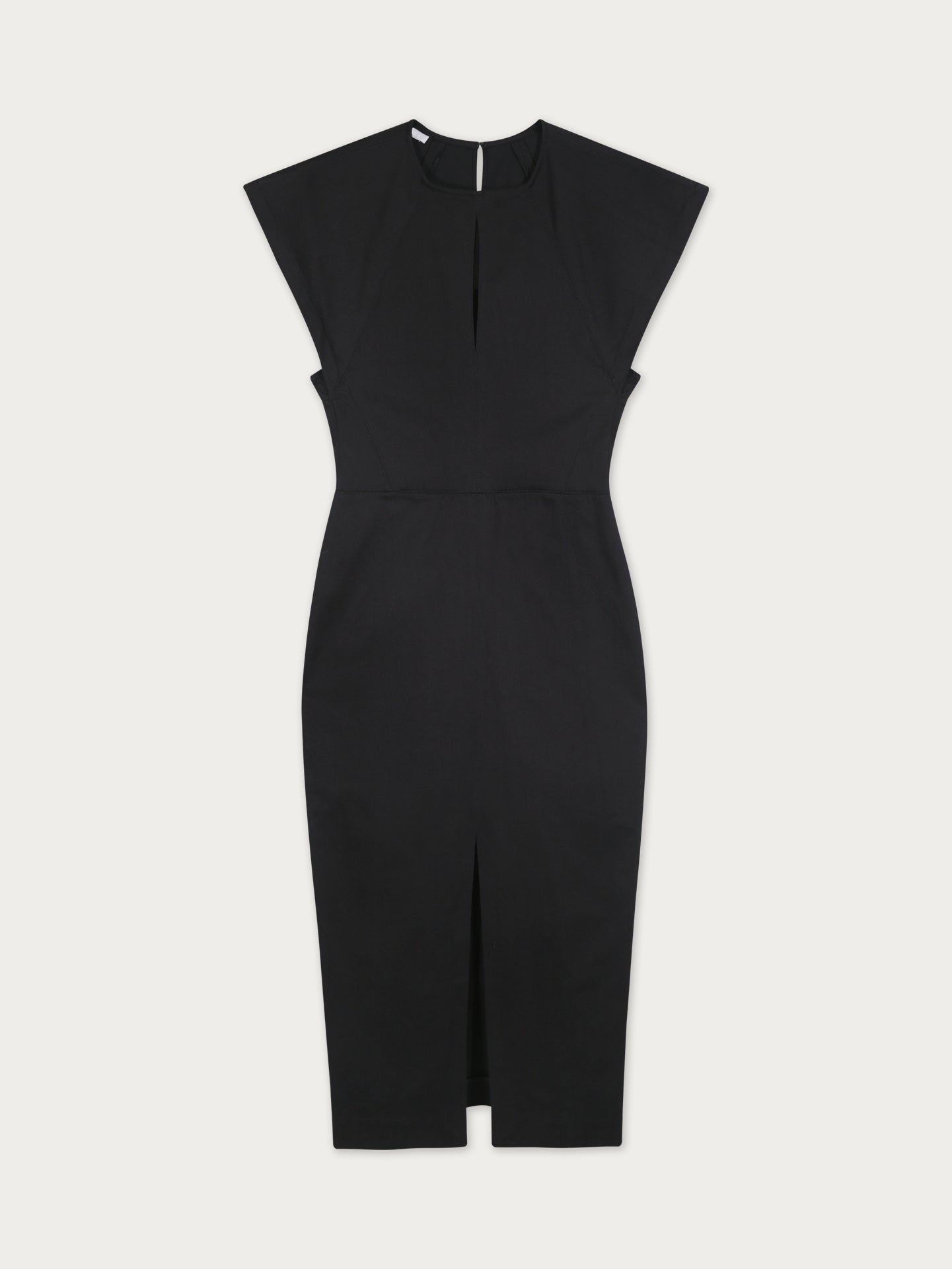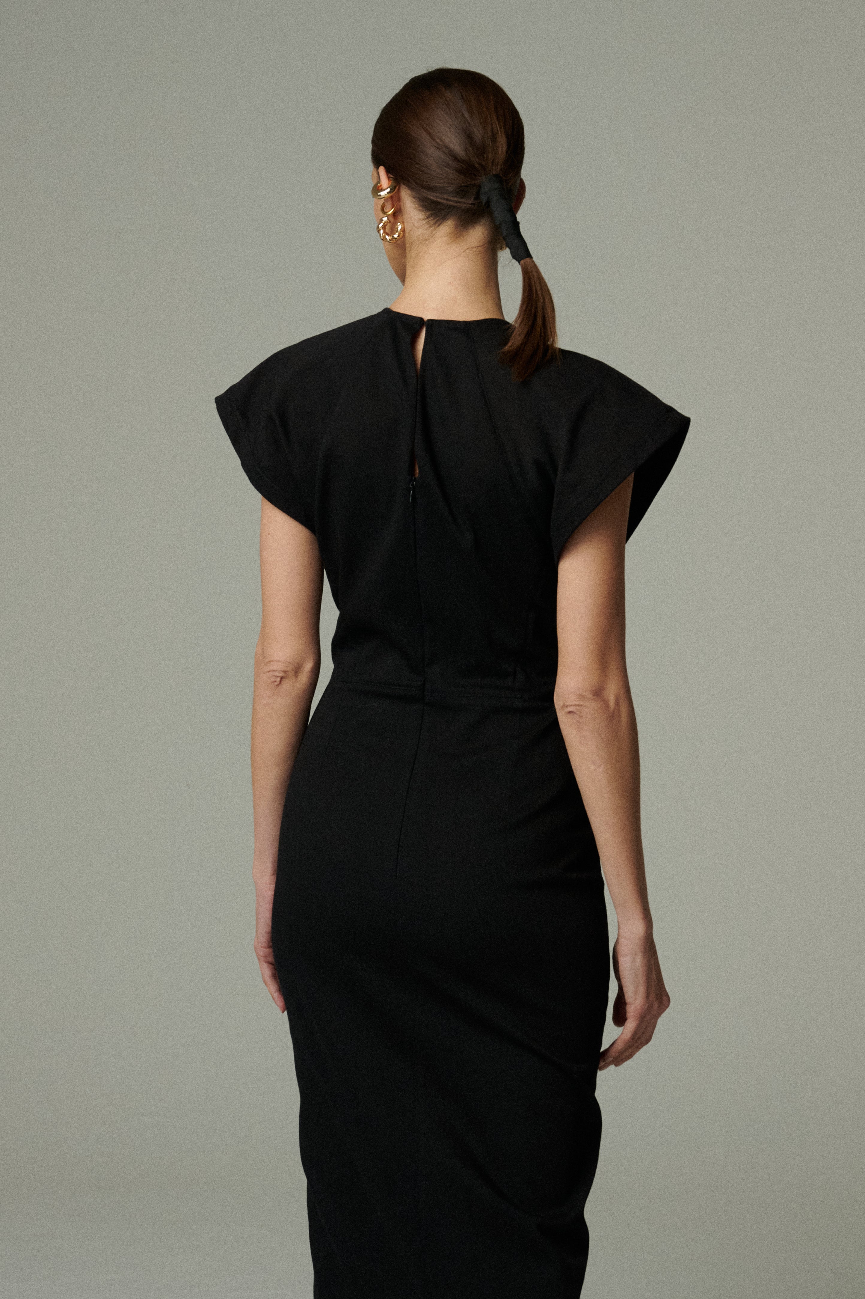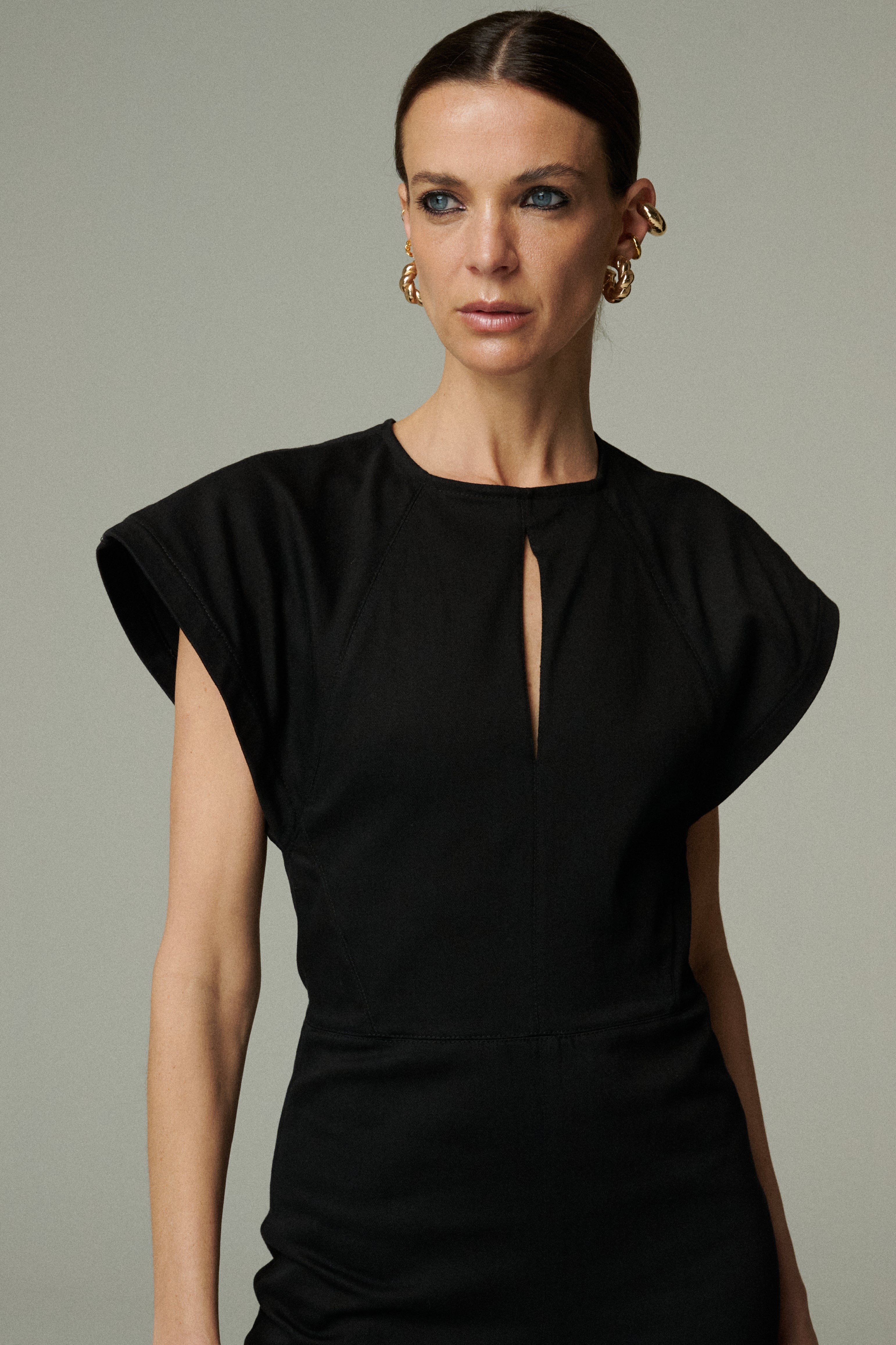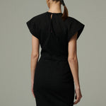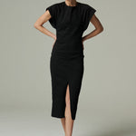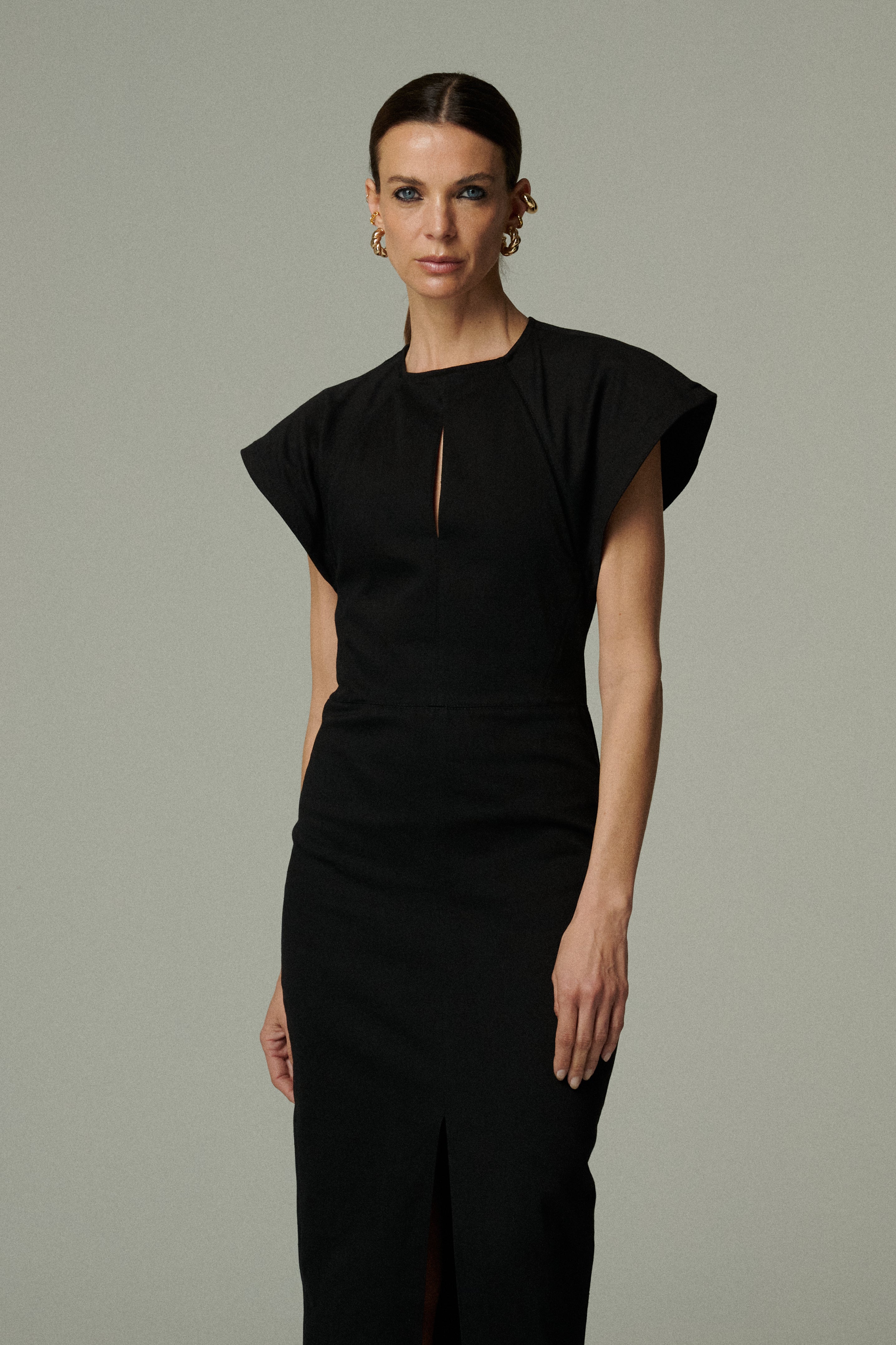 Vestido midi confeccionado en denim negro, con escote cerrado y un delicado corte en el centro que añade un detalle sutil a la silueta. Sus mangas románticas le dan un aire femenino y chic, logrando un equilibrio entre lo clásico y lo actual. Una pieza versátil que funciona tanto en looks cotidianos como en ocasiones especiales.