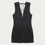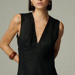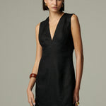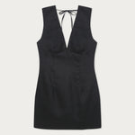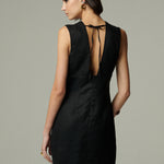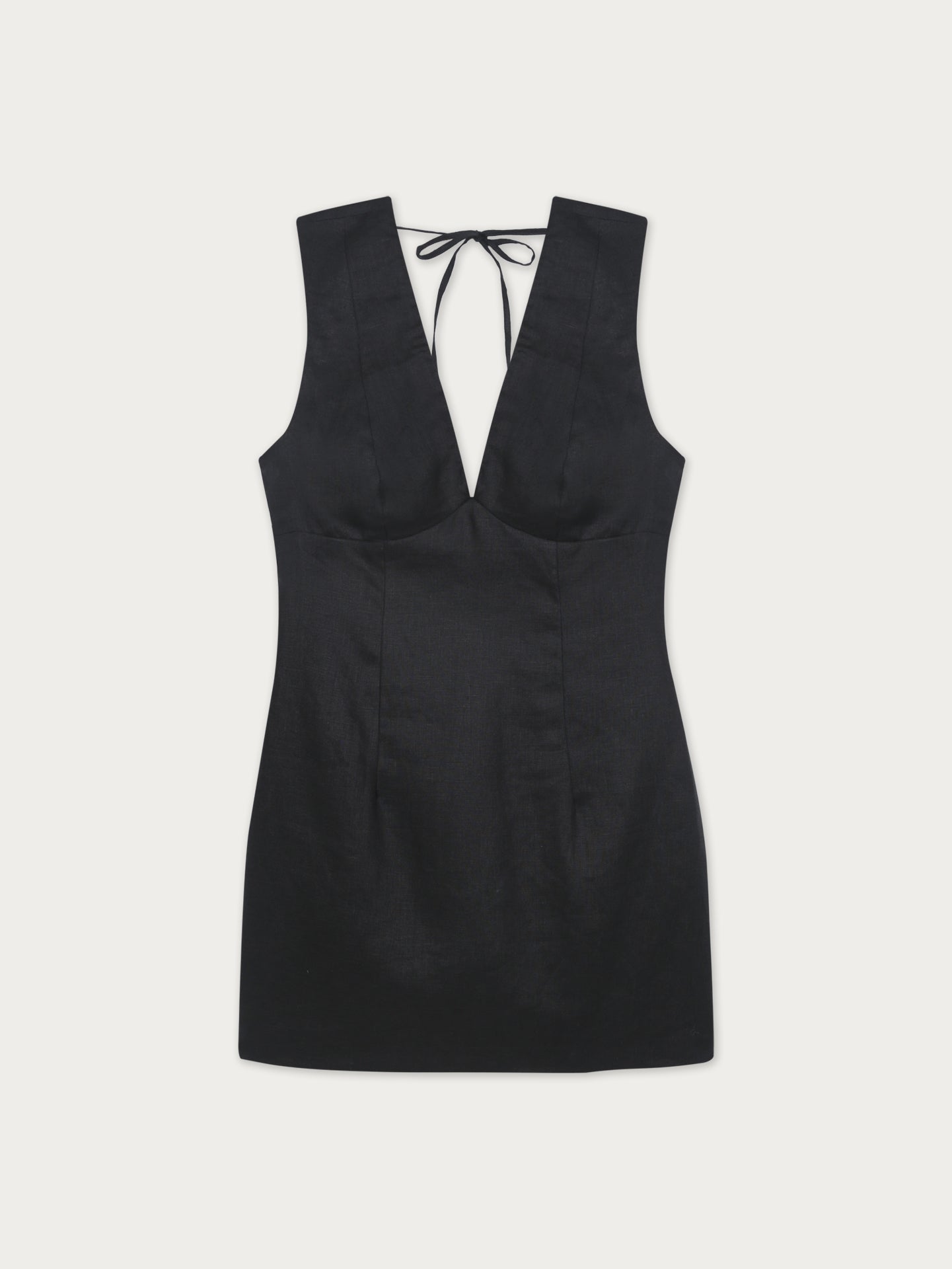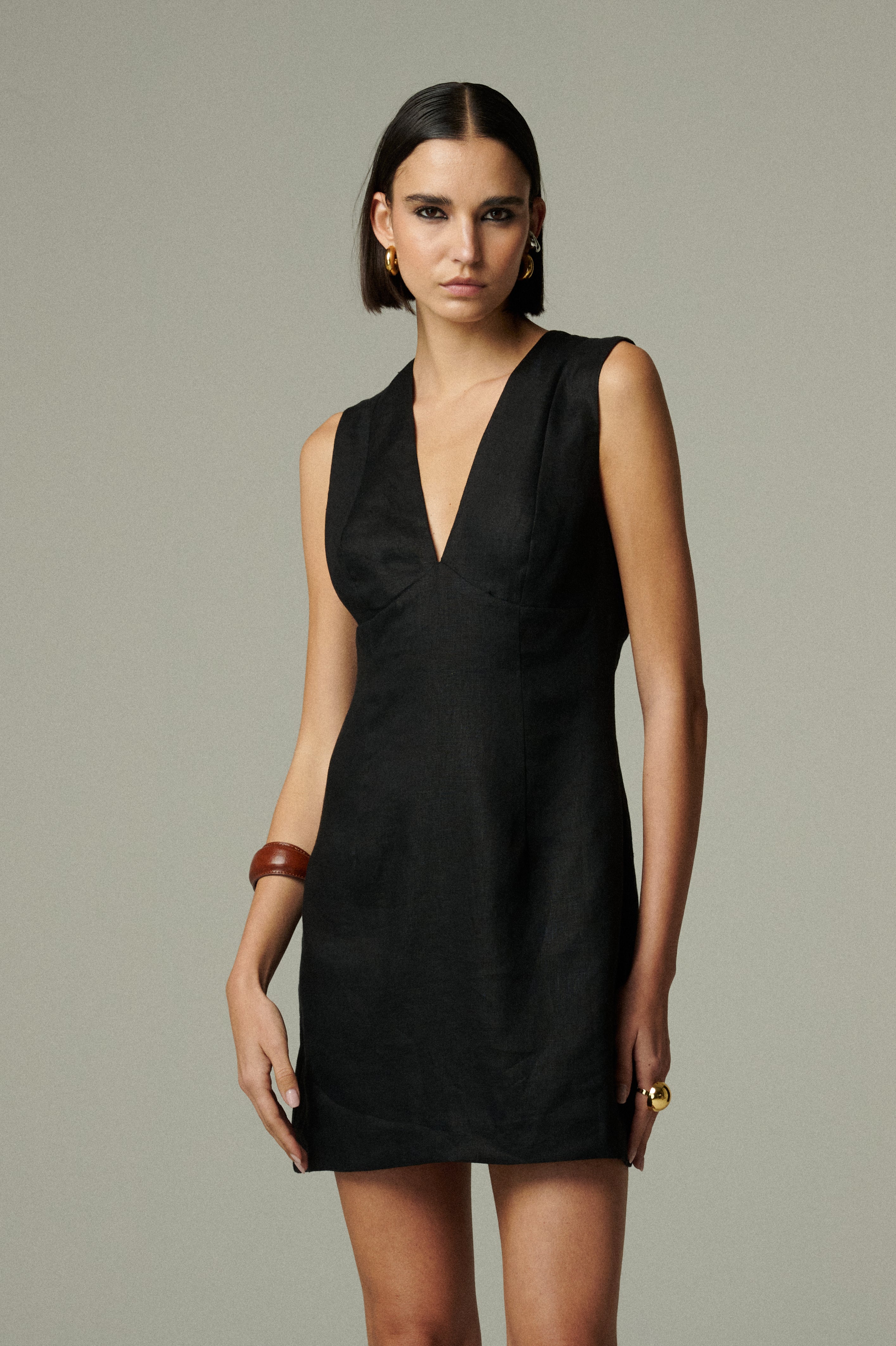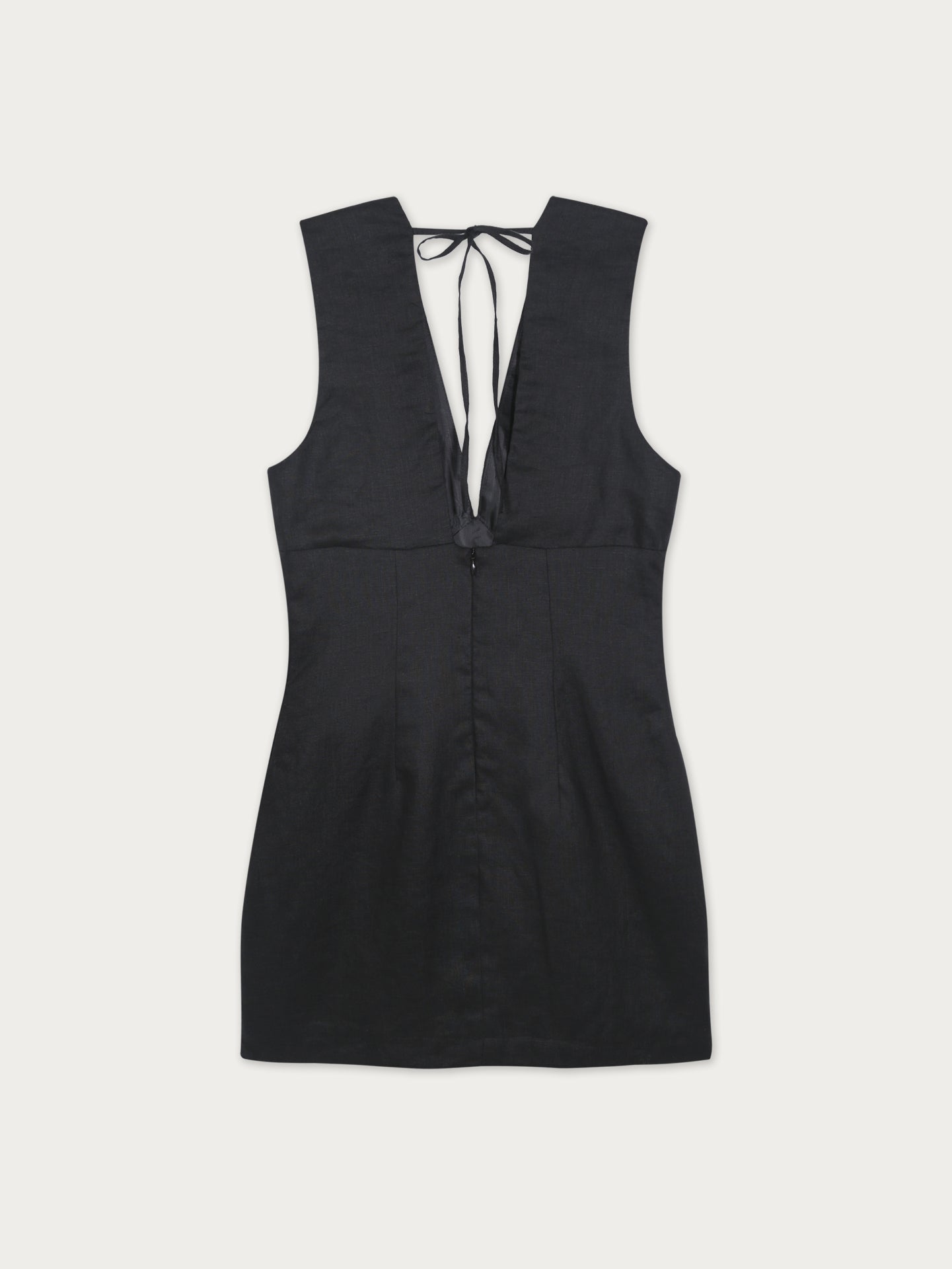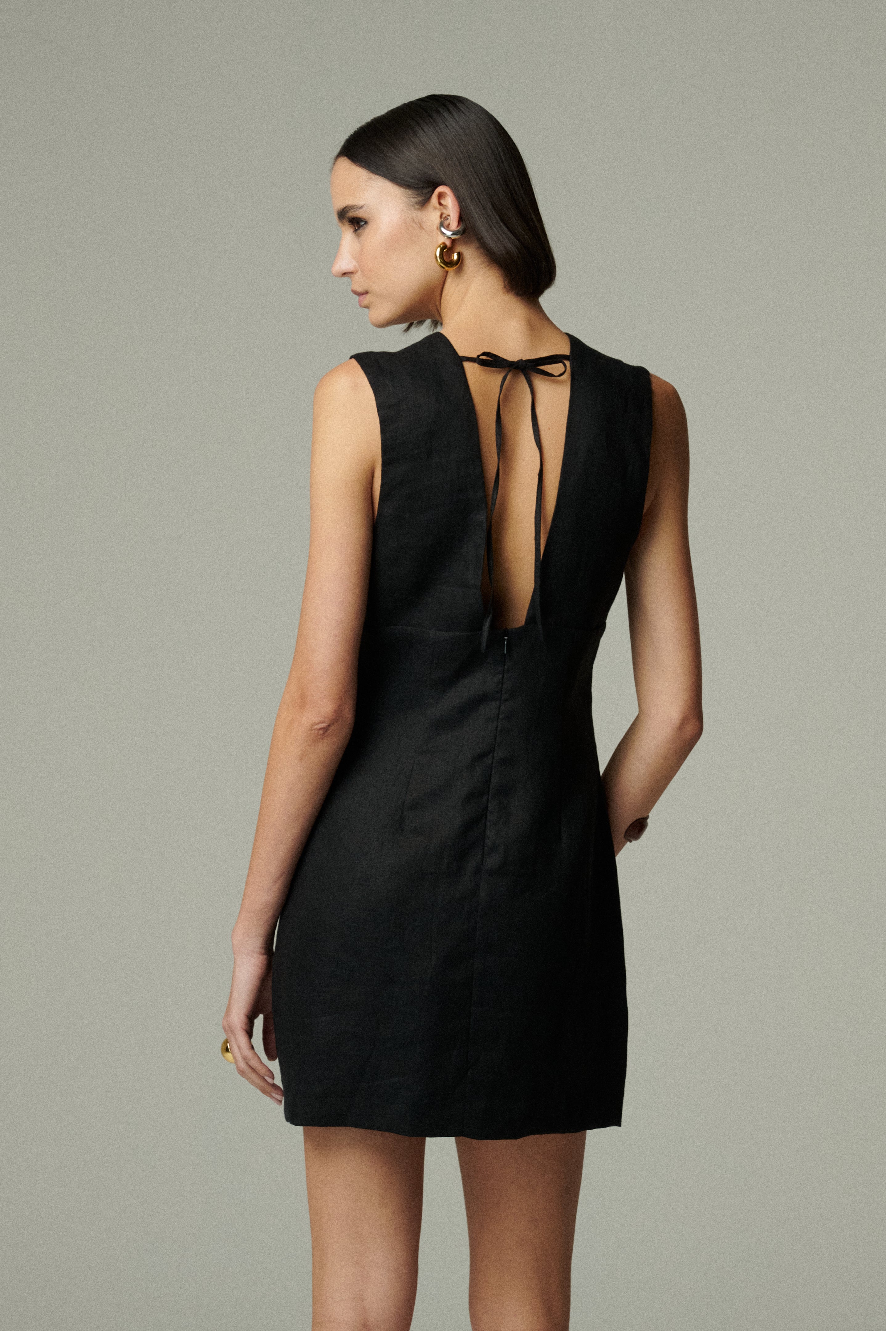 Corto y femenino, este vestido de 100% lino negro combina un diseño clásico con un giro coqueto. Su escote y las cintas anchas que recorren desde el frente hasta la espalda descubren la piel con sutileza. Suelto y ligero, se adapta a múltiples ocasiones, con un aire versátil y elegante.