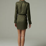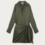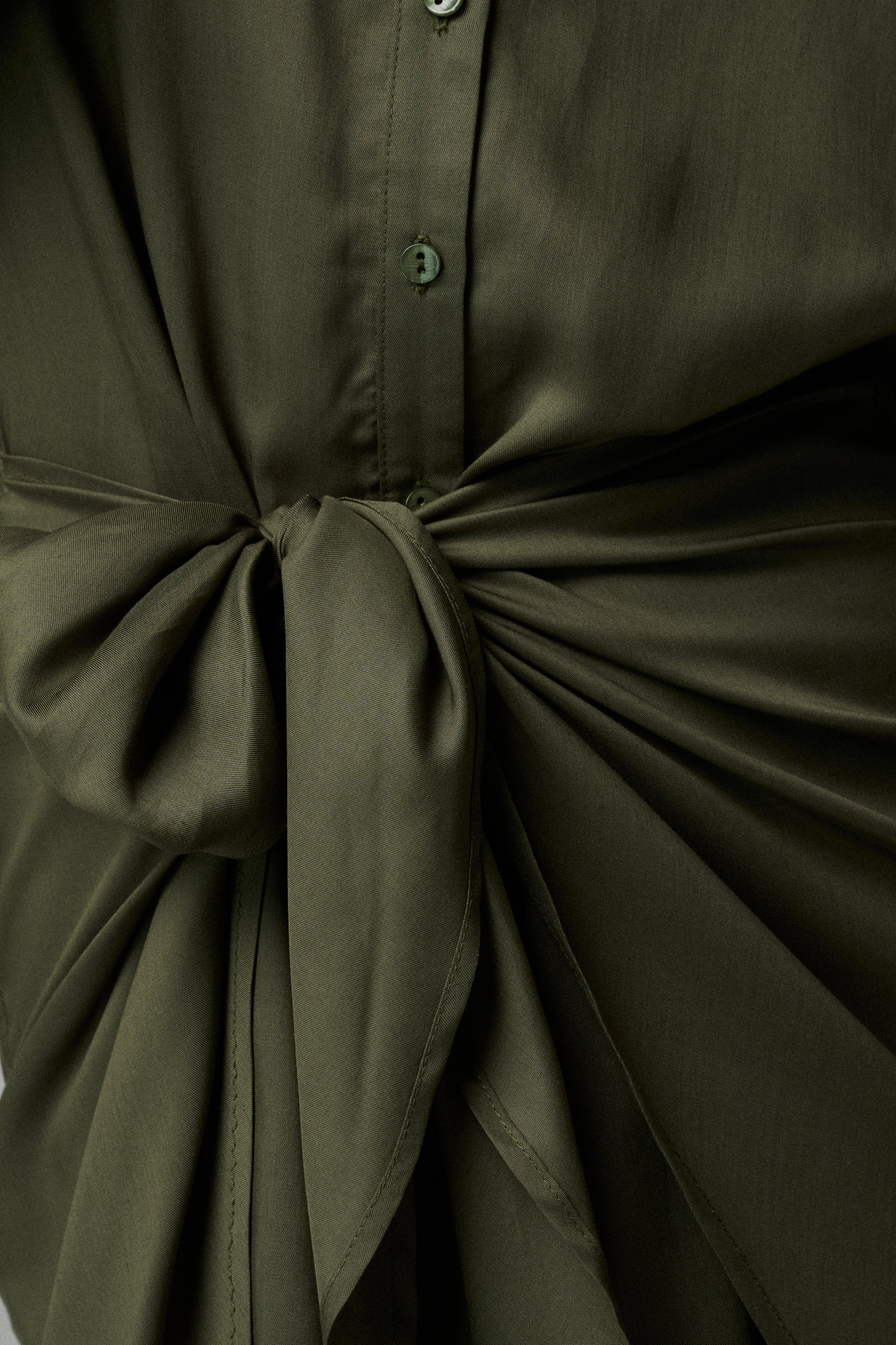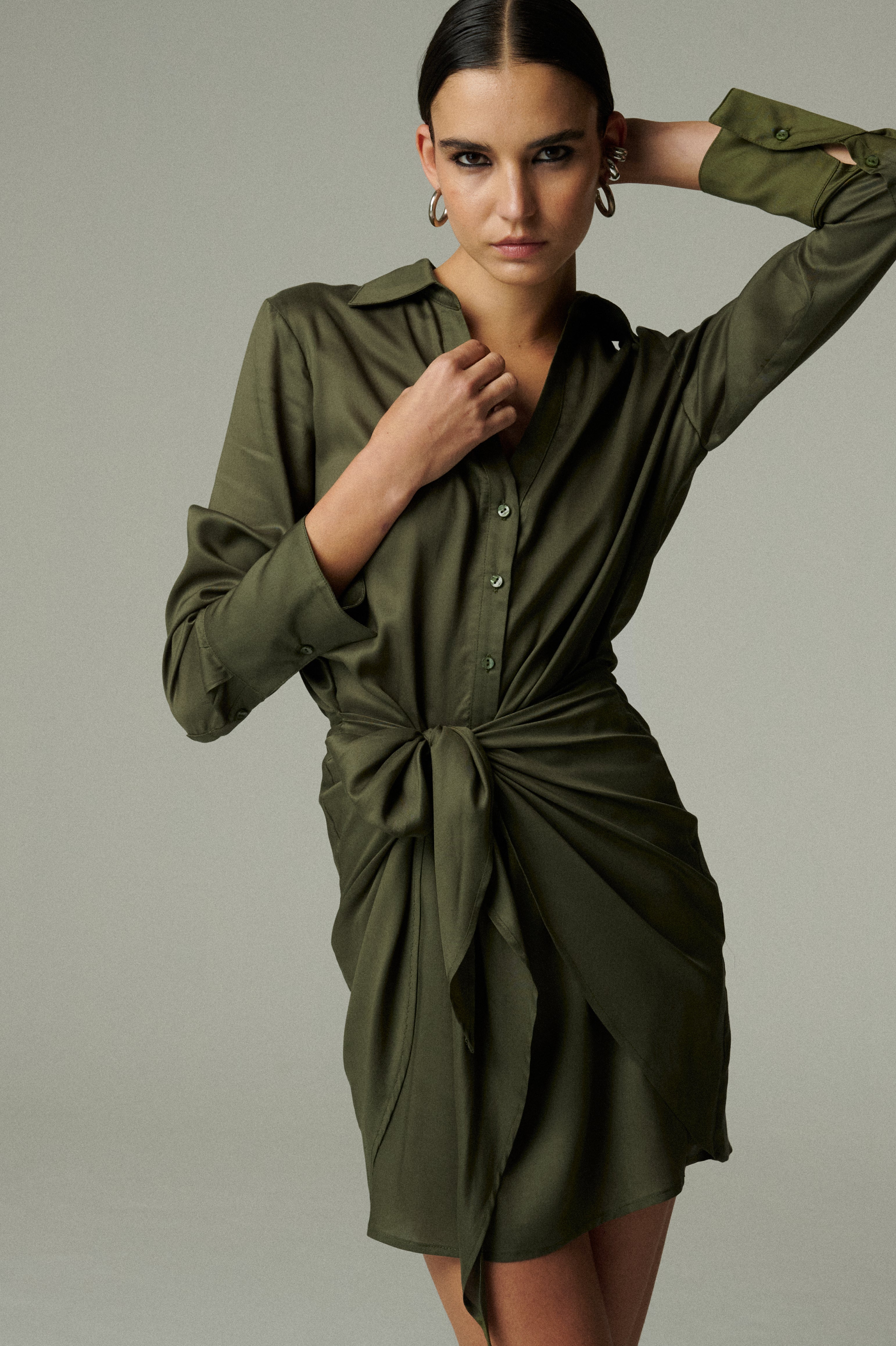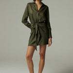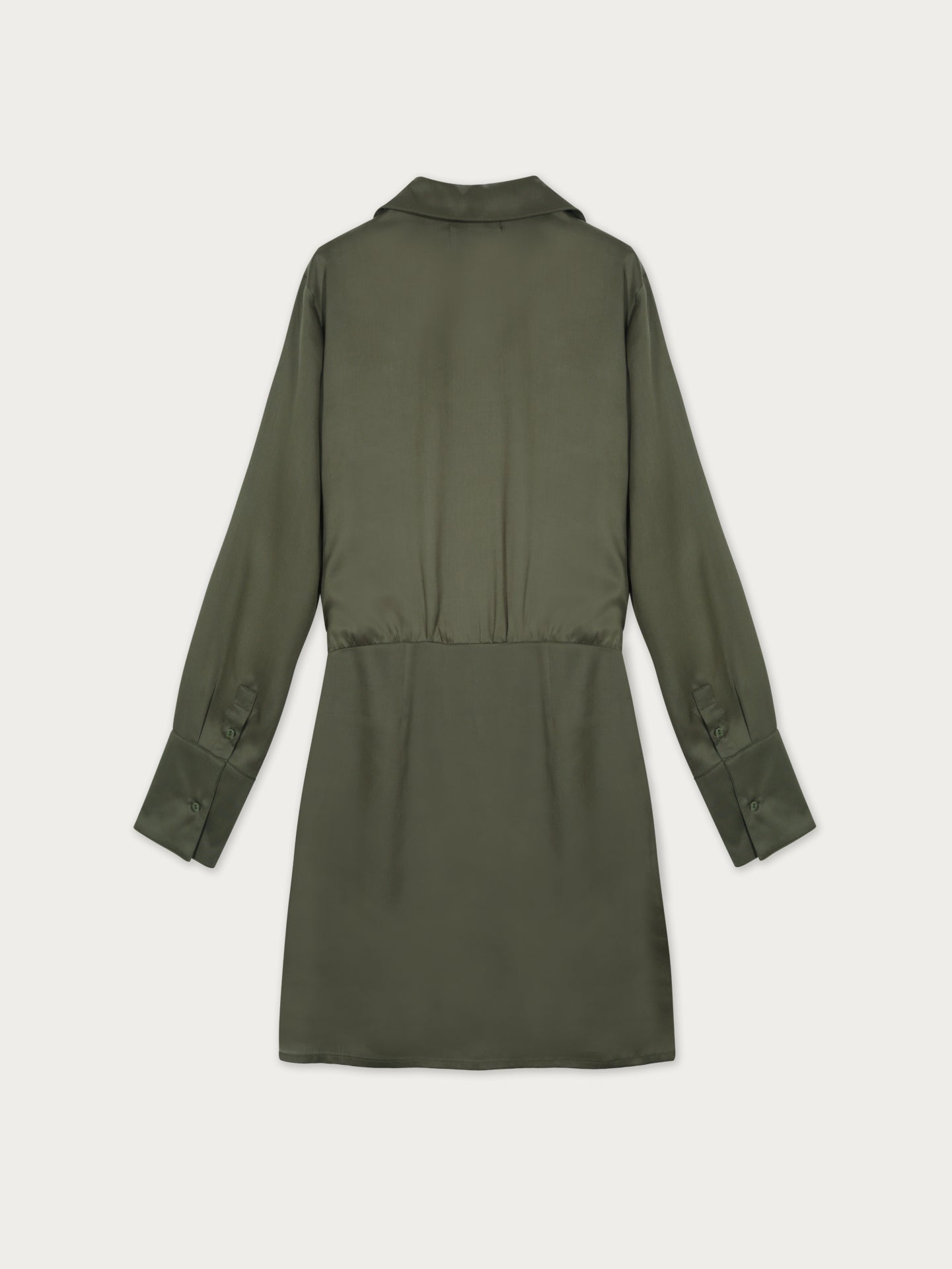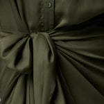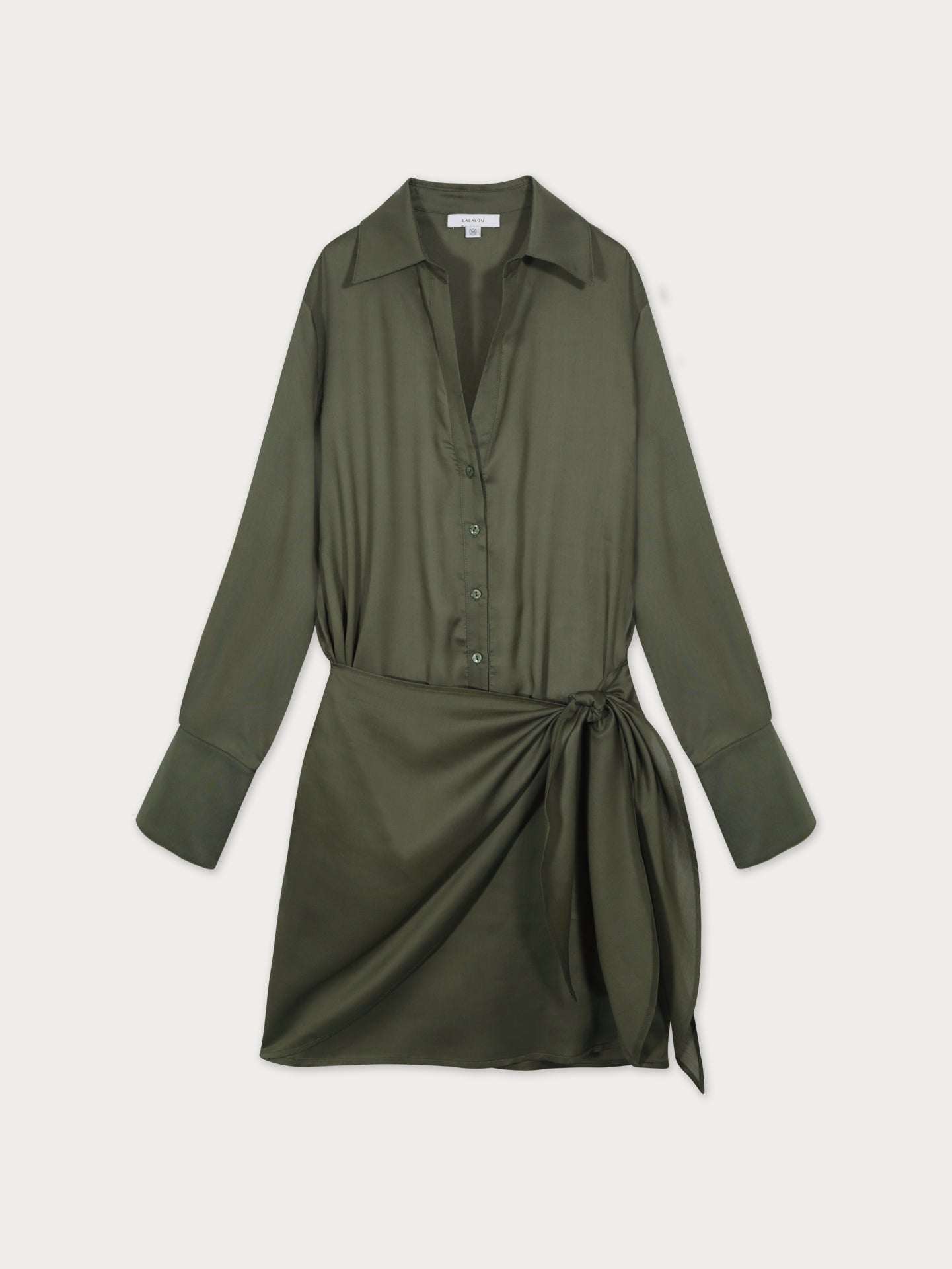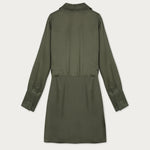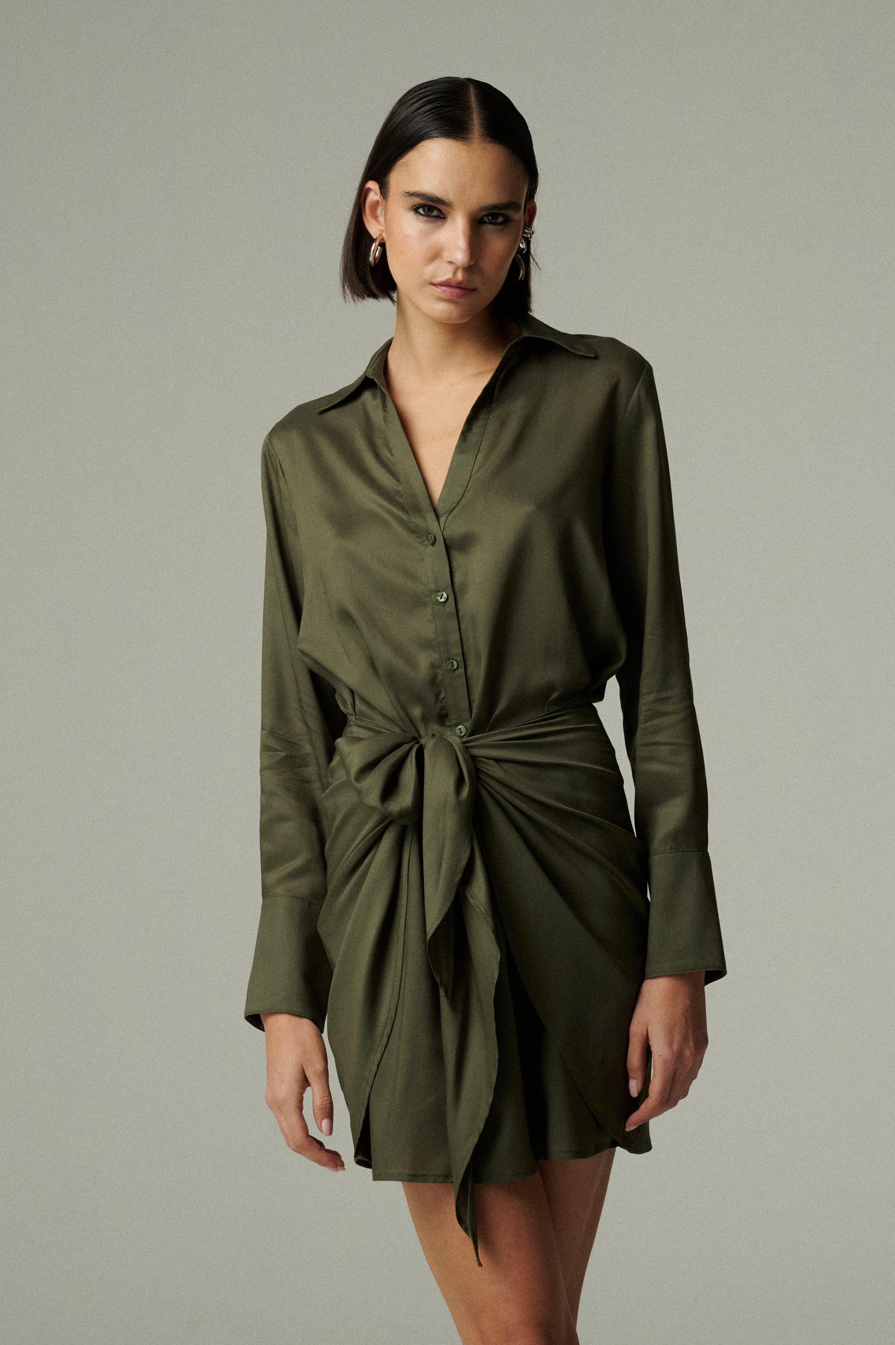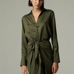 Corto y suelto, este vestido de Seda y algodon de color verde de alta calidad se inspira en la fluidez de un blusón. Las mangas largas equilibran la ligereza del diseño, mientras un amarra ajusta la cintura y aporta dimensión a la silueta. Atemporal y sofisticado, pensado para destacar con naturalidad.