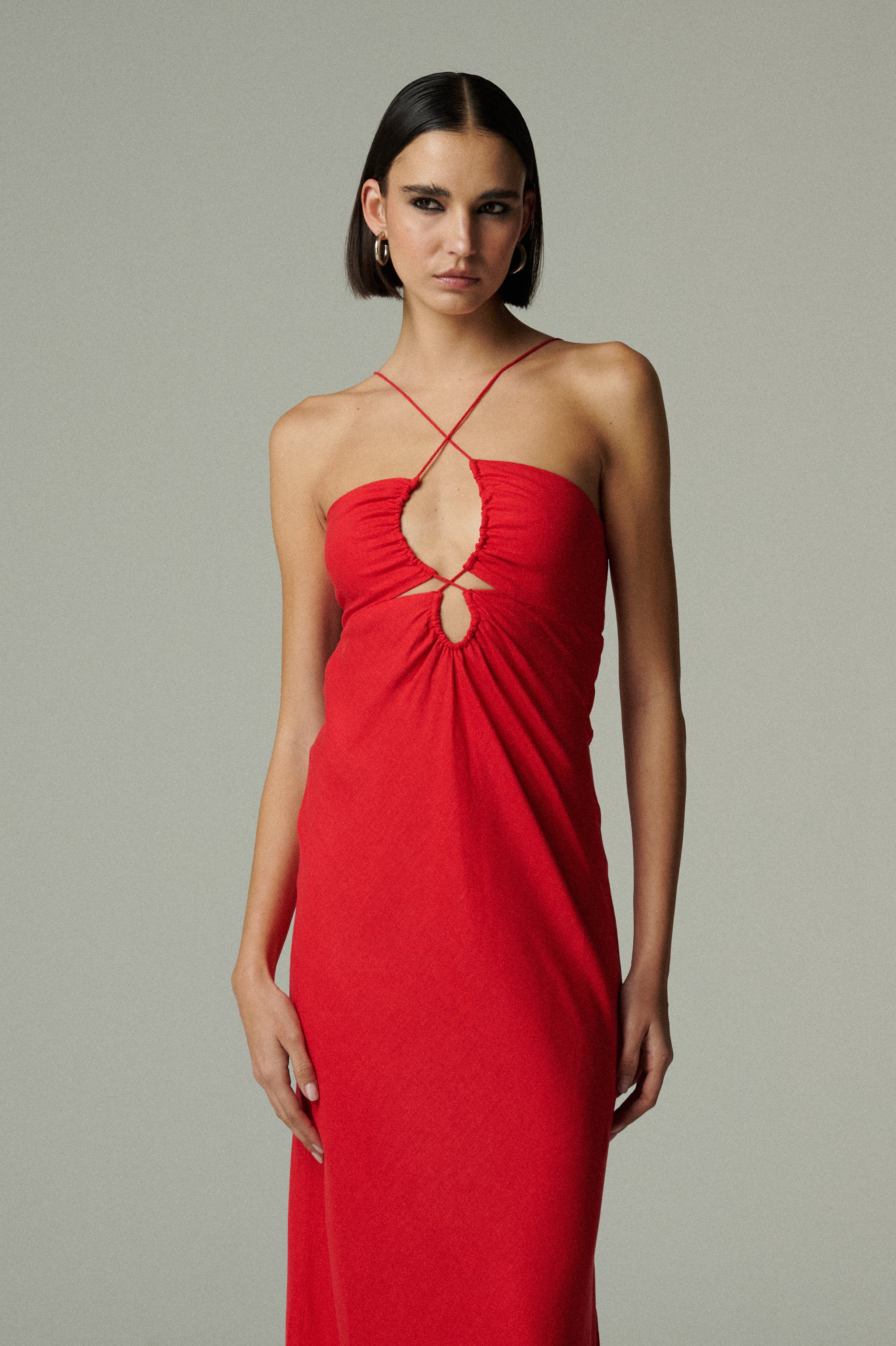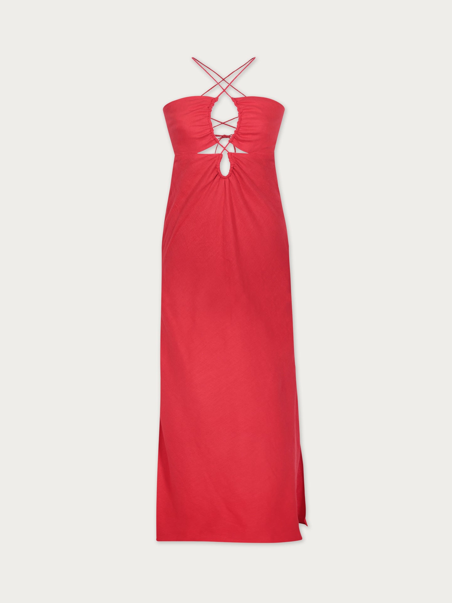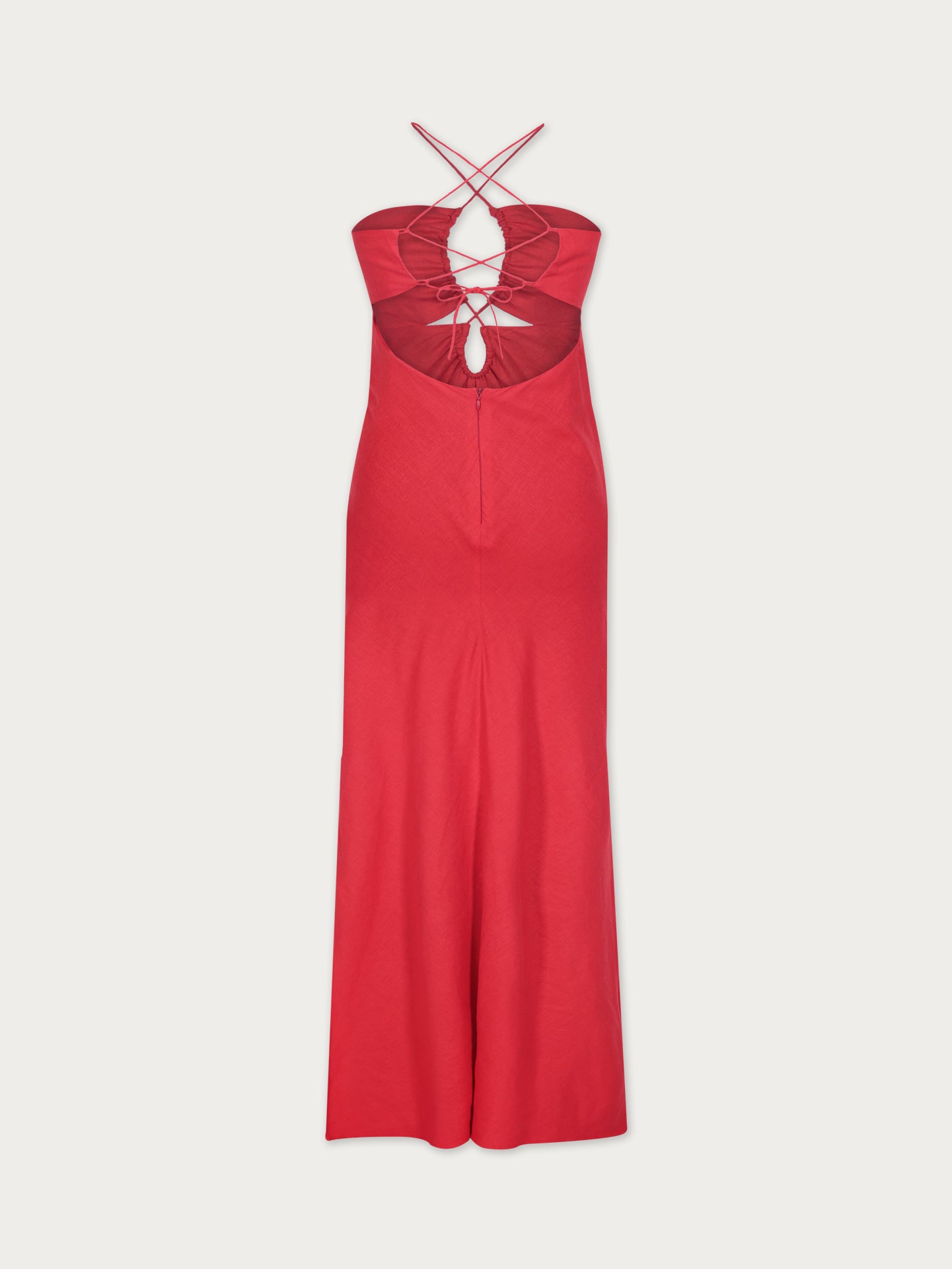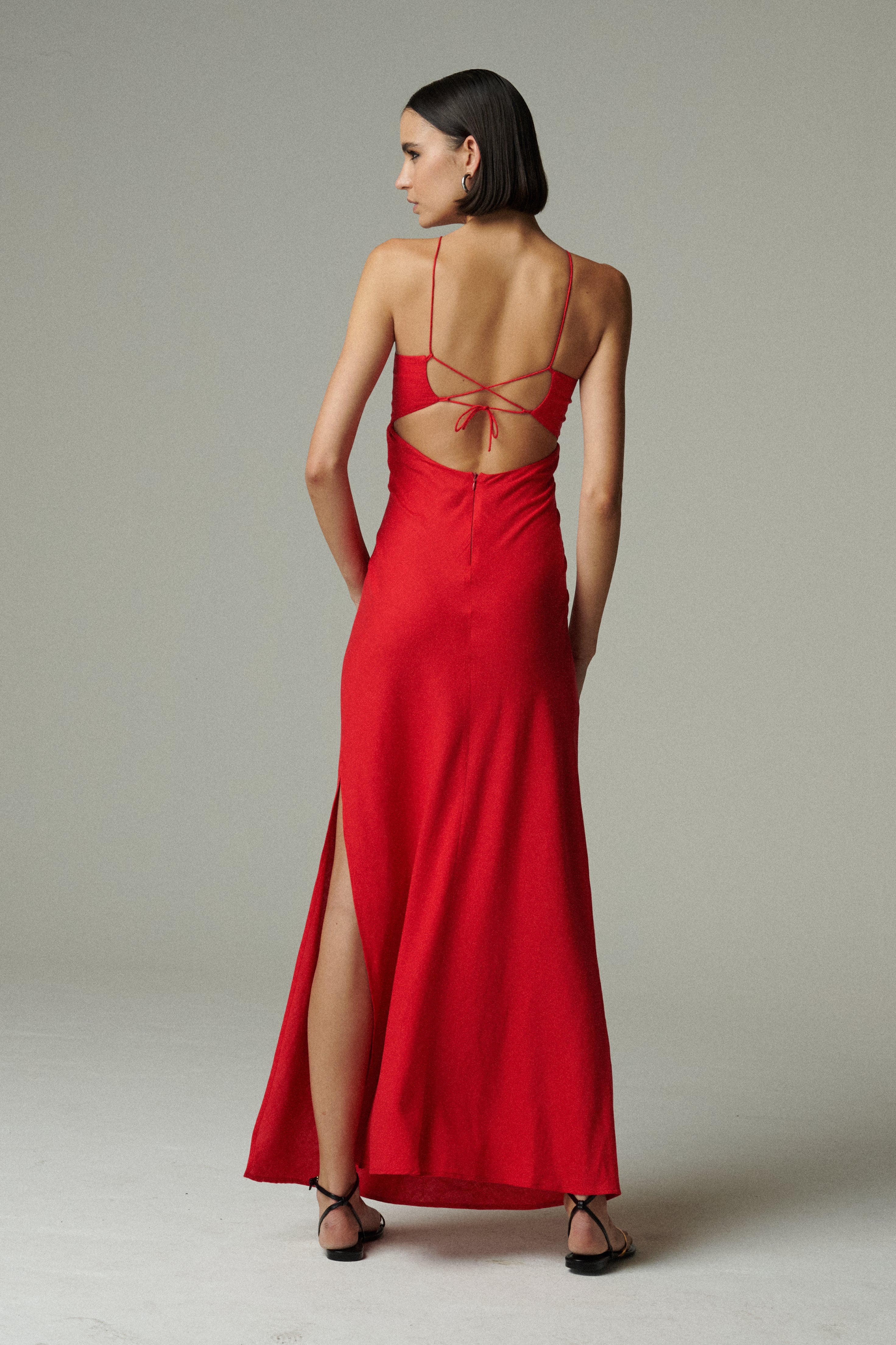 Nuestro vestido Turín está confeccionado en 100% lino de un rojo intenso. Un vestido largo con escote y tirantes delgados combinan sensualidad y elegancia. Una pieza atrevida y chic, que transmite energía y sofisticación en partes iguales.