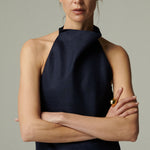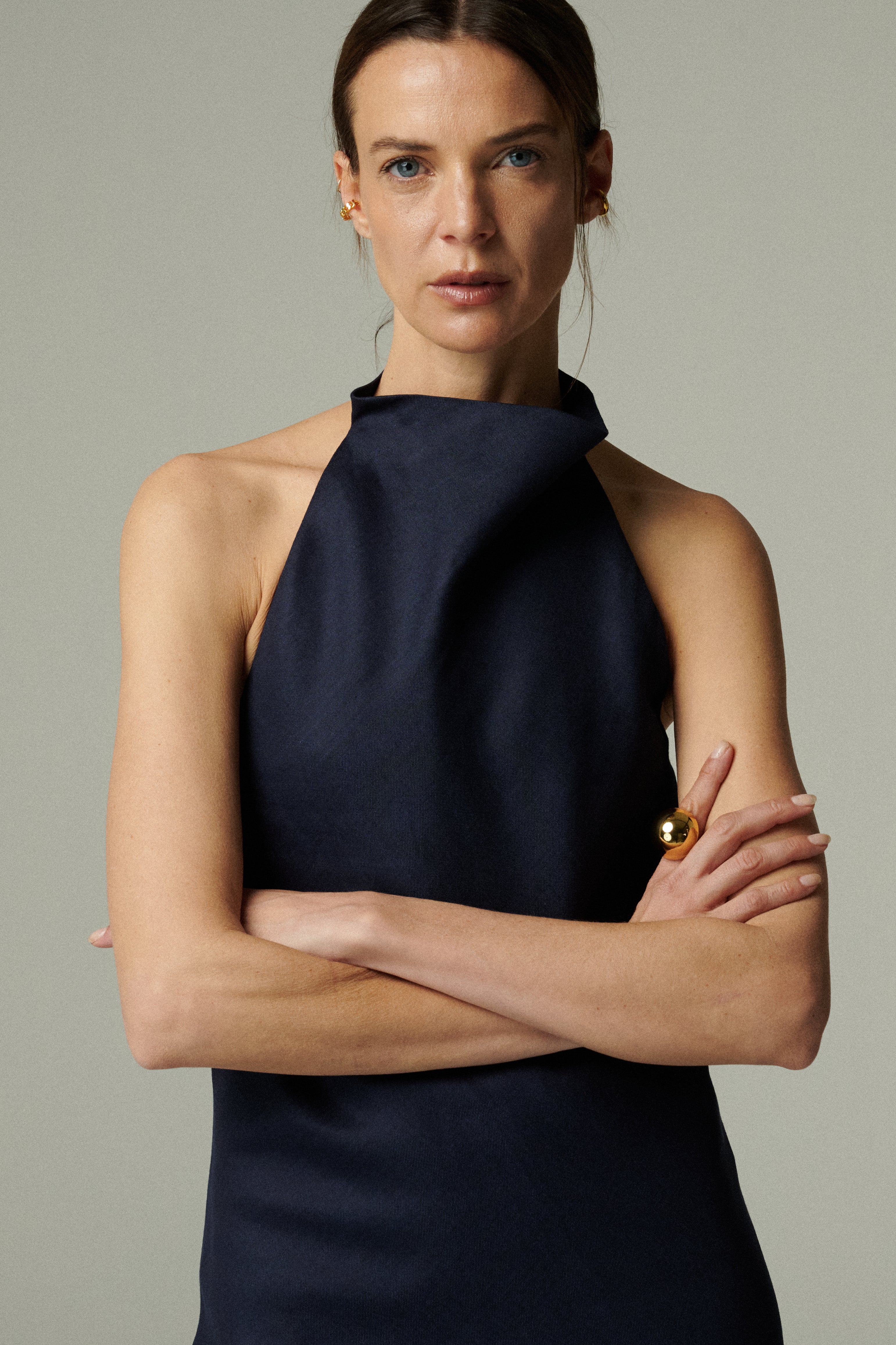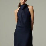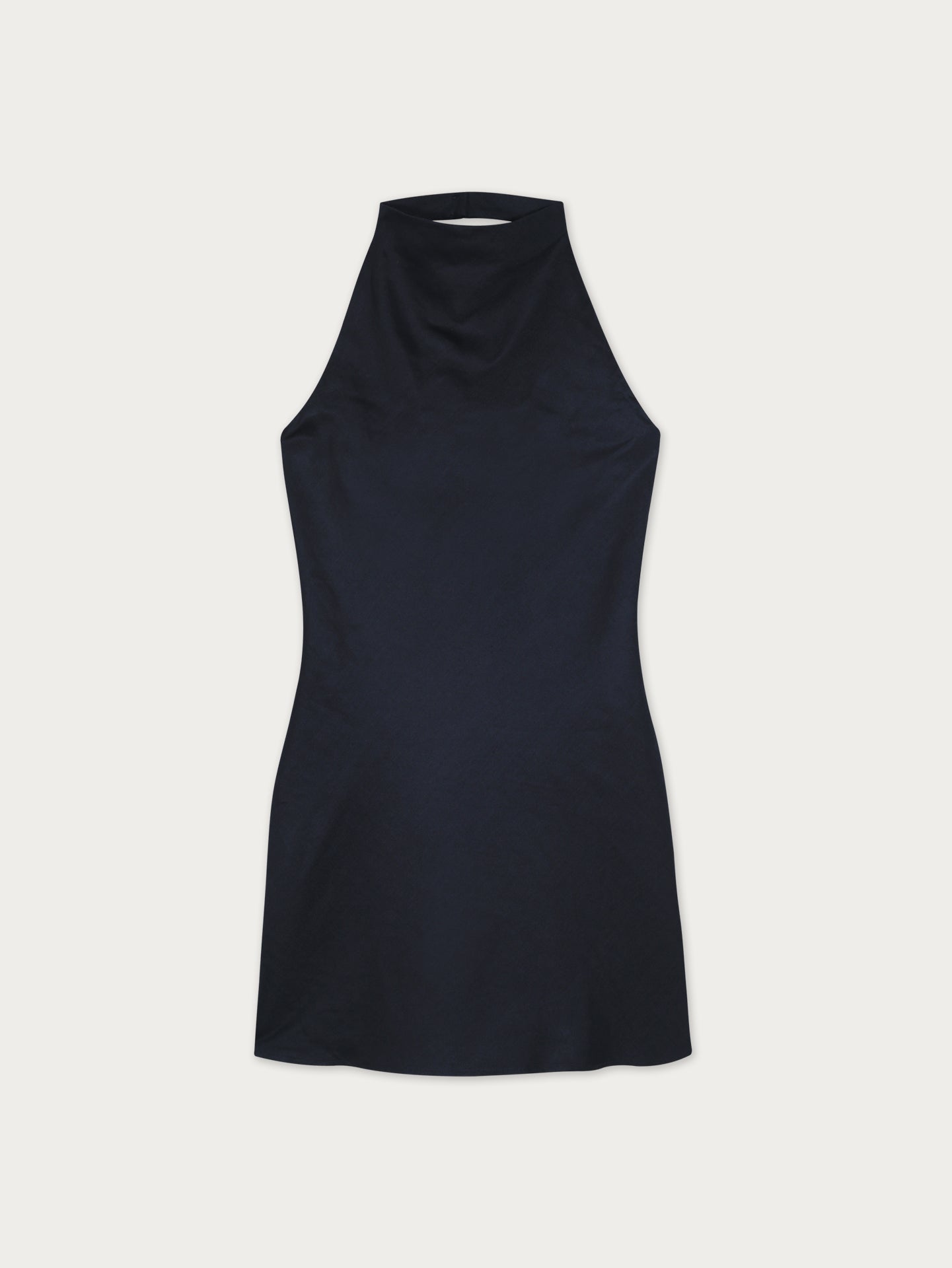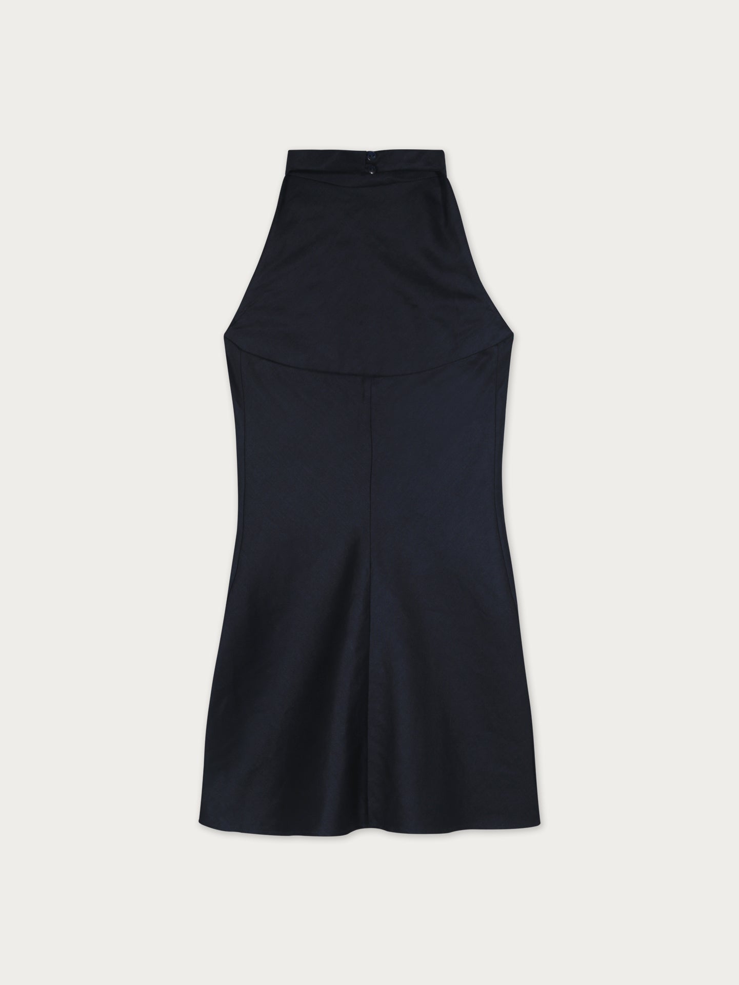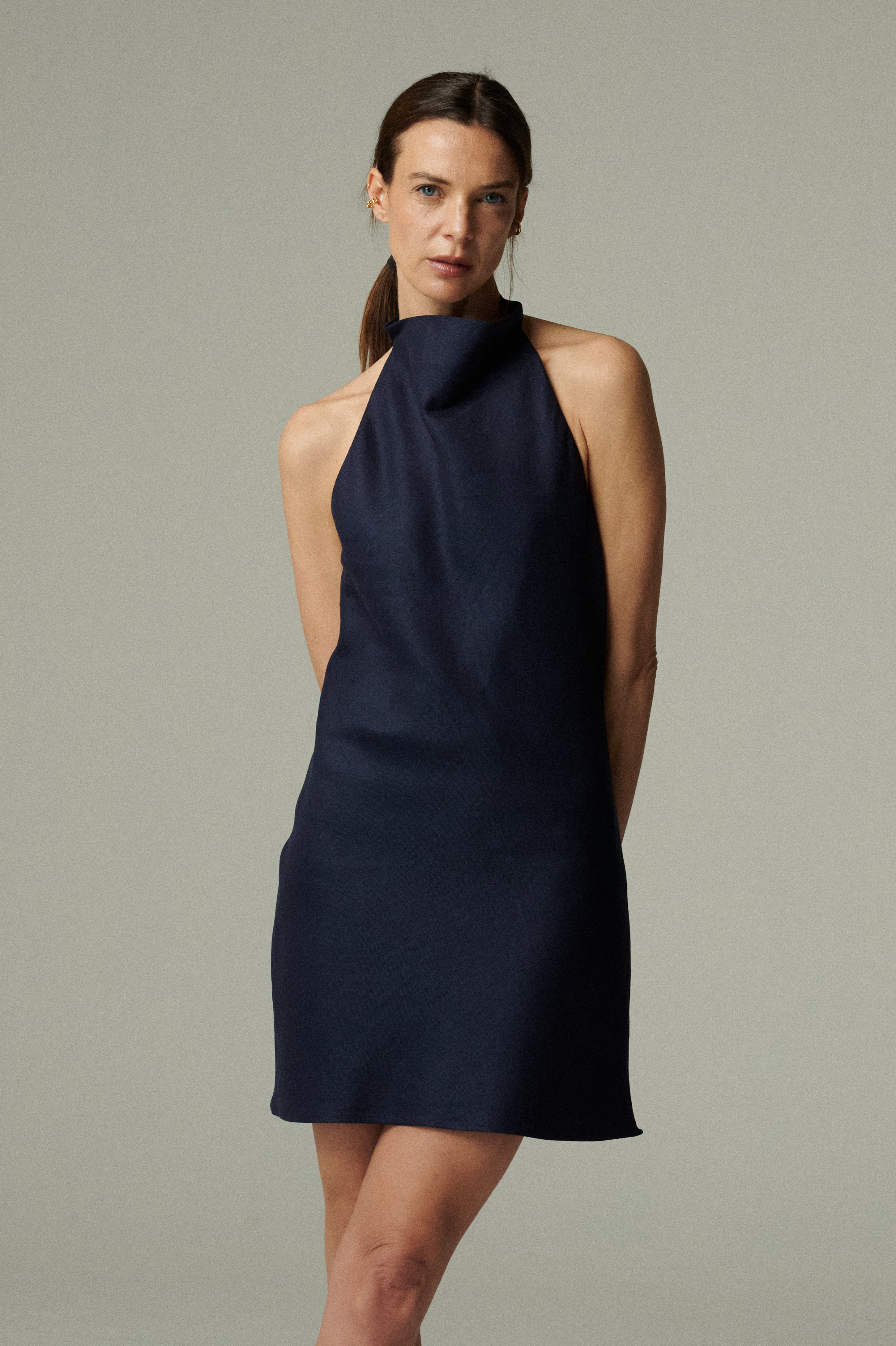 Vestido corto confeccionado en 100% lino azul Italiano, con escote halter y tirantes que realzan una silueta delicada y femenina. Su diseño de espalda baja aporta un aire sutilmente elegante, manteniendo la frescura y simpleza que lo convierten en un clásico atemporal. Una pieza versátil, ideal tanto para el día a día como para ocasiones más especiales.